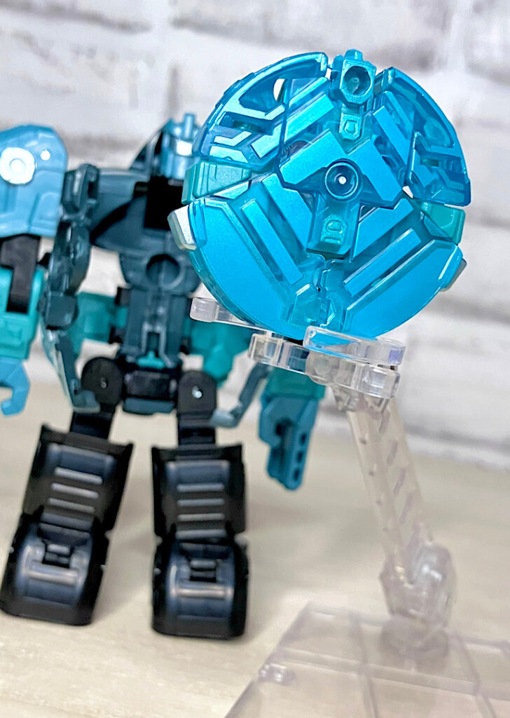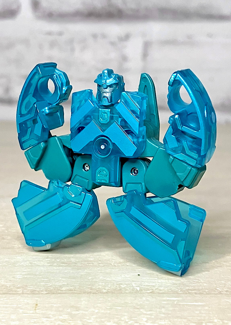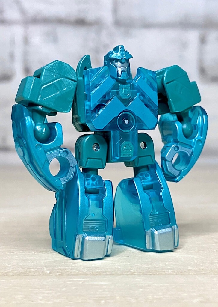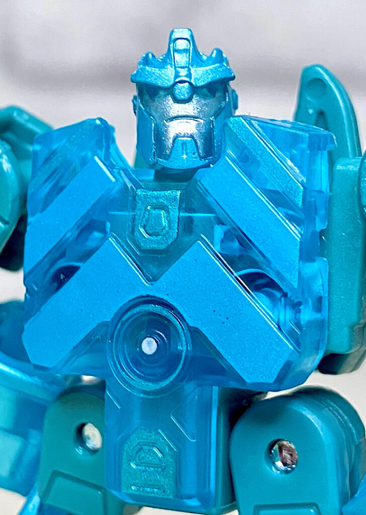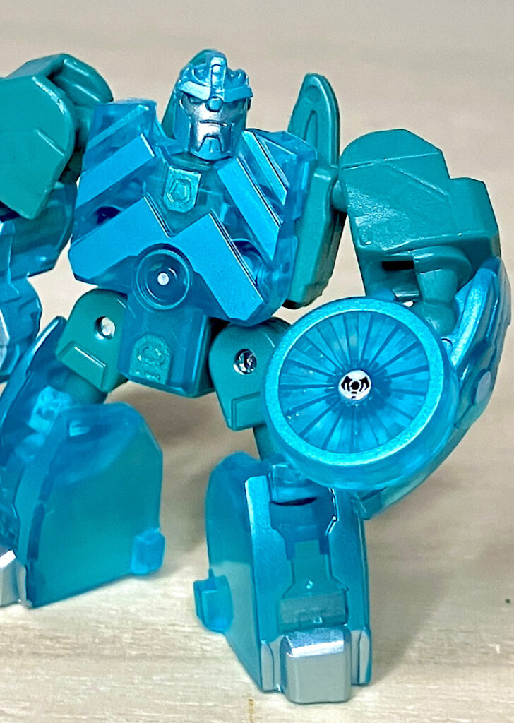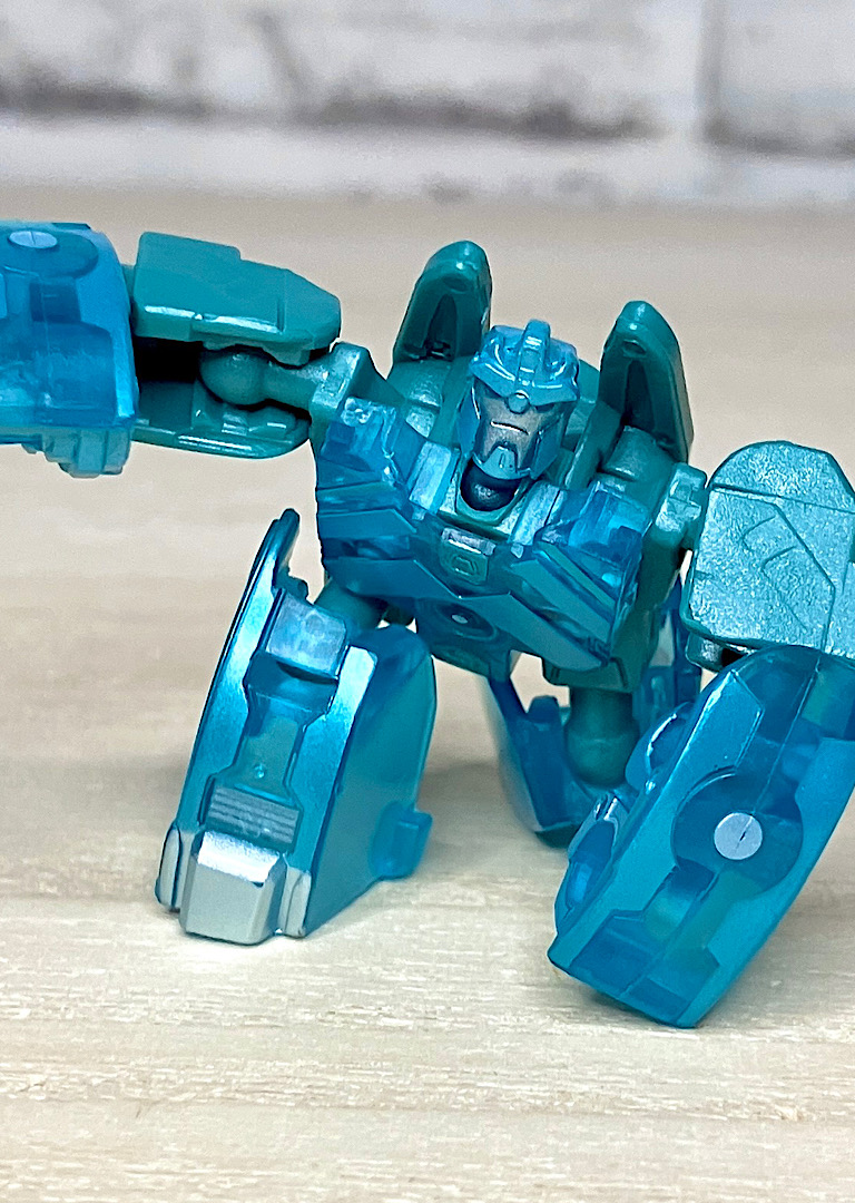 【ロボットモード】ミニコンの祖というだけあって小さなクリアカラーのボディが特徴。小さいながらもどっしりとした神々しい雰囲気です。ちなみに今回のデザインはアニメRID2015(アドベンチャー)に登場したバージョンを強く引き継いでいます。
