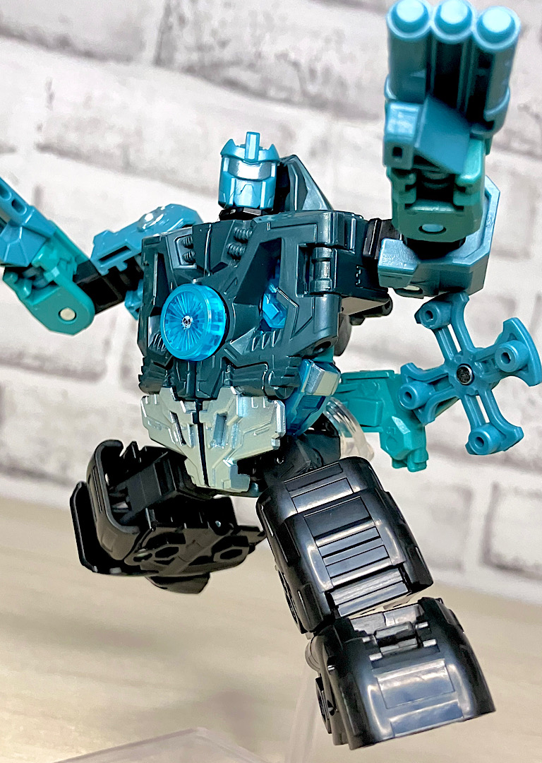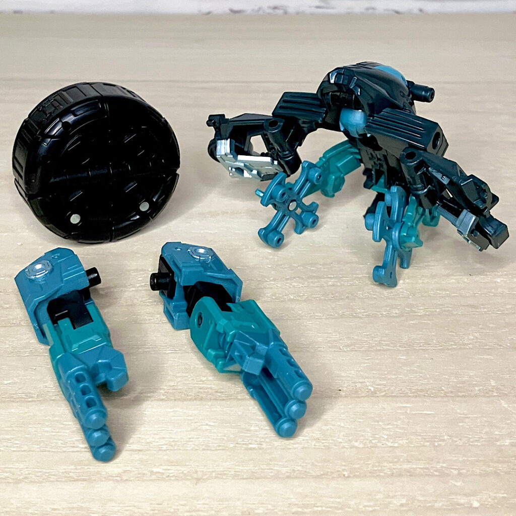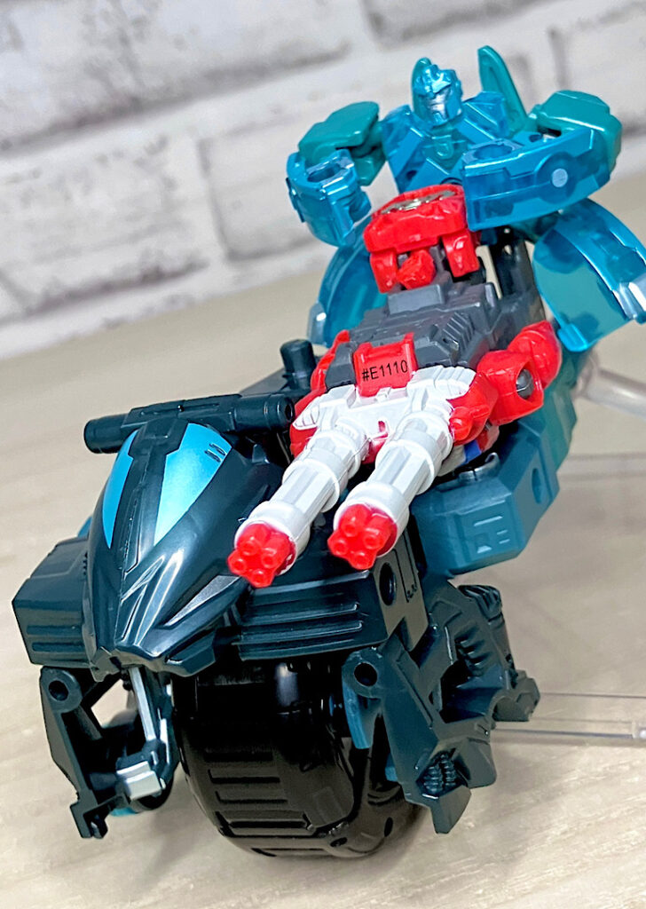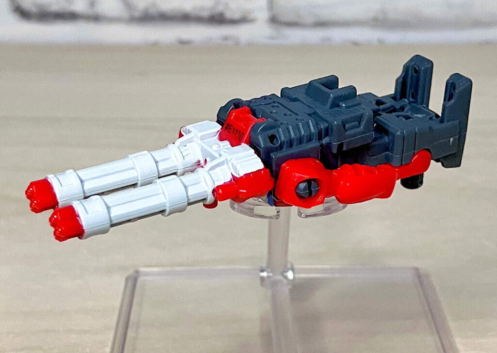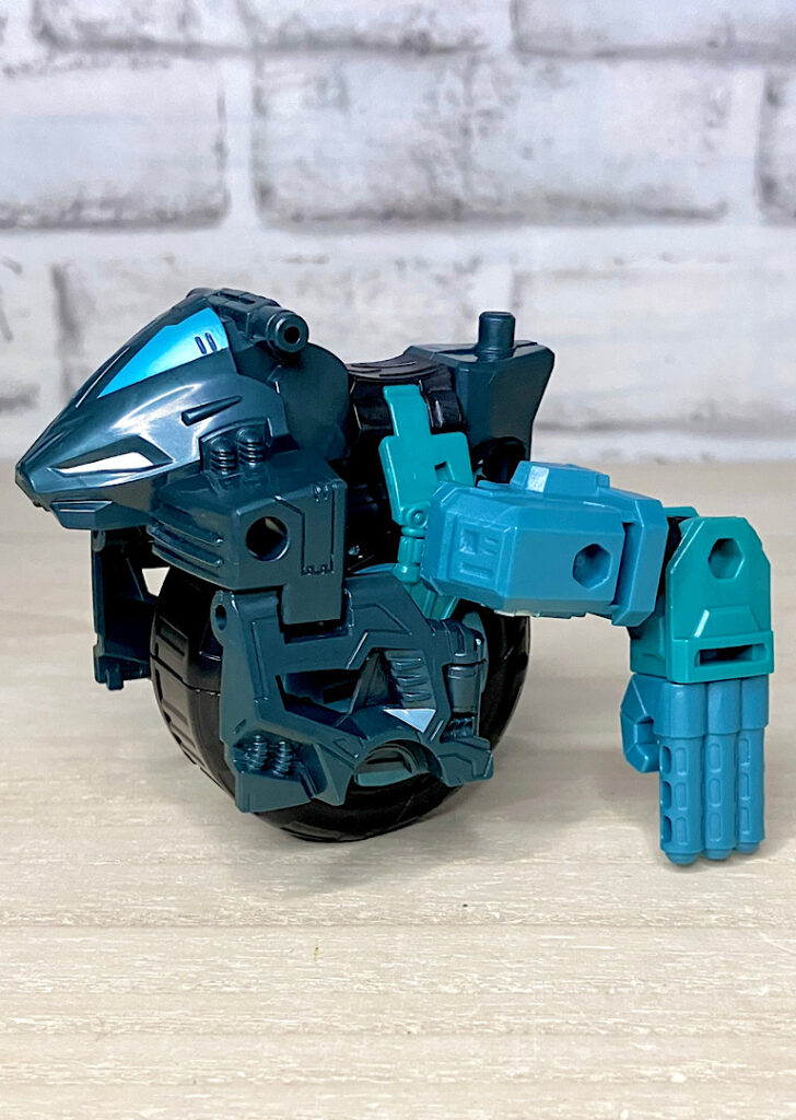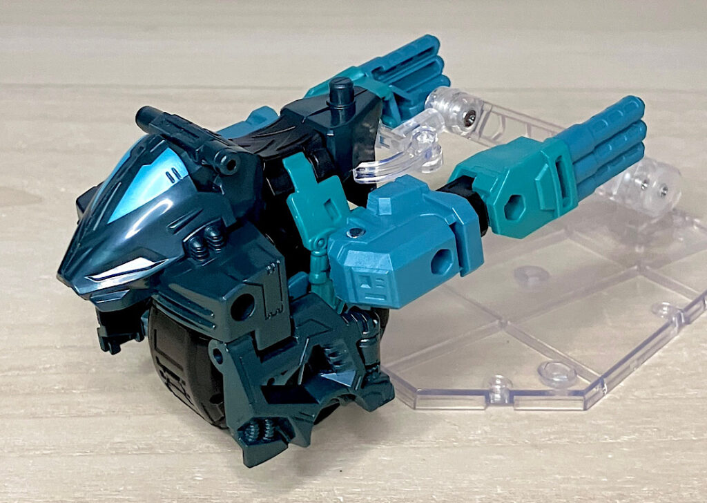 ちなみにバラバラになるボディにはそれぞれ5ミリペグが付いており、他のTFにくっつけることが可能。ちょっとしたウェポナイザーとして遊べます。特にまん丸のタイヤパーツが面白いかも。