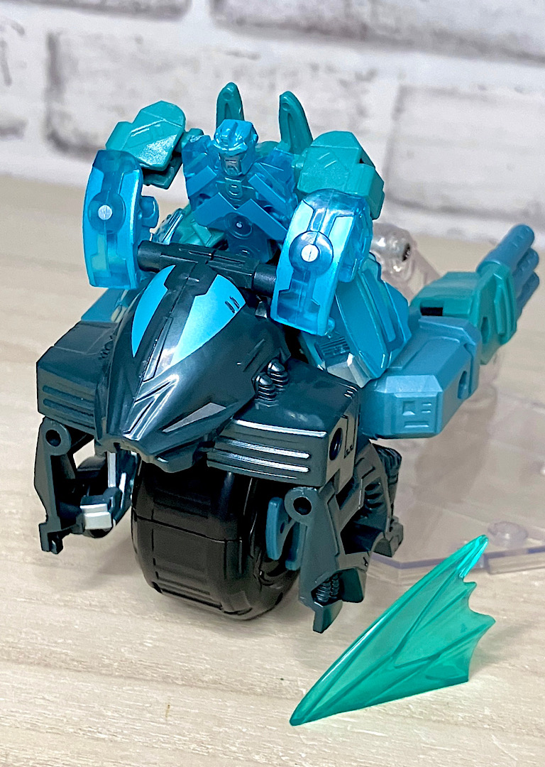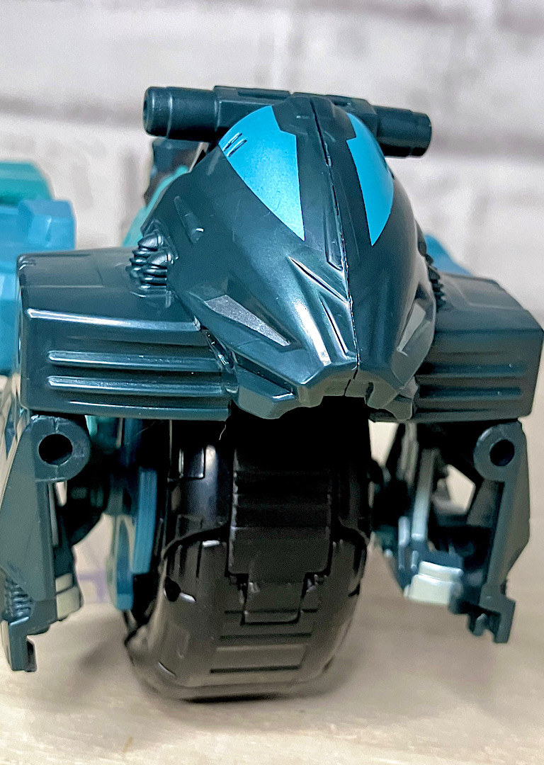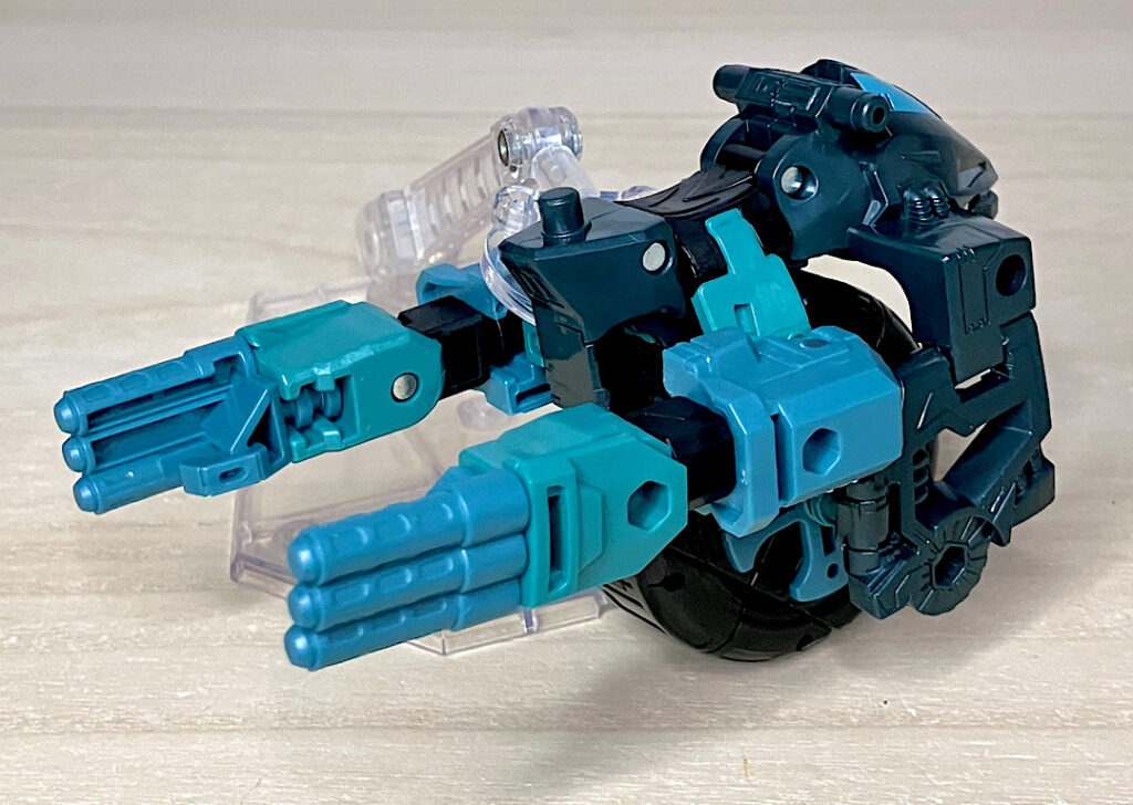 【ビークルモード】さてここから付属?のエイペックスアーマーにいきましょう。まずビークルモードですが、何やら一輪バイク的なビークルです。タイヤはもちろん回るので、支えがないとそのまま直立させることはできません。