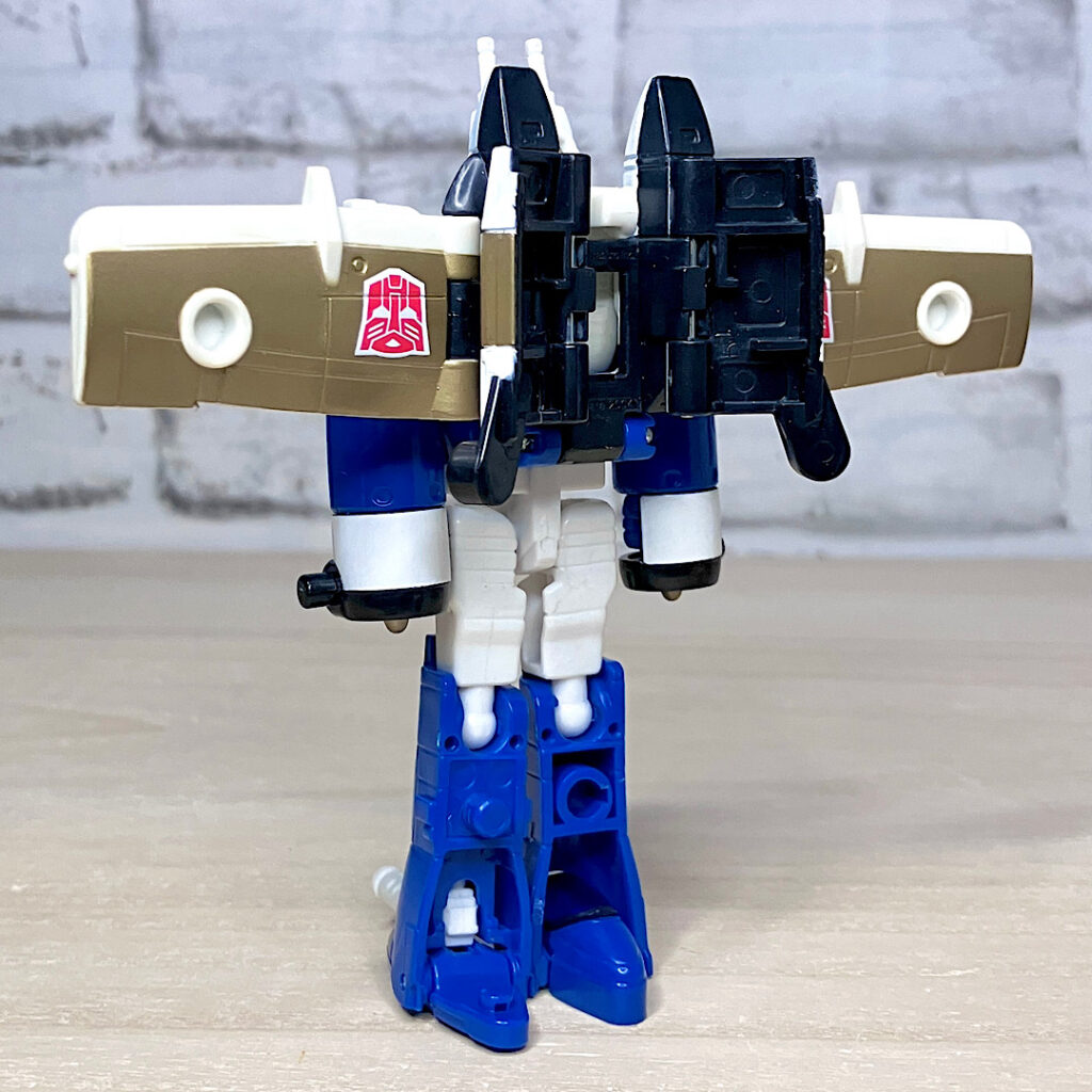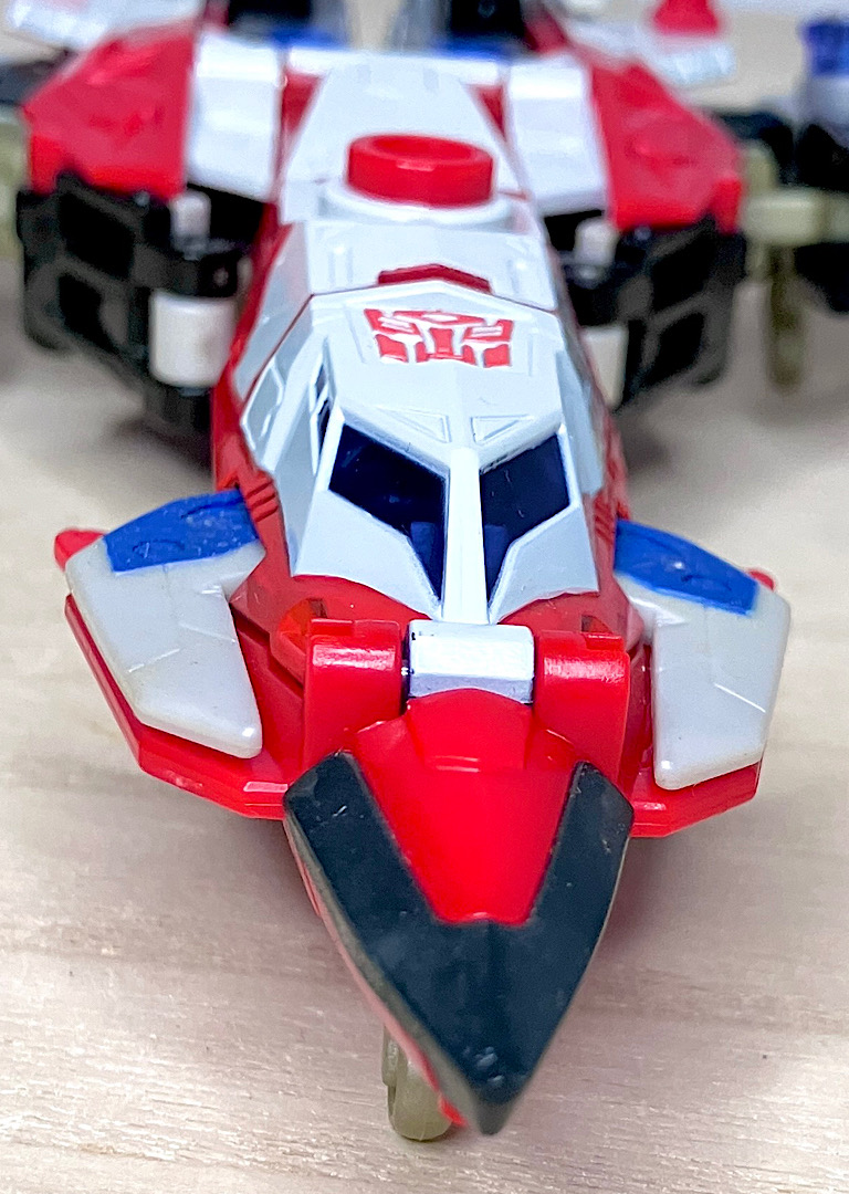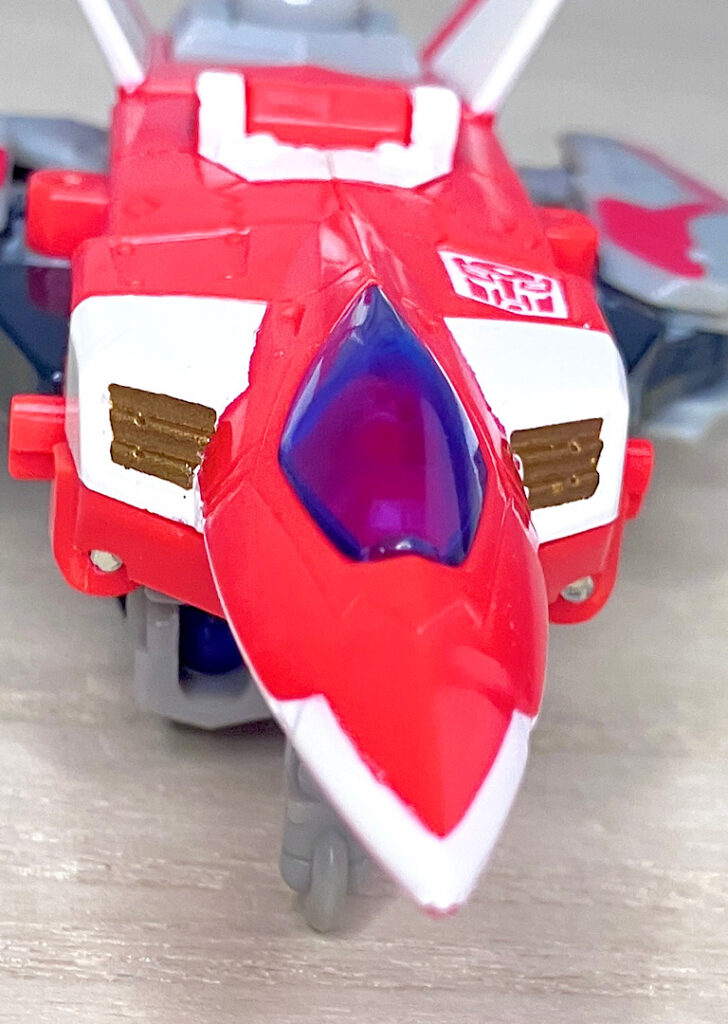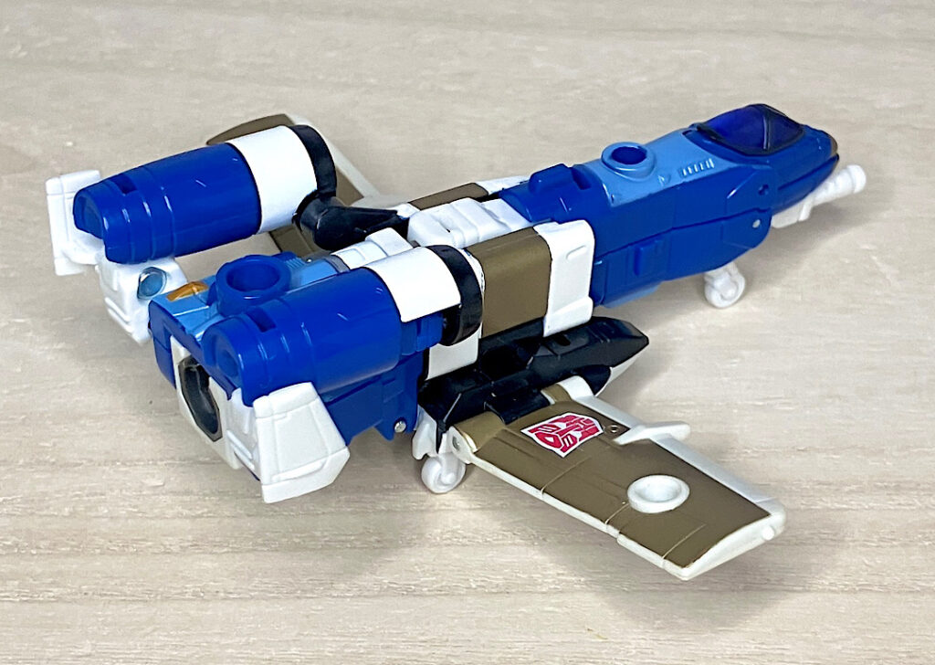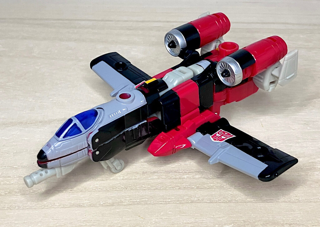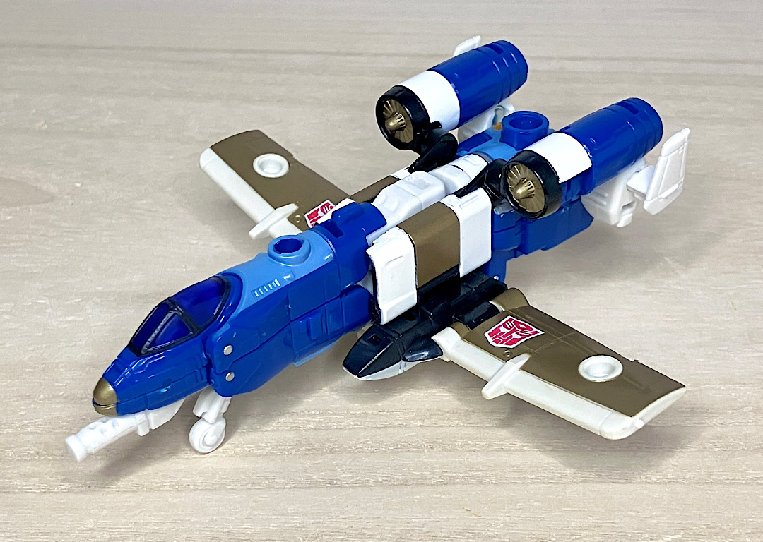 【ビークルモード】A-10サンダーボルト風のジェット機に変形。カラーリングのせいかどこかレトロで牧歌的な雰囲気があり、エアライダーたちとは印象が対照的です。
