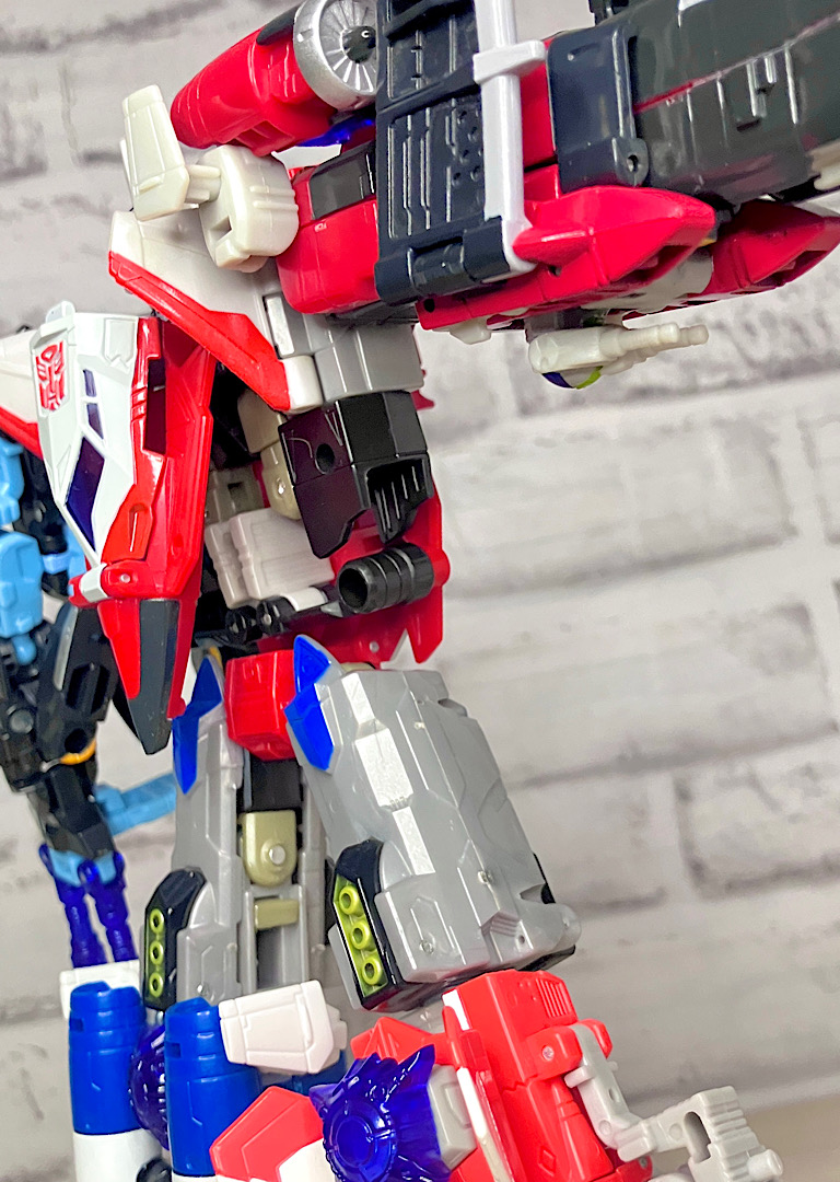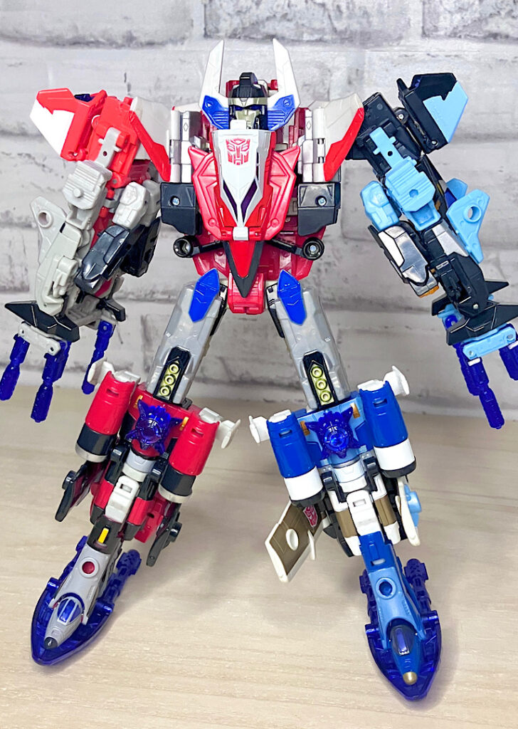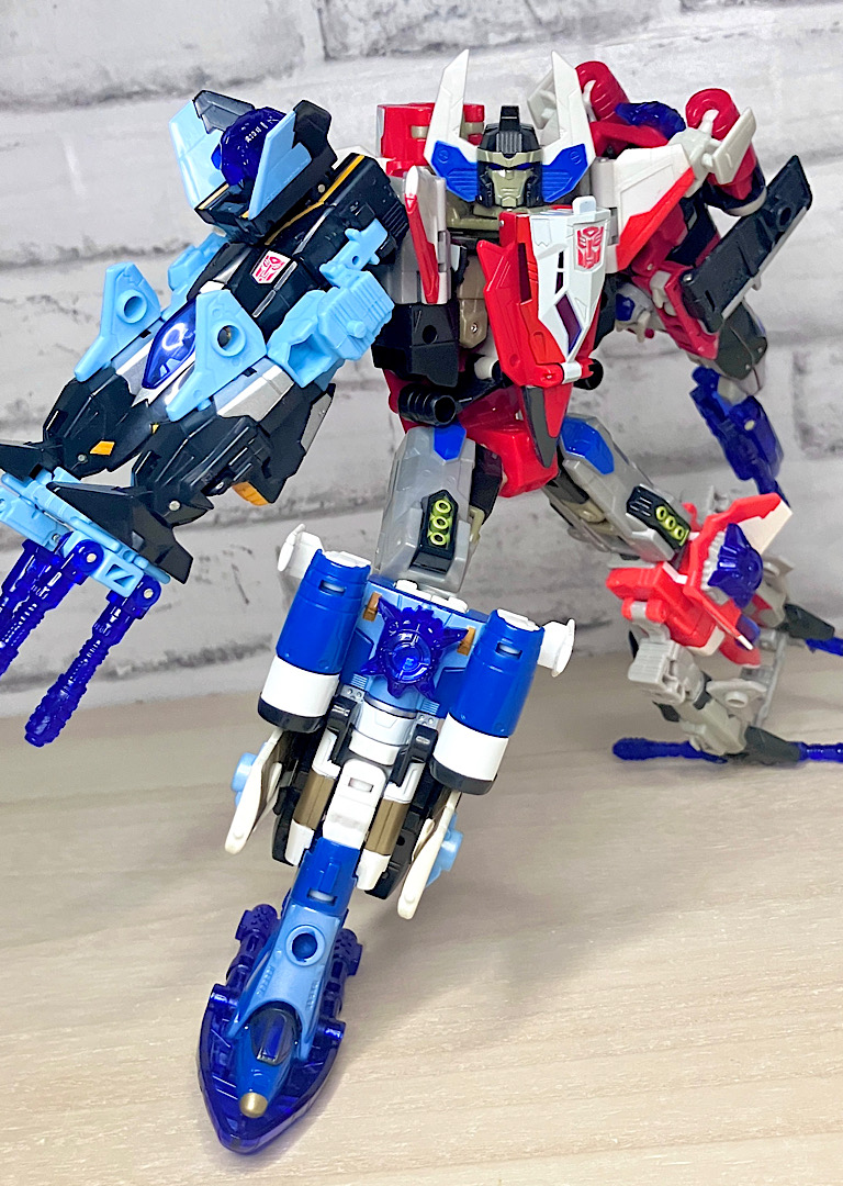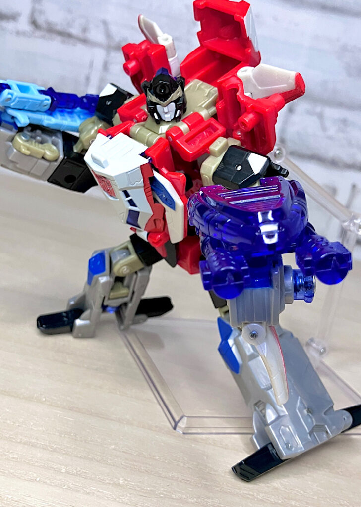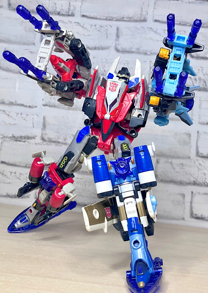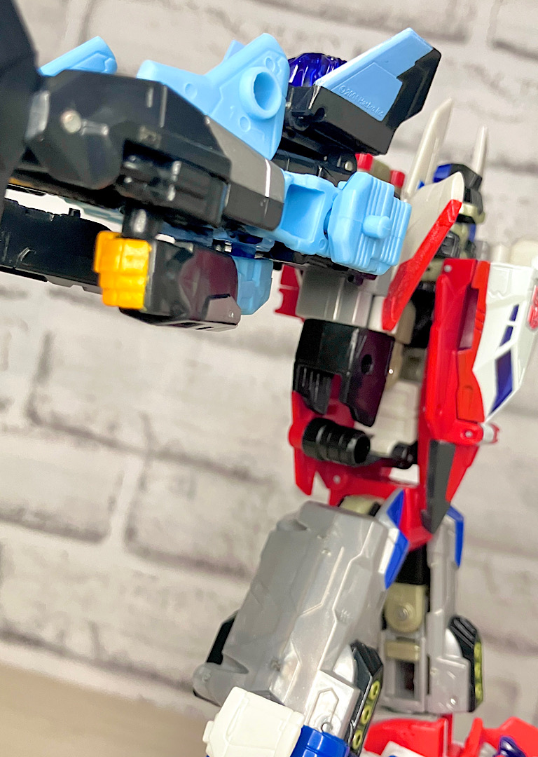 【合体モード】腕または脚に変形。エネルゴンウェポンが拳やゲタパーツになるのですが、実はその付け方が異なるだけで本体は全く同じ形状です。