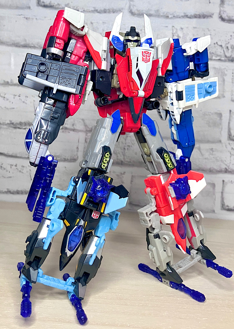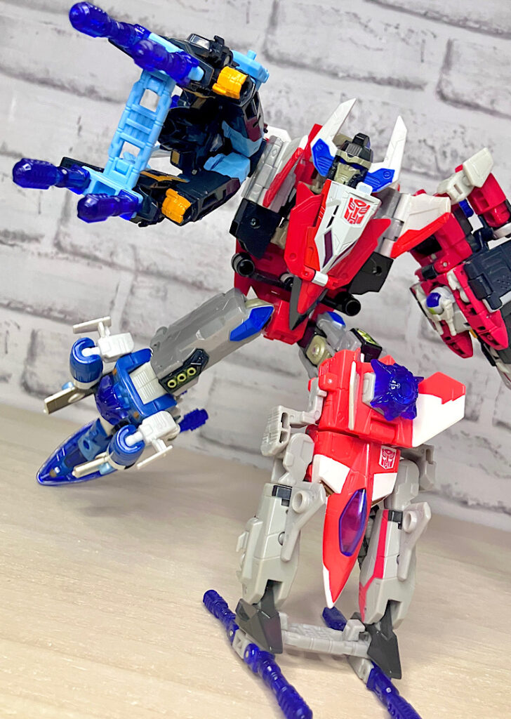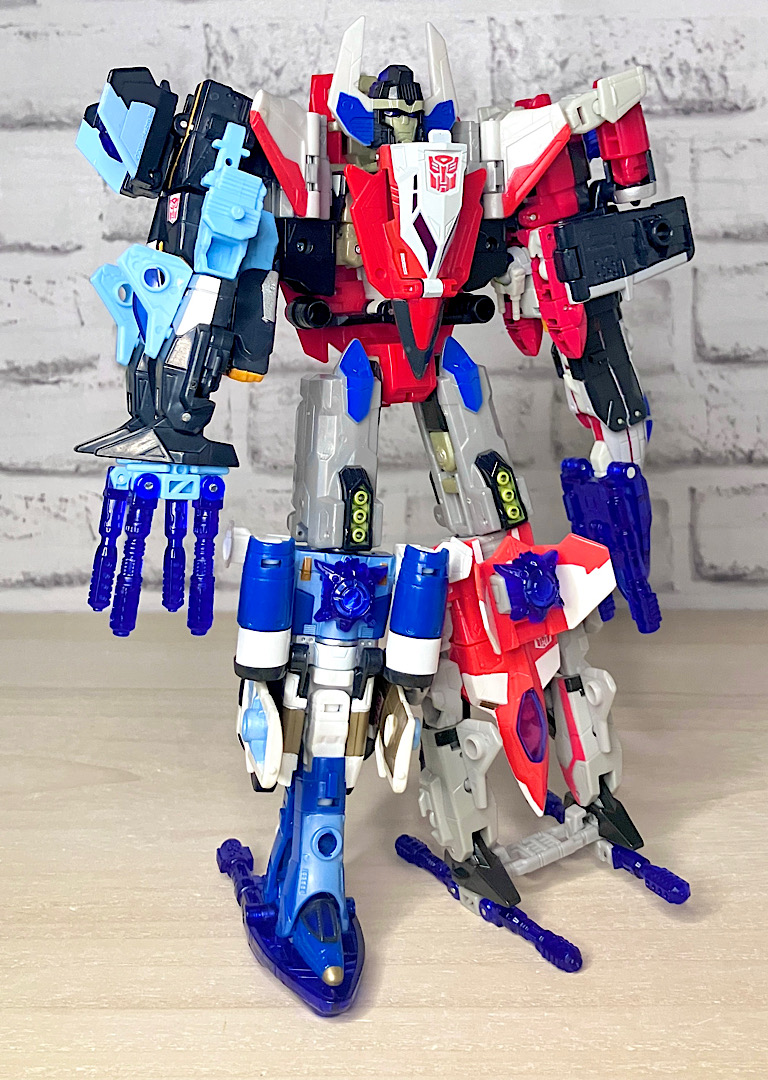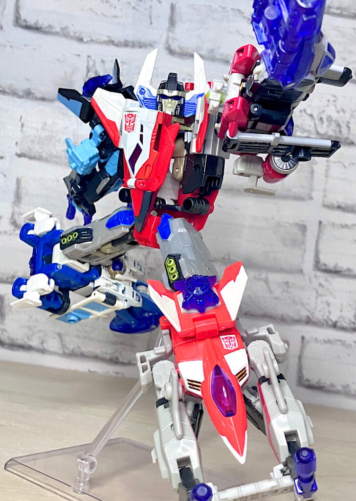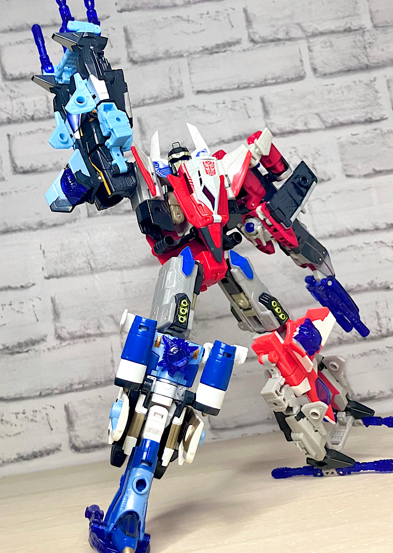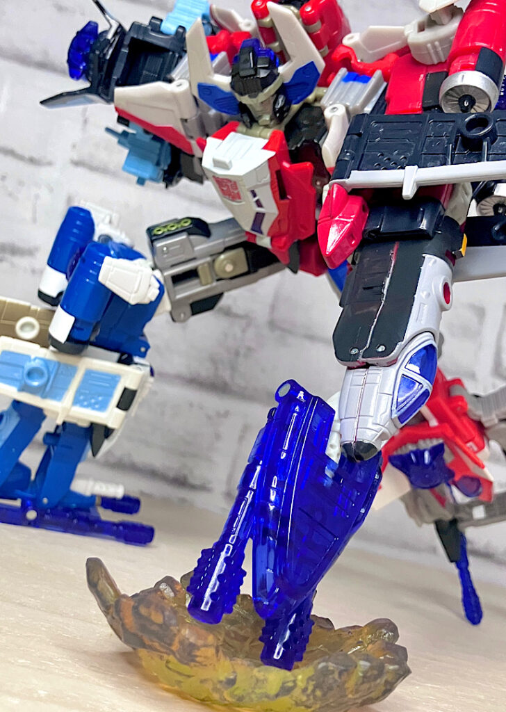 【合体モード】腕または脚に変形。エネルゴンウェポンが拳やゲタパーツになるのですが、実はその付け方が異なるだけで本体は全く同じ形状です。