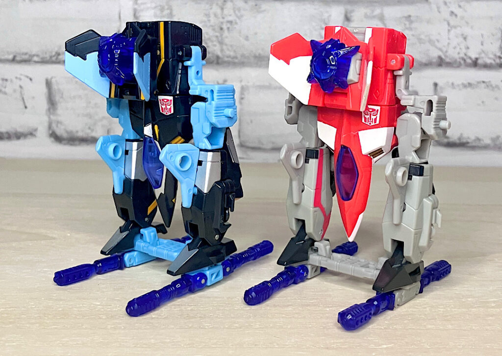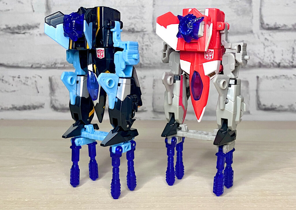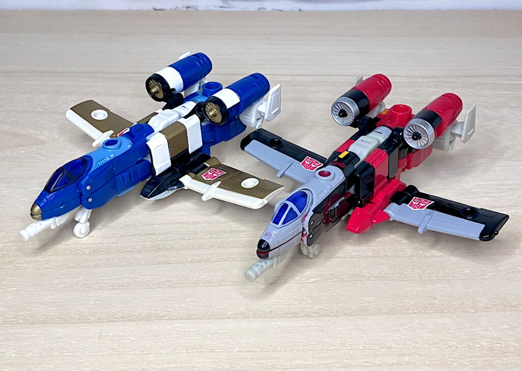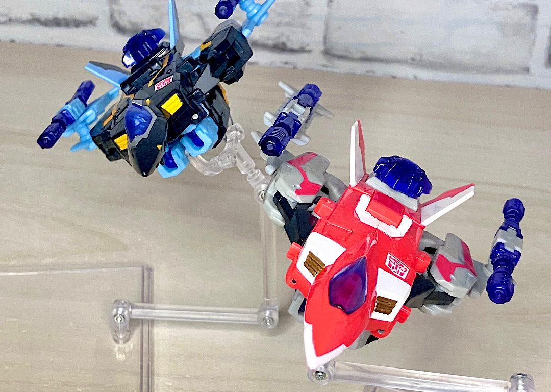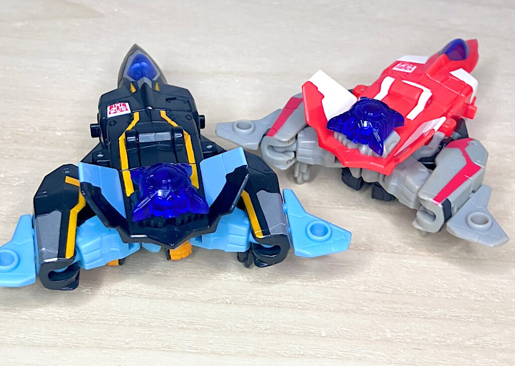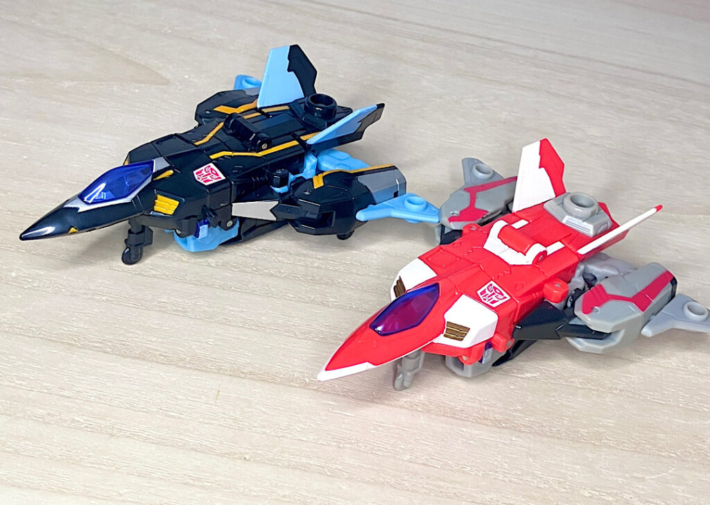 【ロボットモード】同型の2体で、黒がエアライダー、赤がファイヤーボルトです。航空機モチーフなのにウイング類がほとんど目立たずスッキリしたシルエットなのが面白い。