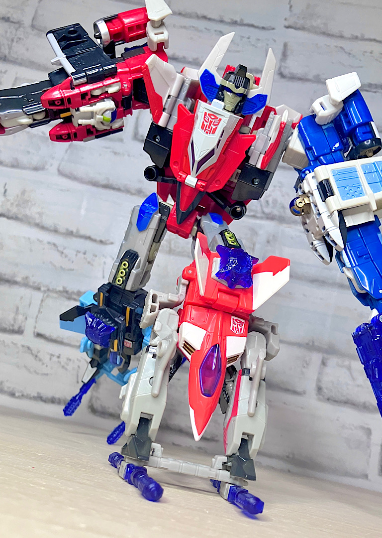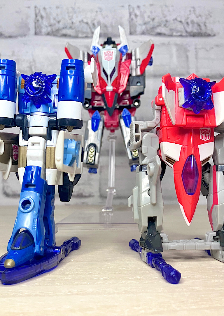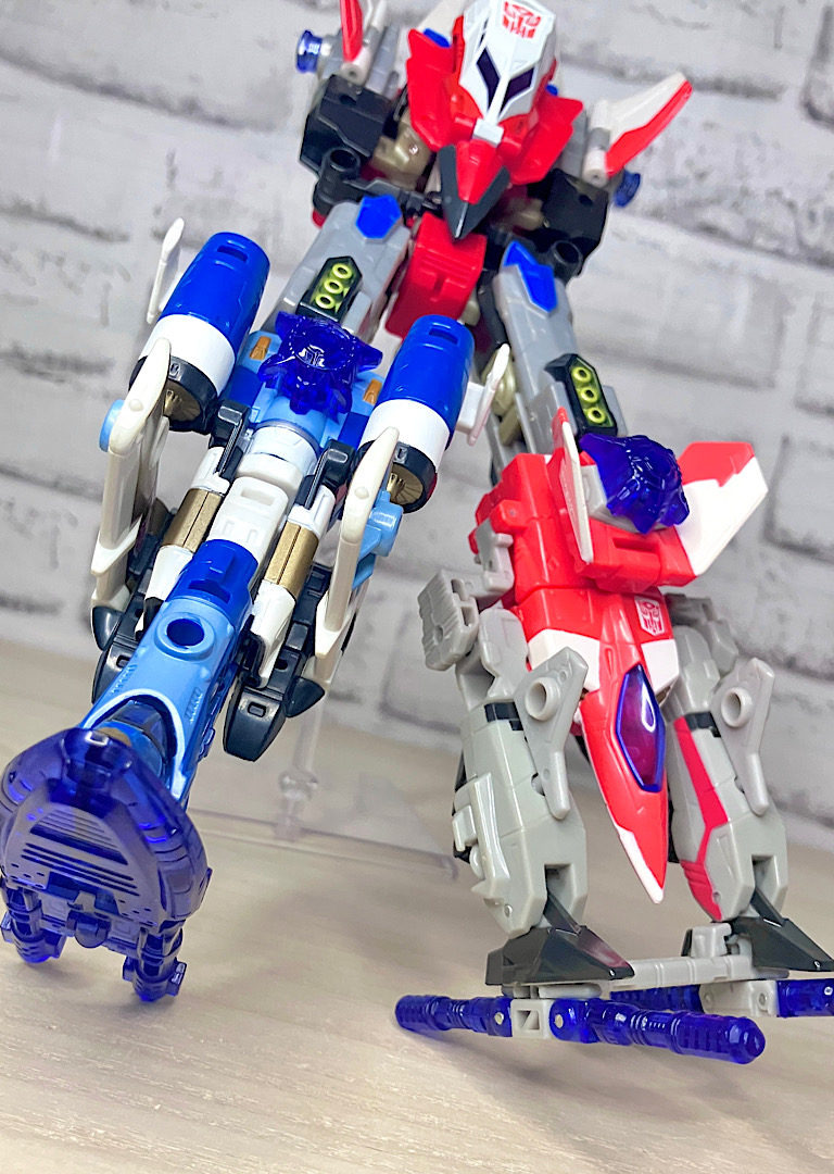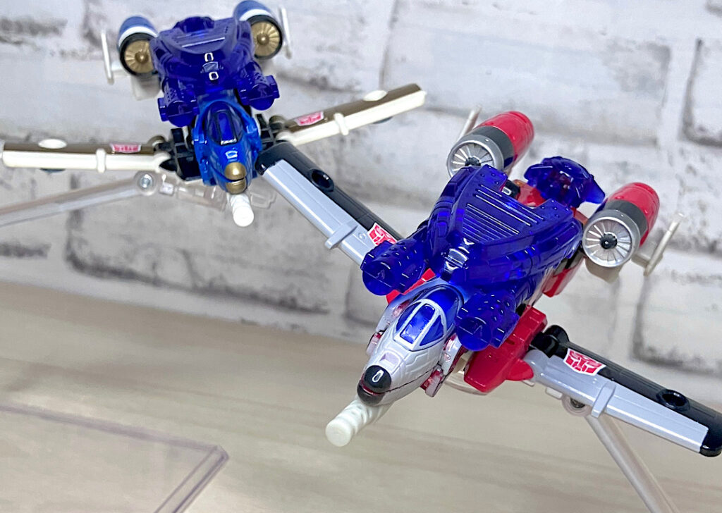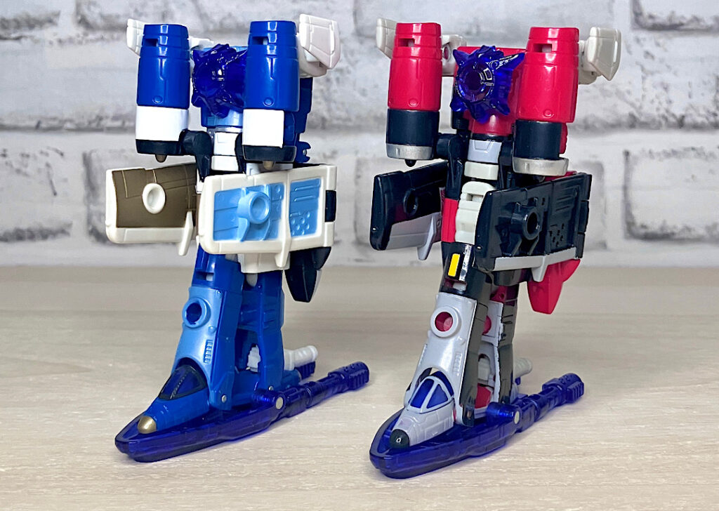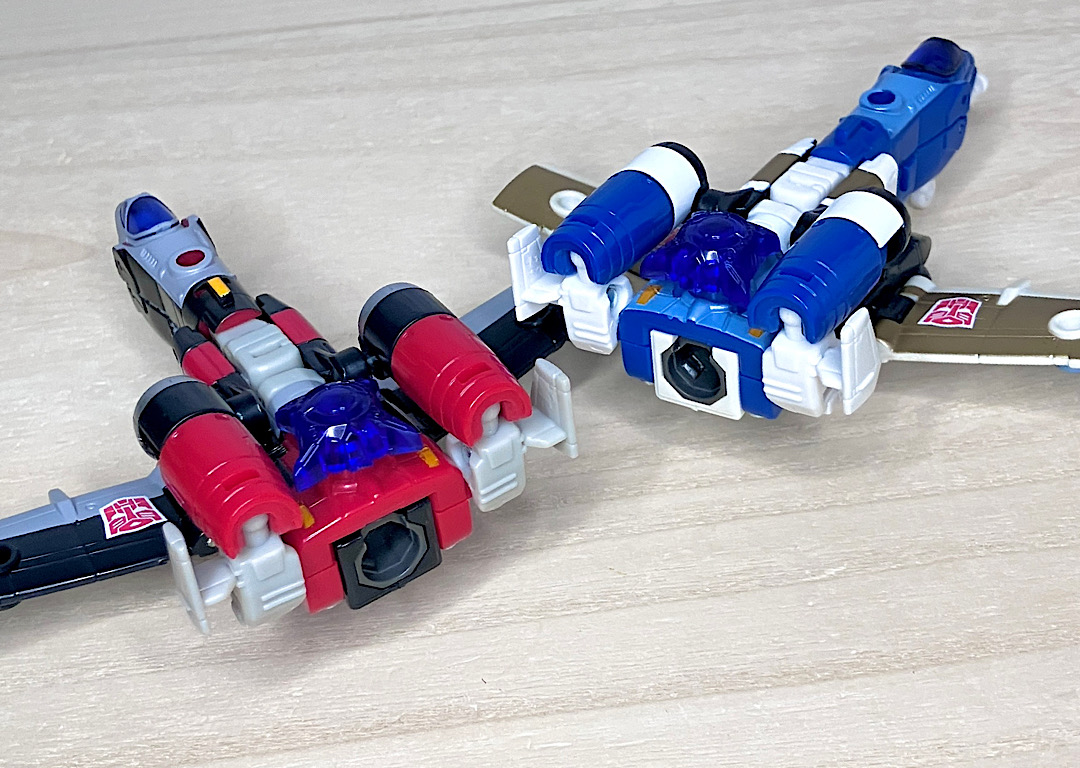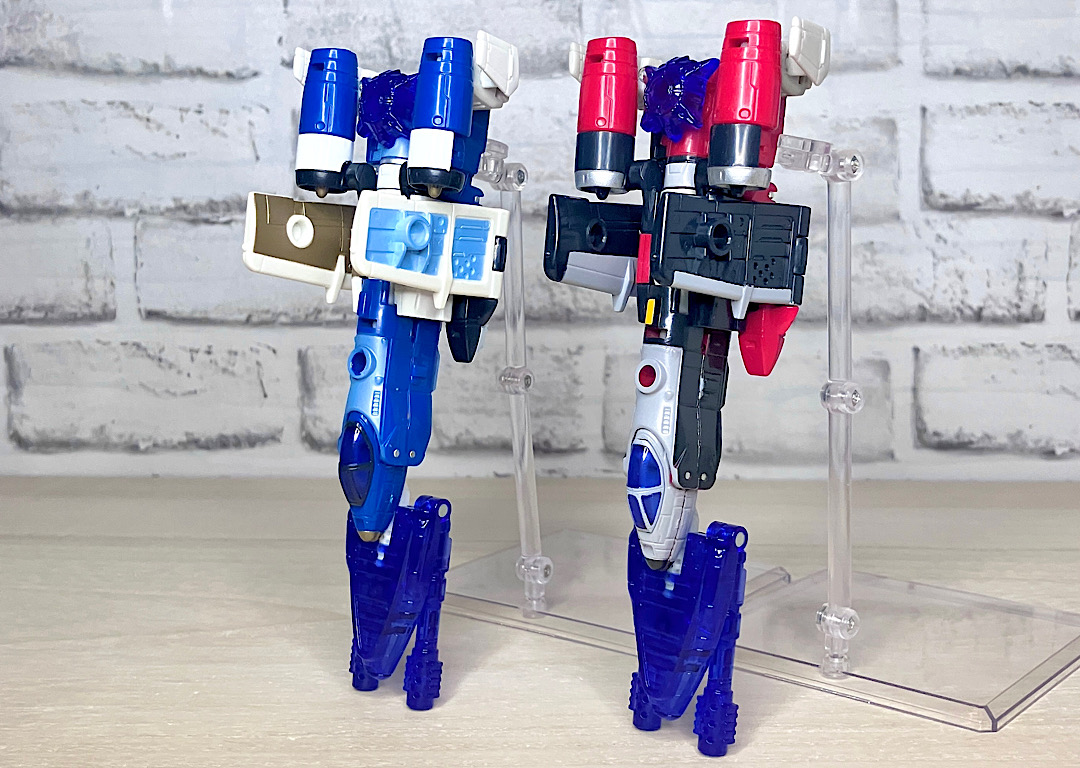 【ロボットモード】やはり同型の2体で、赤い方がスリング、青がスカイダイブ。こちらは背中に大きな2枚羽を背負ったいかにもな航空機キャラです。スフィンクスのようなミステリアスな頭部(特にスカイダイブは金色でそれが際立っています)、円筒形を主軸にしたデザインなどいつものTFとは一線を画す雰囲気。