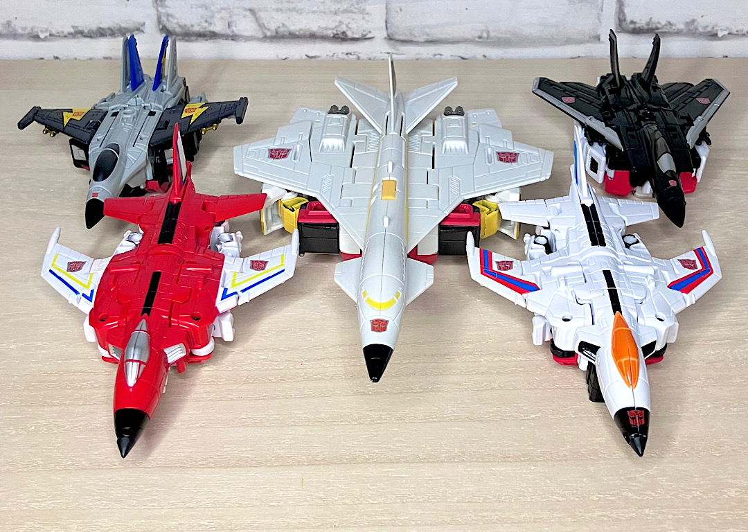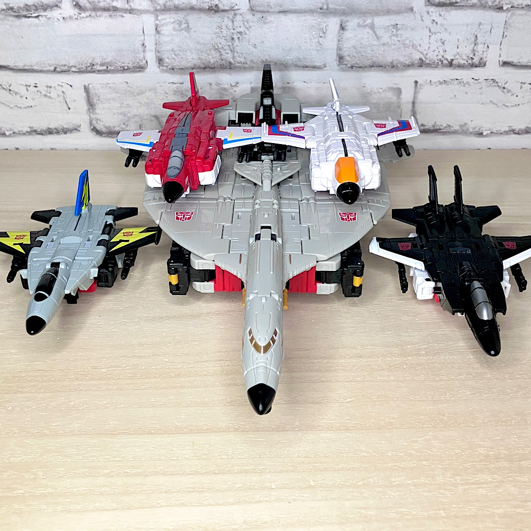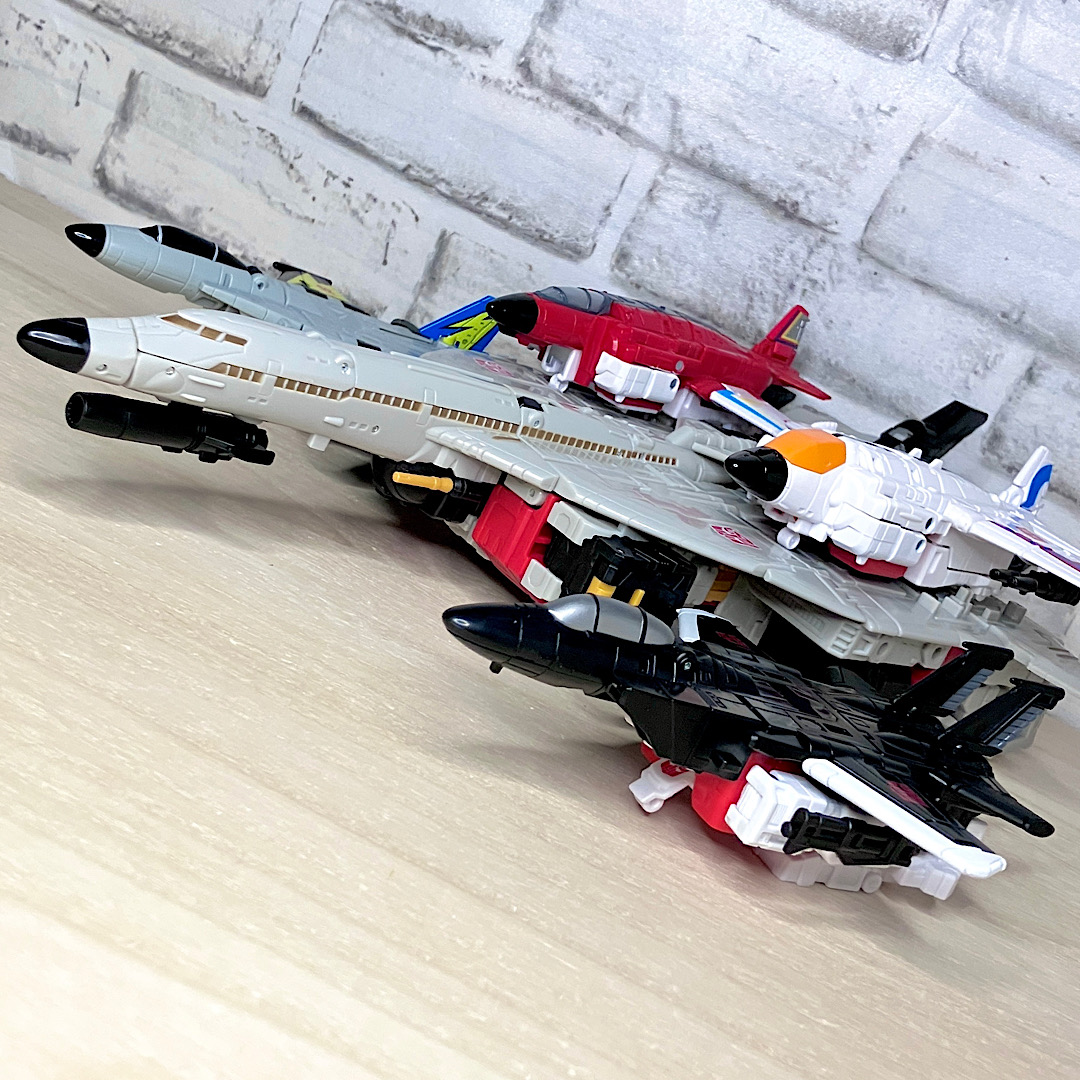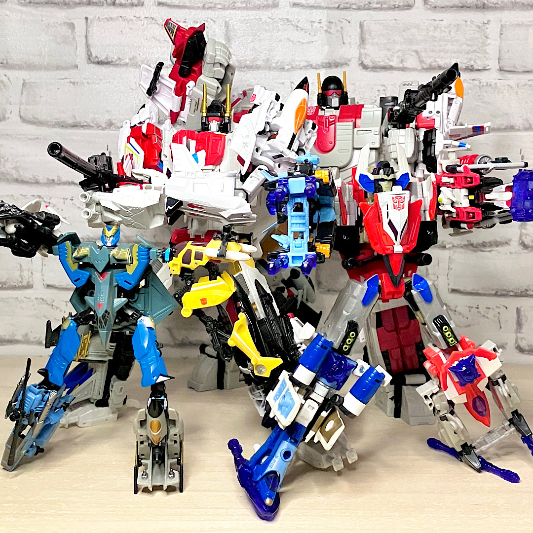 まずはAOTPエアリアルボット大集合。AOTPの目玉企画のひとつで、レガシースタンティコンとほぼ同じフォーマットでコンバイナーウォーズ以来の5体合体に再挑戦。G1アニメーションを多分に意識したちょっと野暮ったいスタイルが最大の特徴です。