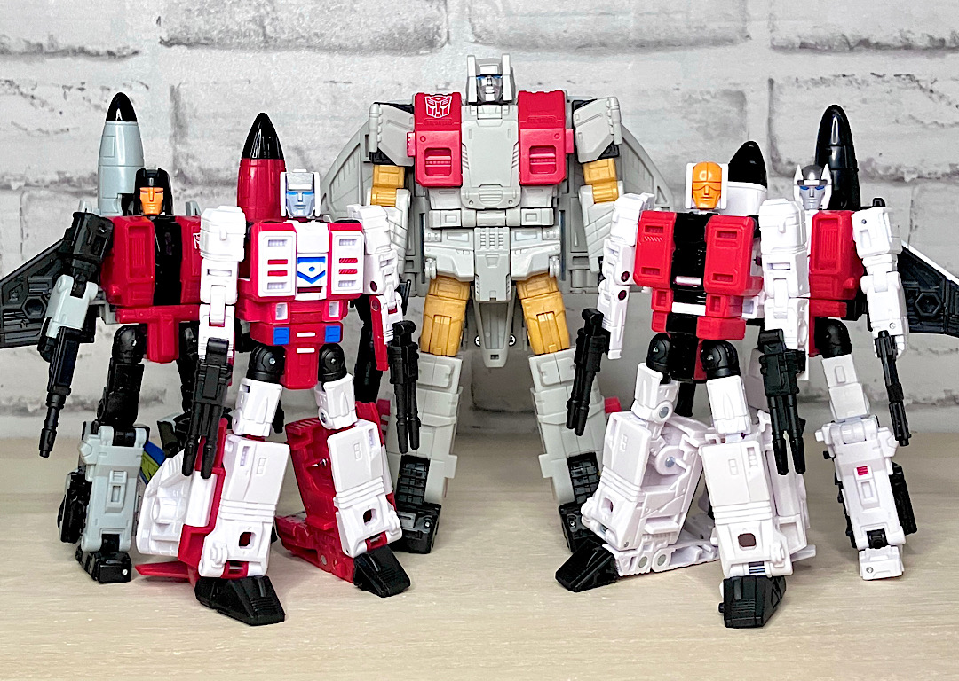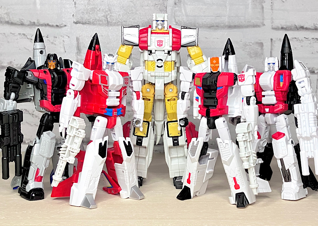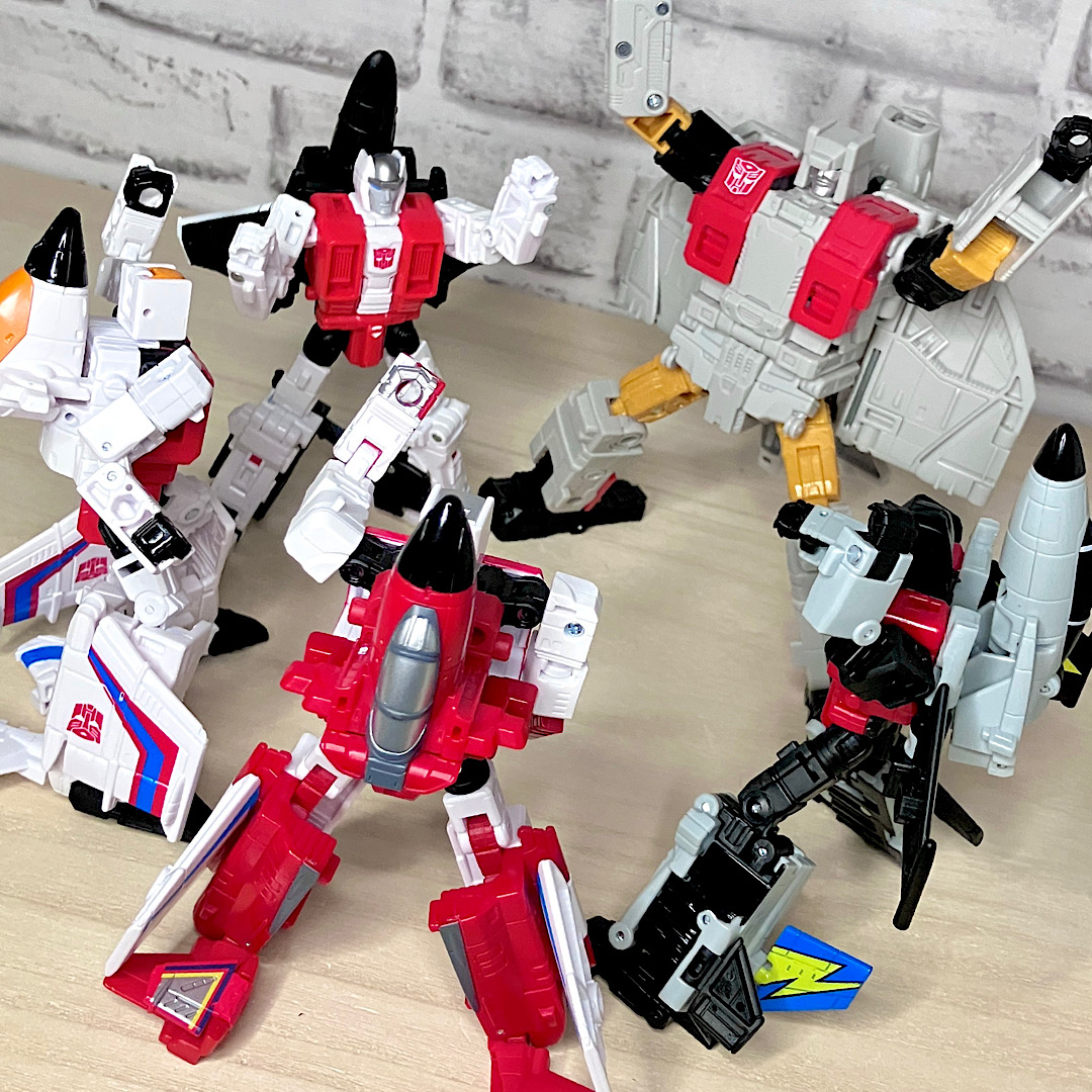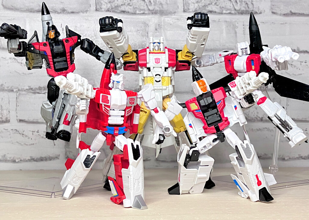まずはAOTPエアリアルボット大集合。AOTPの目玉企画のひとつで、レガシースタンティコンとほぼ同じフォーマットでコンバイナーウォーズ以来の5体合体に再挑戦。G1アニメーションを多分に意識したちょっと野暮ったいスタイルが最大の特徴です。