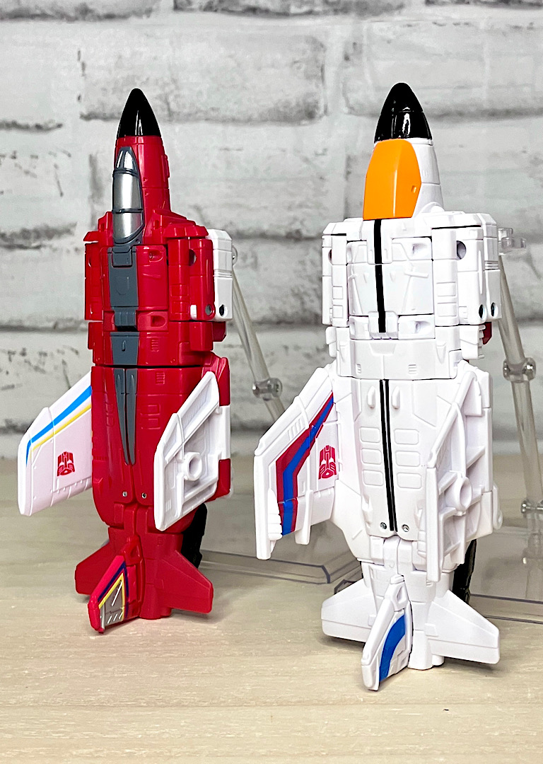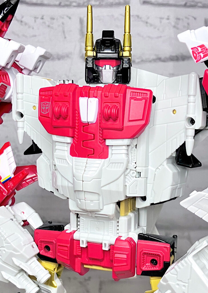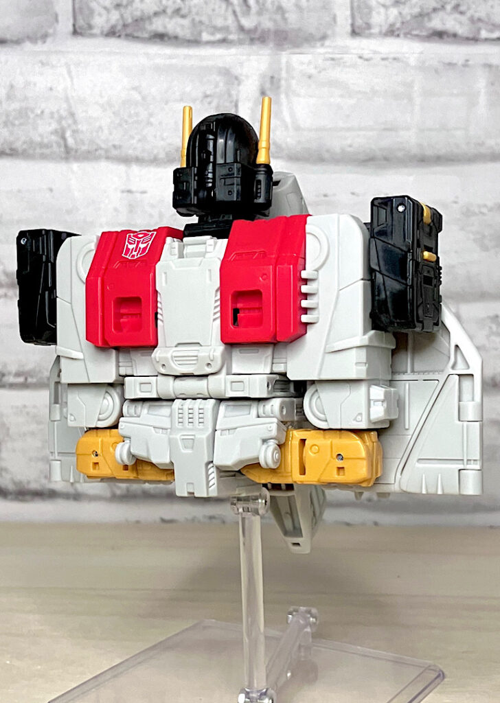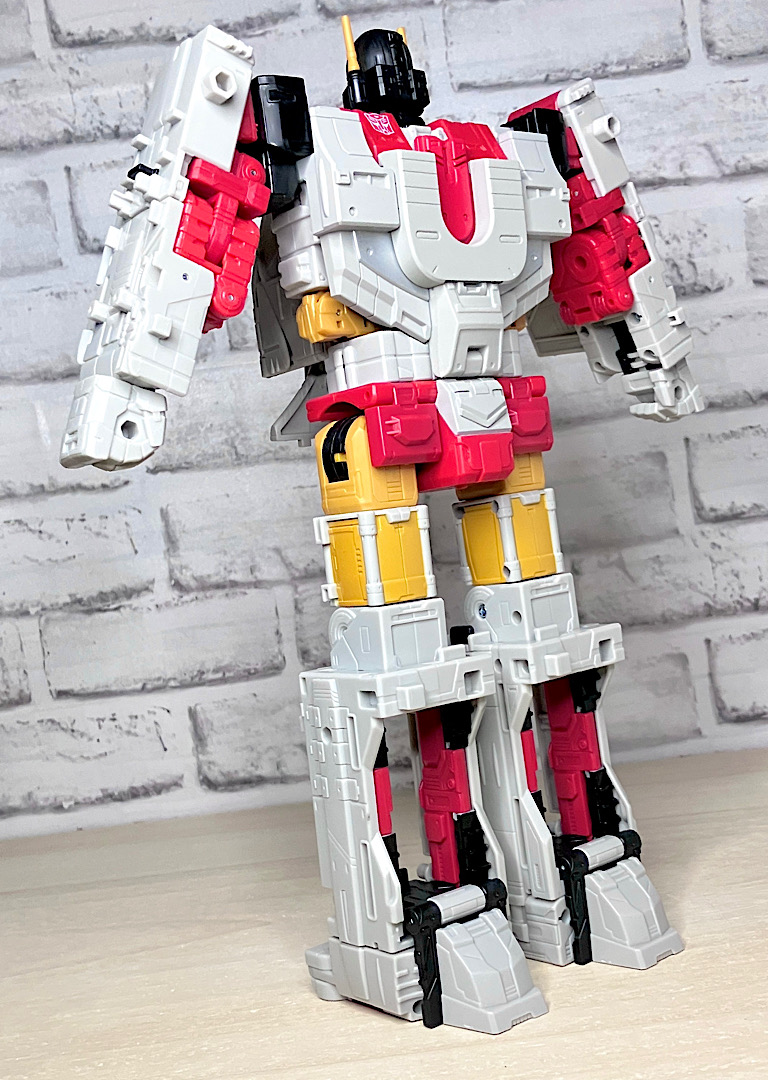 【フロント&リア】というわけでAOTPスペリオン完成です。新たにフレーム合体方式になったので、シルエットが自然なカタチに。カラーリングも前から見ると脚のスカイダイブ・エアレイドが見えないため統一感があります。