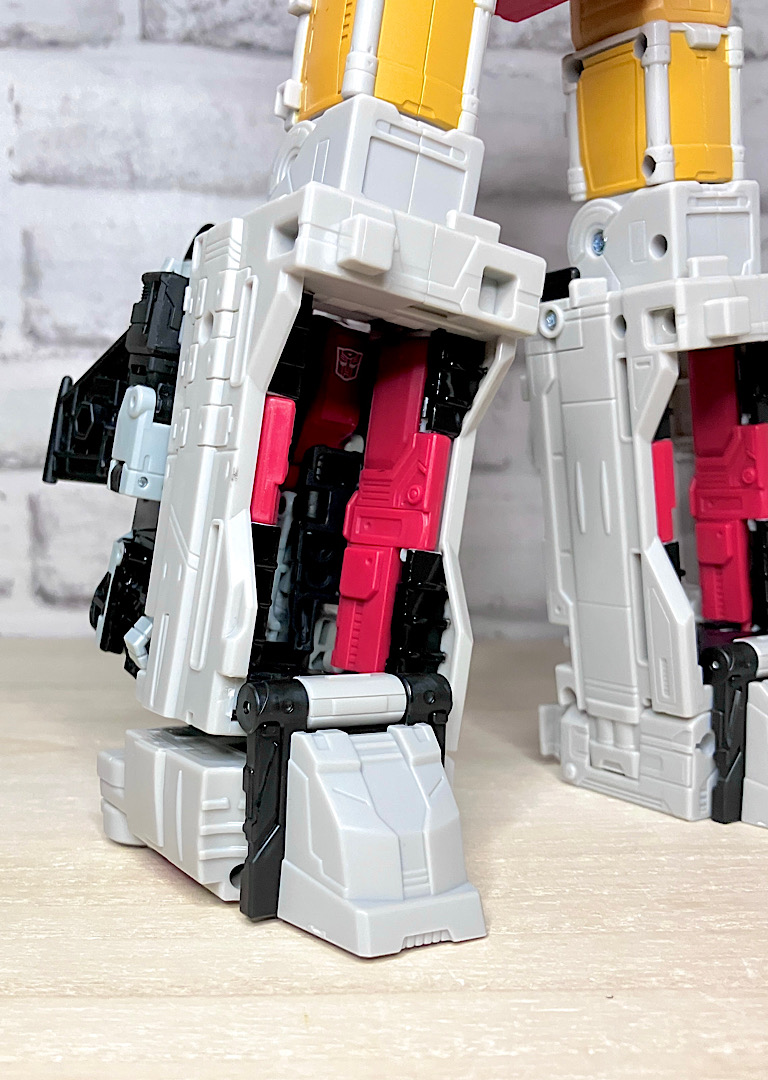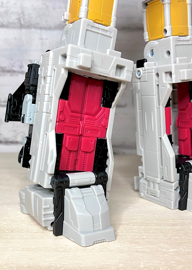 メリットも大きいフレーム合体方式ですが、もともとの持ち味だった組み替え自在のスクランブル合体が無くなってしまったのが残念ポイント。唯一、腕同士・脚同士は同型なので入れ替えることができまして、それをやったのがこの写真…なのですが、要は左右反転しただけなので印象はそれほど変わりません。