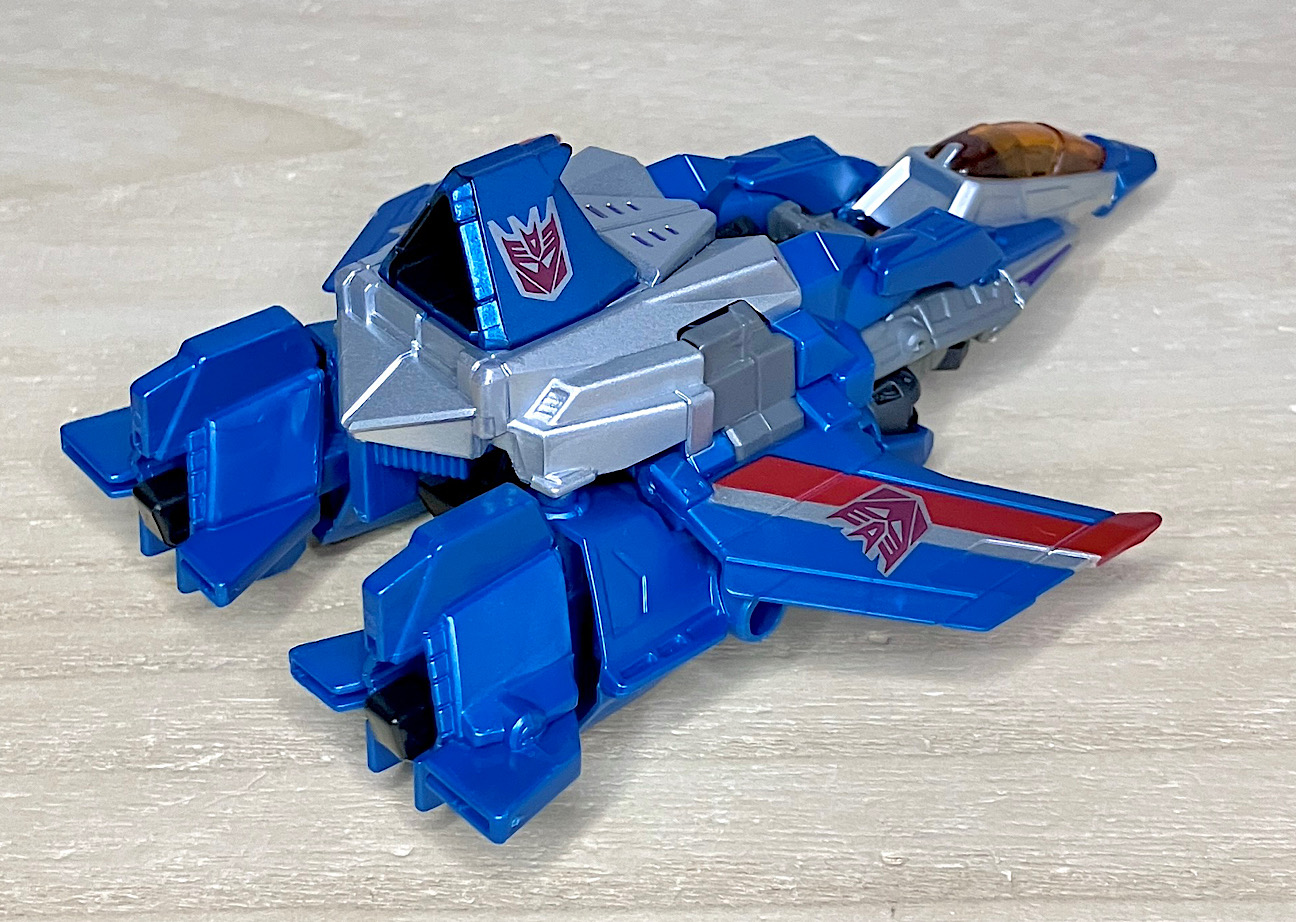 【ビークルモード】サイバトロンSFジェットに変形。なんかウィングが小さくてジェット機っぽくないし、全体的にディフォルメされている印象。ウィングは劇中でももう少し大きかったんじゃないかな?