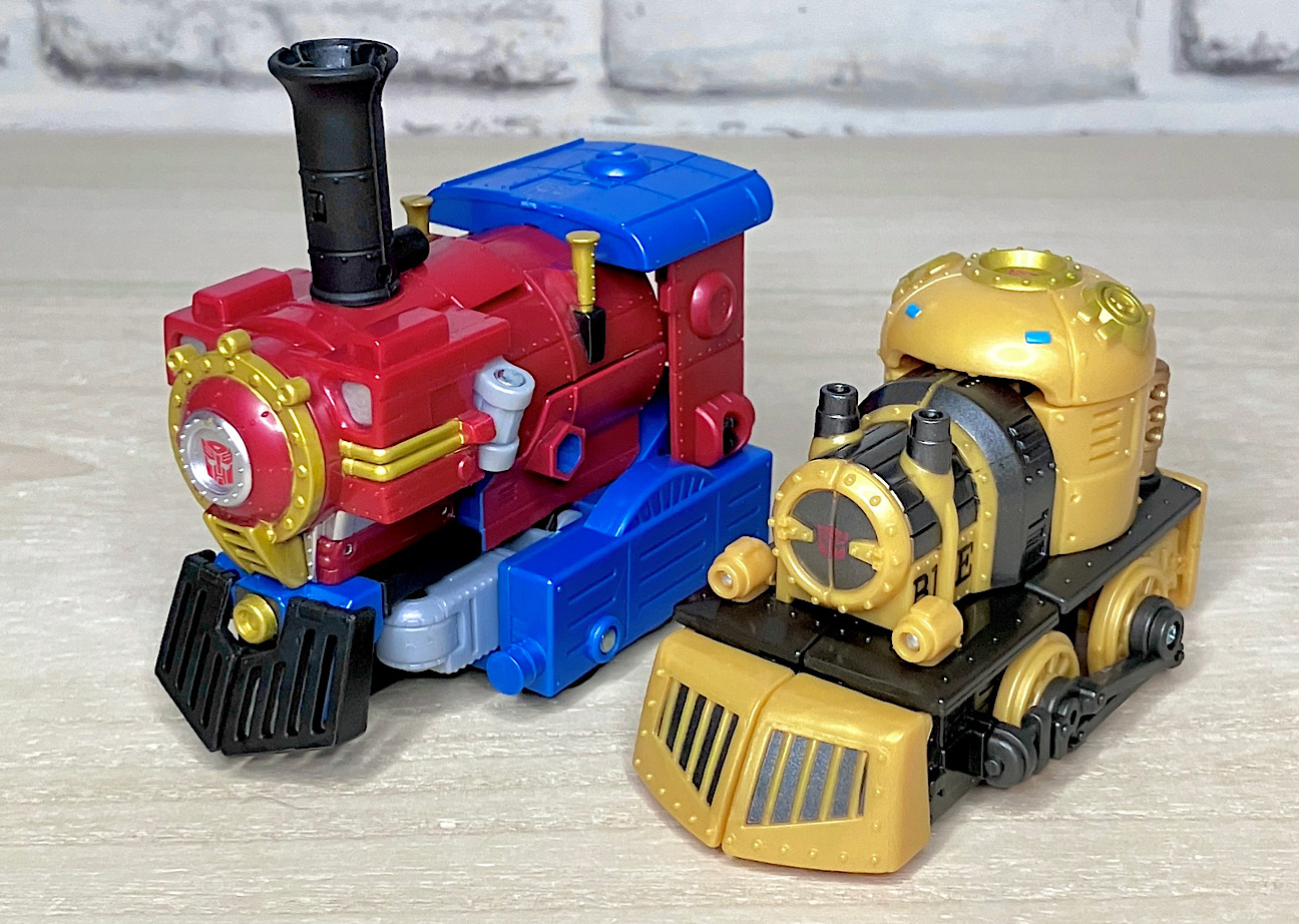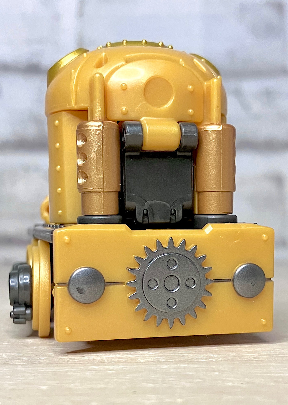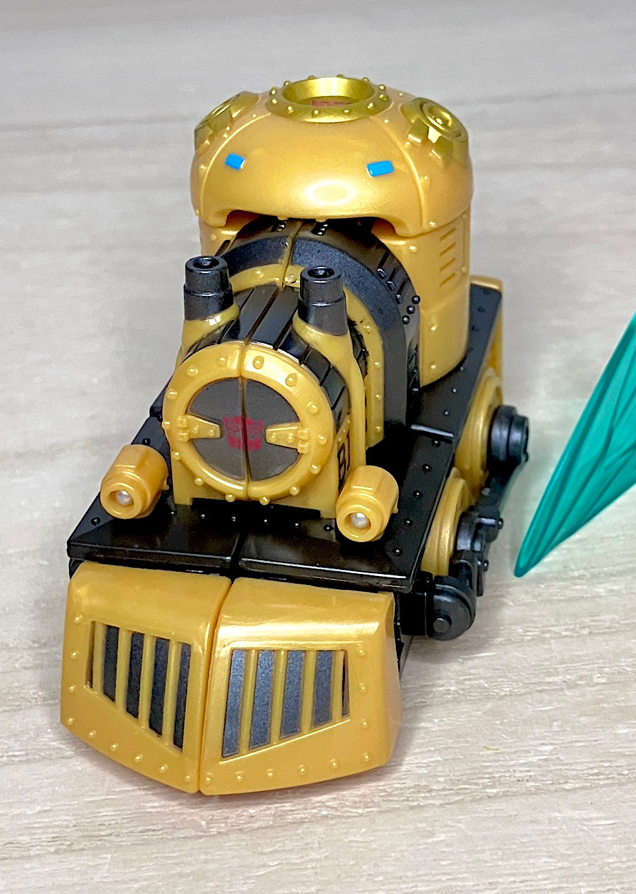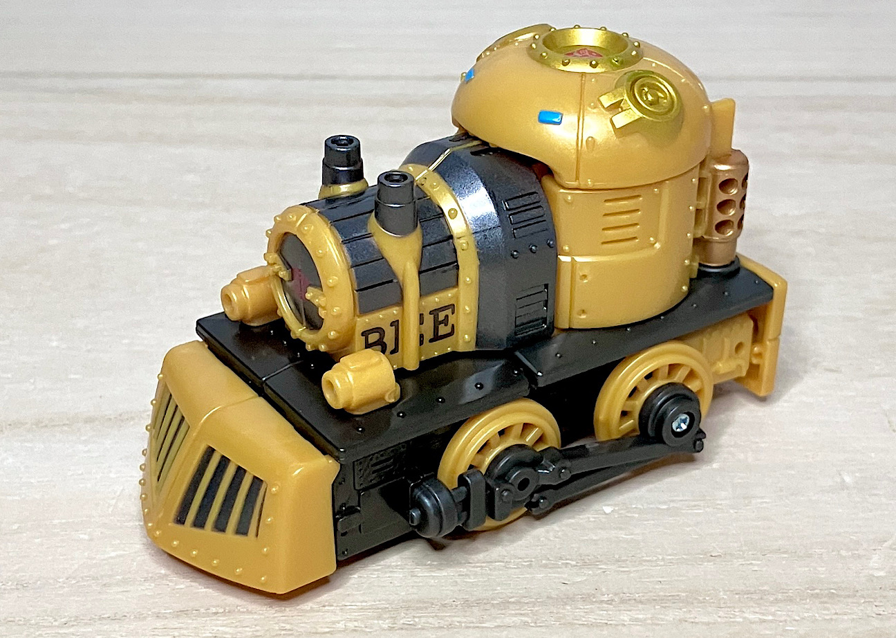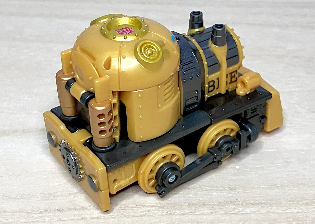 【ビークルモード】スチームパンク風の蒸気機関車に変形。幼児向けオモチャっぽかったオプティマスとは違って、デフォルメされつつもしっかりとSFしてる感じ。サイズはコロンと手のひらに乗るくらいでカワイイです。