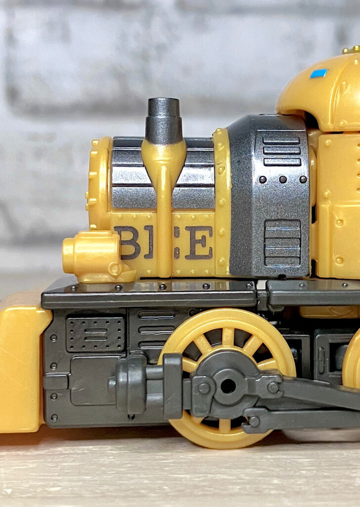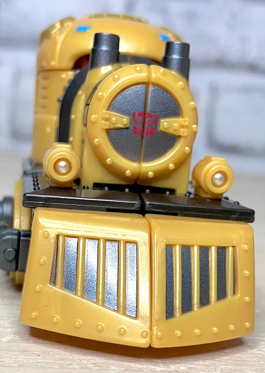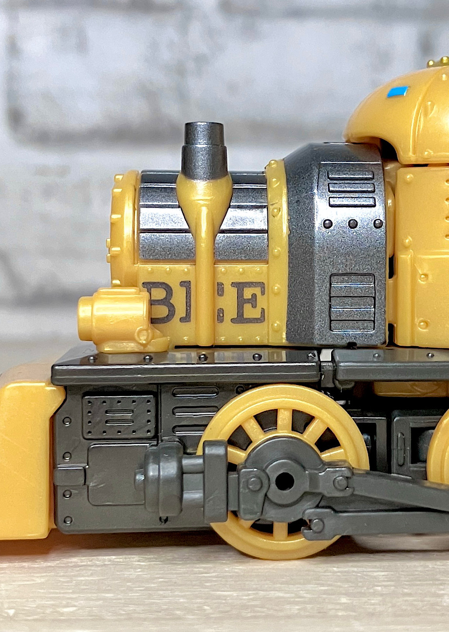 【ロボットモード】蒸気機関車モチーフのバンブルビー。ボディの各所にその意匠が散りばめられ、さらにスチームパンクならではのリペットなどのディテールが細かく施され、情報量多め。デザイナーのセンスが光ります。またビーには珍しい肩アーマーに騎士っぽさが。