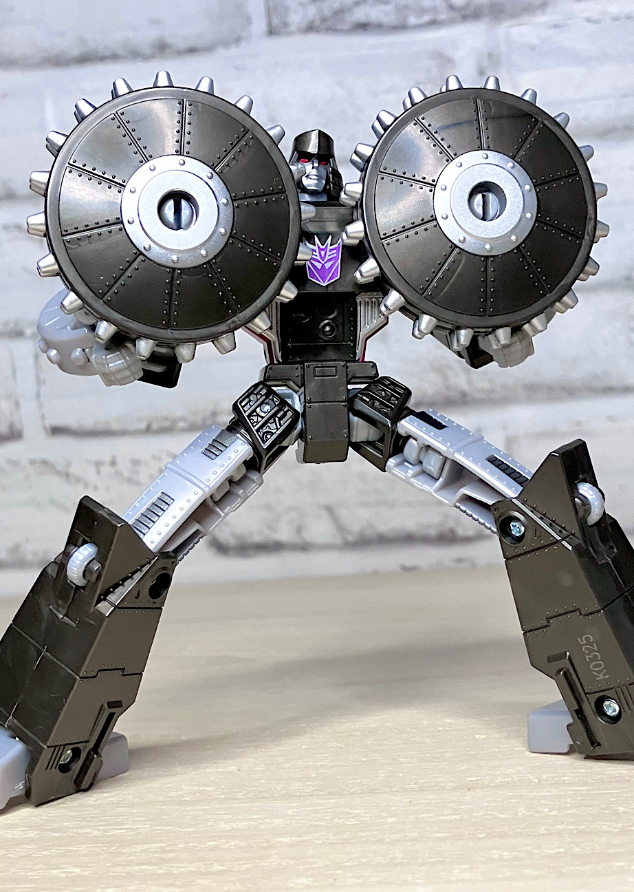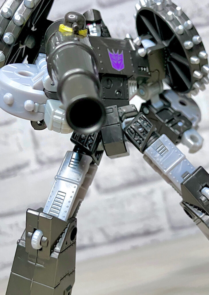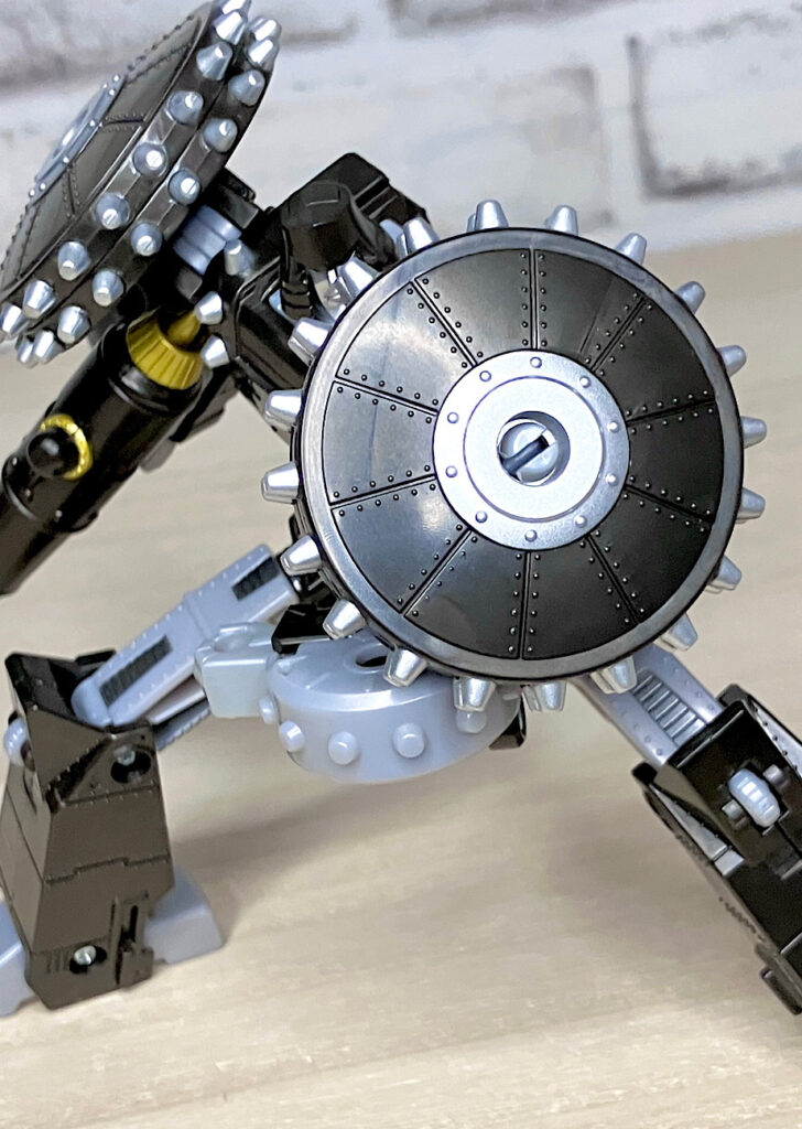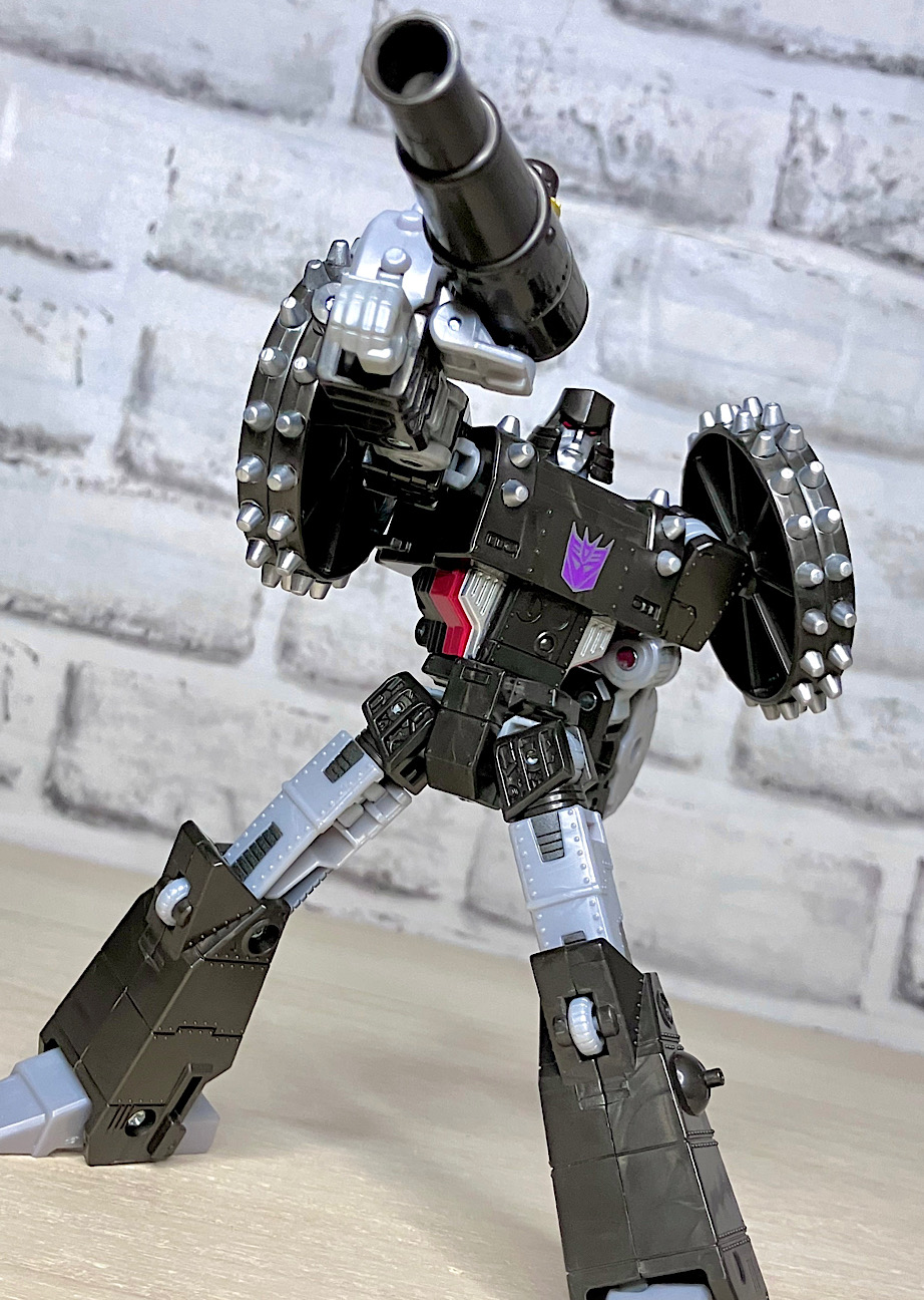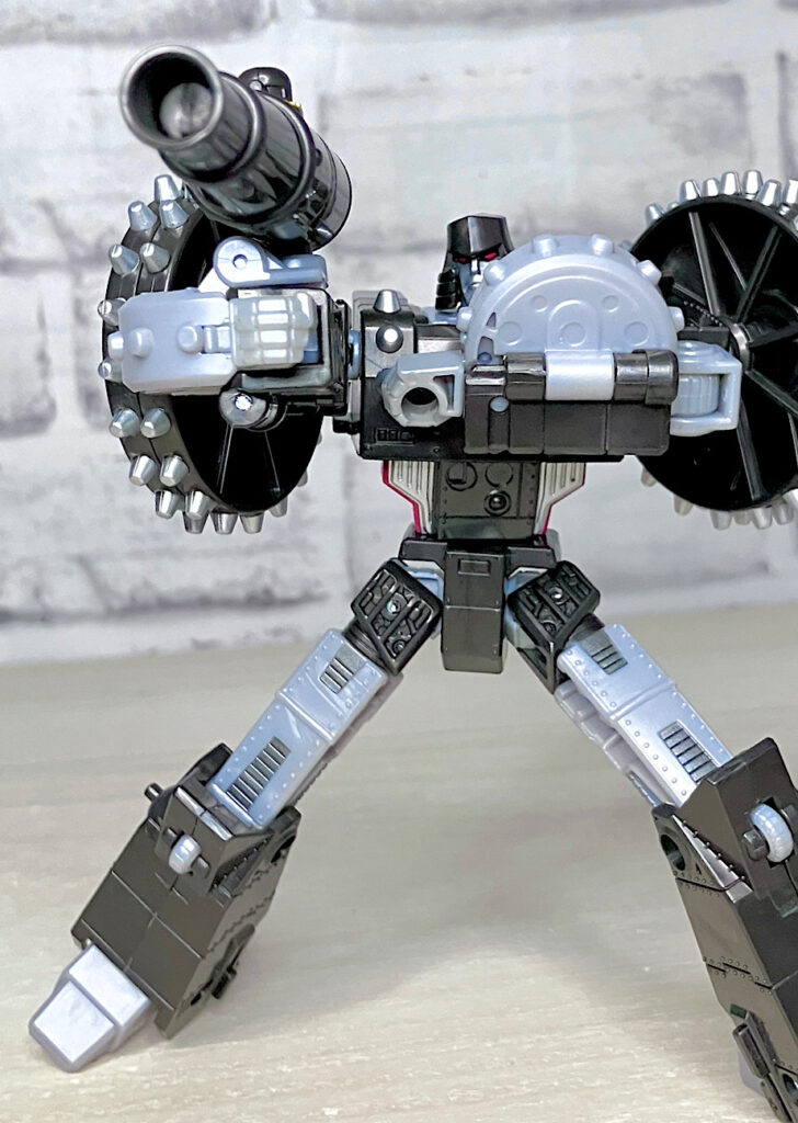 【ロボットモード】メガトロンのモチーフはなんと砲車。両肩に付いた巨大なスパイク付き車輪やガンメタカラーが目を引きますが、よーく見ると本体はわりとオーソドックスでスリムなG1メガトロンだったりします。