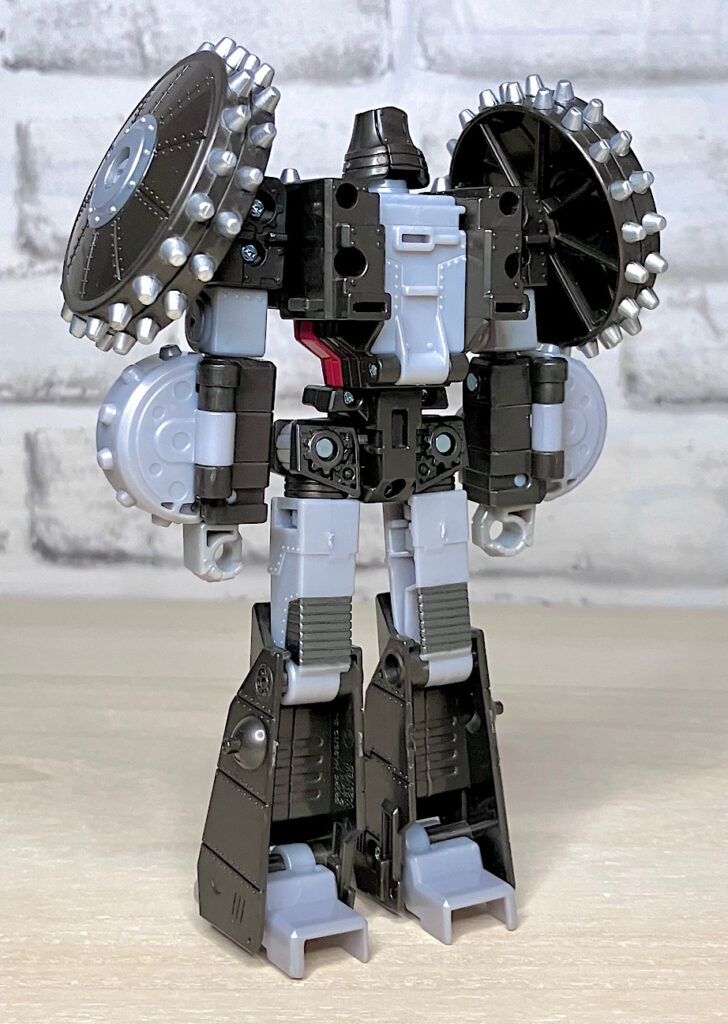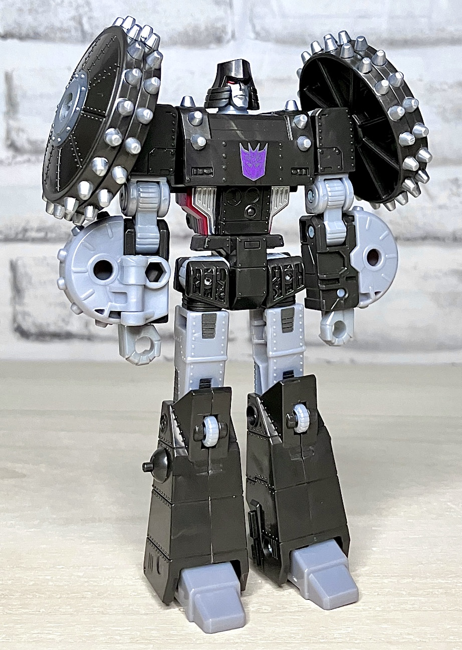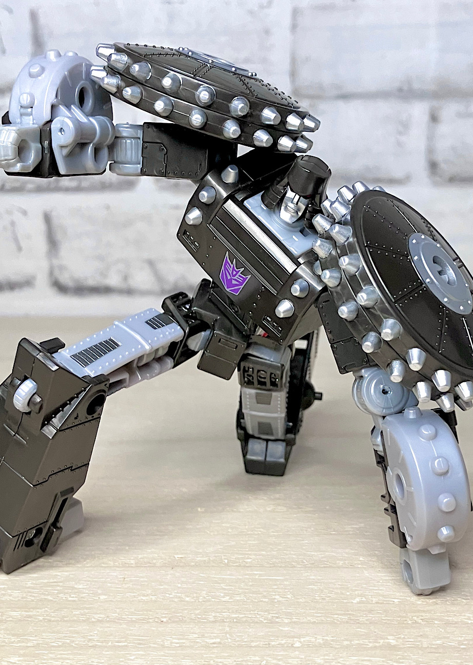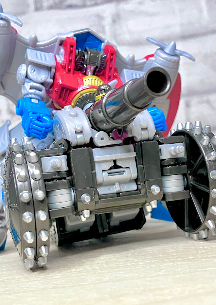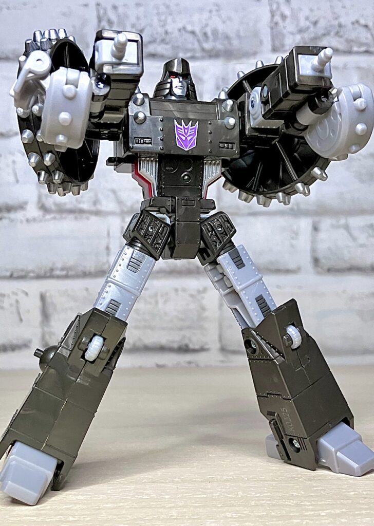 【ロボットモード】メガトロンのモチーフはなんと砲車。両肩に付いた巨大なスパイク付き車輪やガンメタカラーが目を引きますが、よーく見ると本体はわりとオーソドックスでスリムなG1メガトロンだったりします。