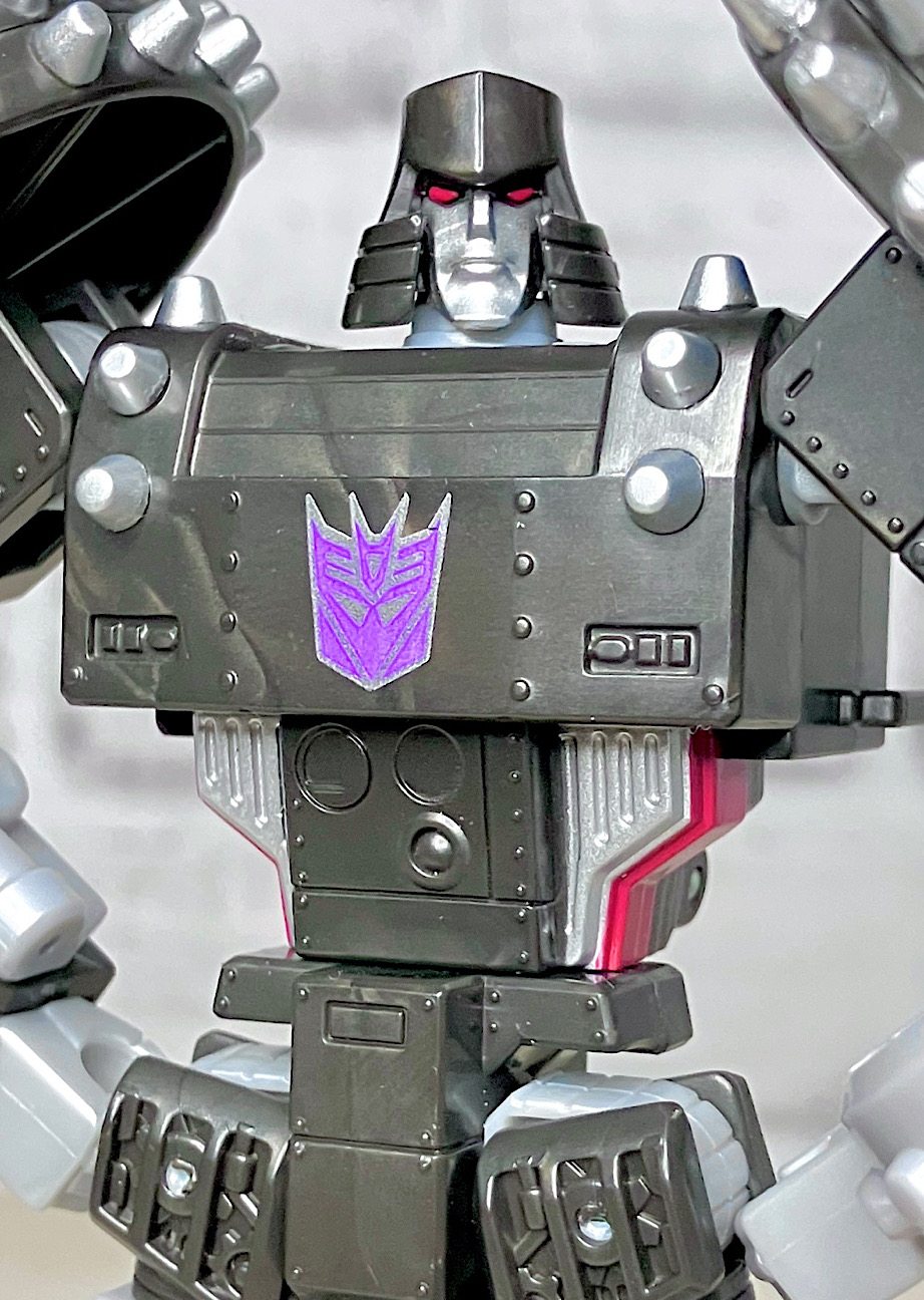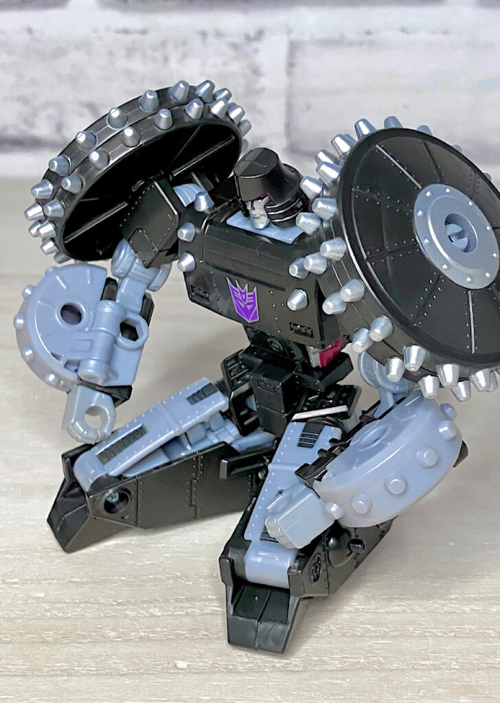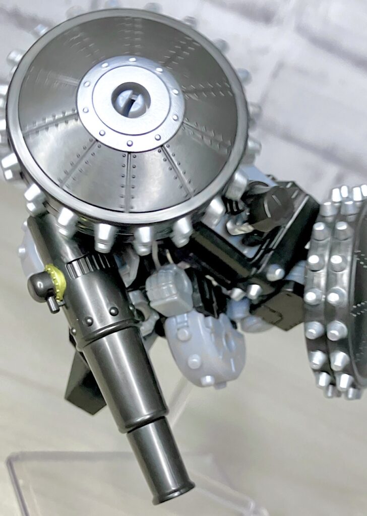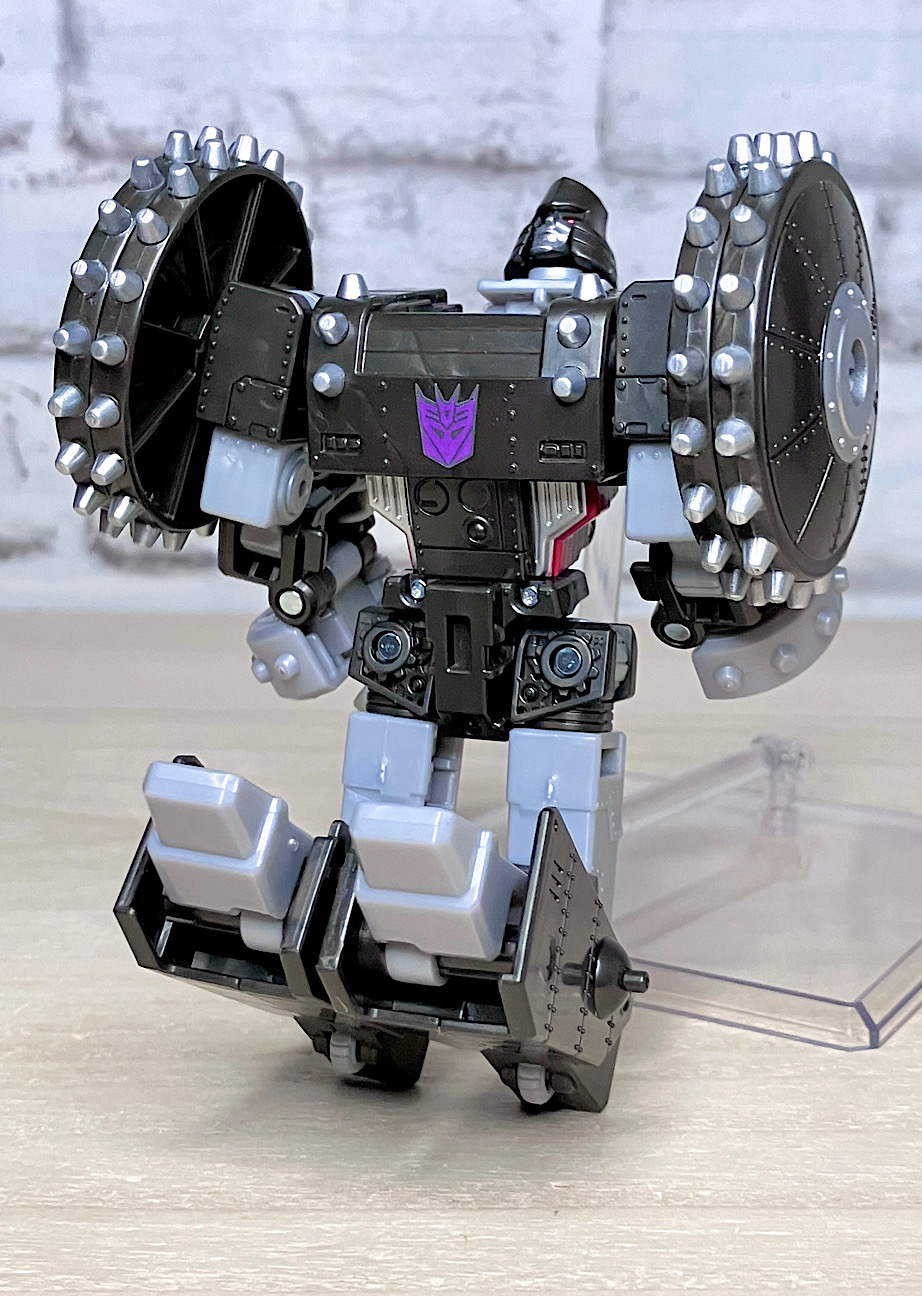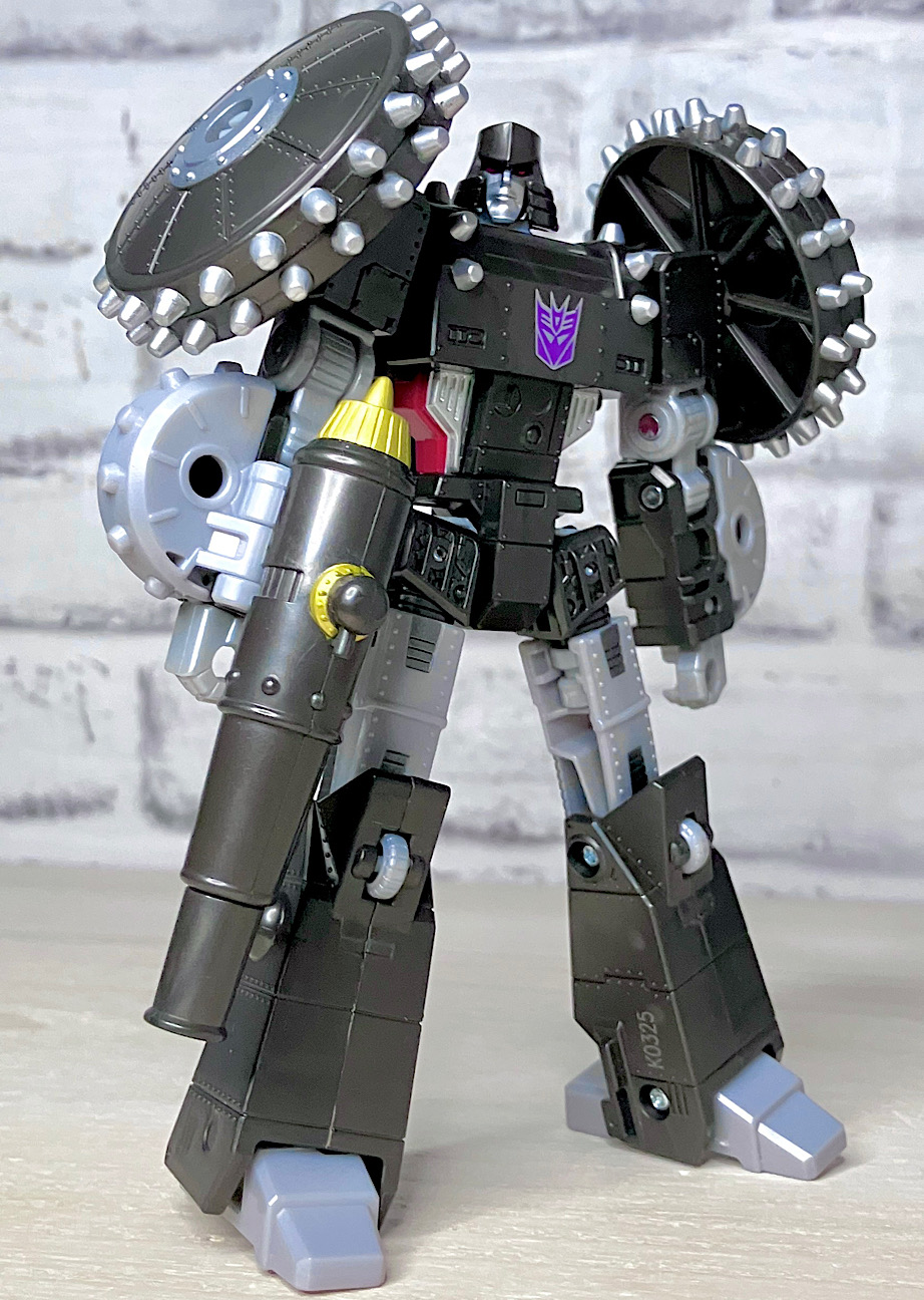 【ロボットモード】メガトロンのモチーフはなんと砲車。両肩に付いた巨大なスパイク付き車輪やガンメタカラーが目を引きますが、よーく見ると本体はわりとオーソドックスでスリムなG1メガトロンだったりします。