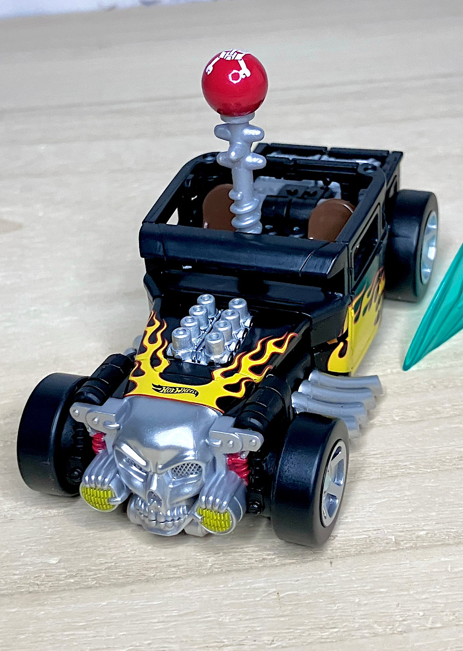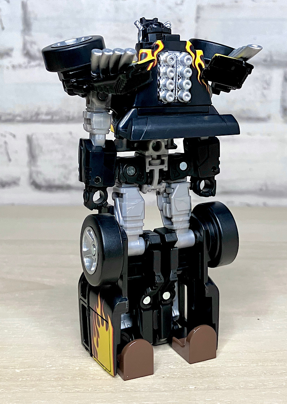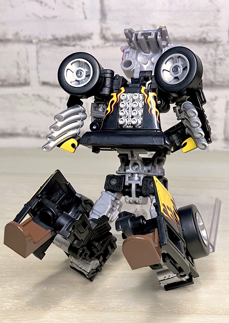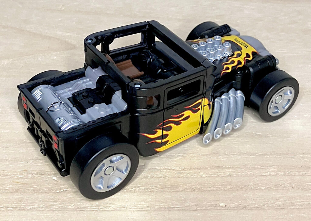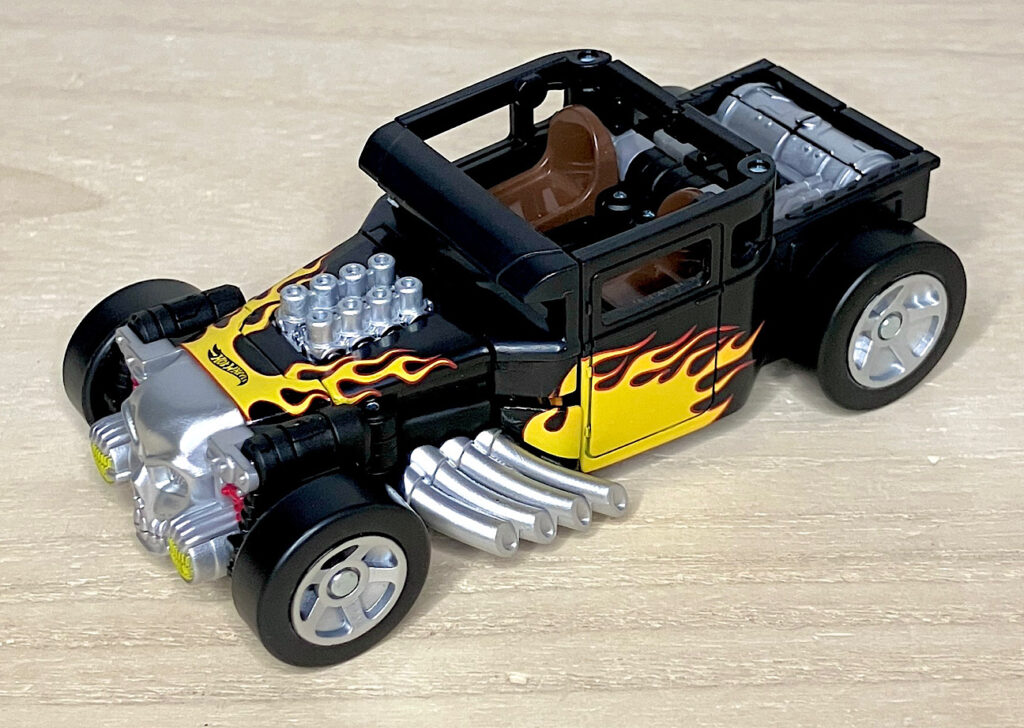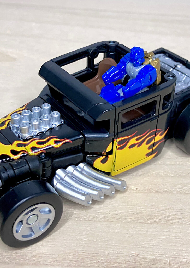 【ビークルモード】せっかくなのでブリスターから取り出したビークルモードから見ていきましょう。クラシックカーベースのやりすぎホットロッドのボーンシェイカー。今回は本物に比べややデフォルメされた体型になっているものの、ほぼ忠実に商品化されました。カラーはブラック基調。