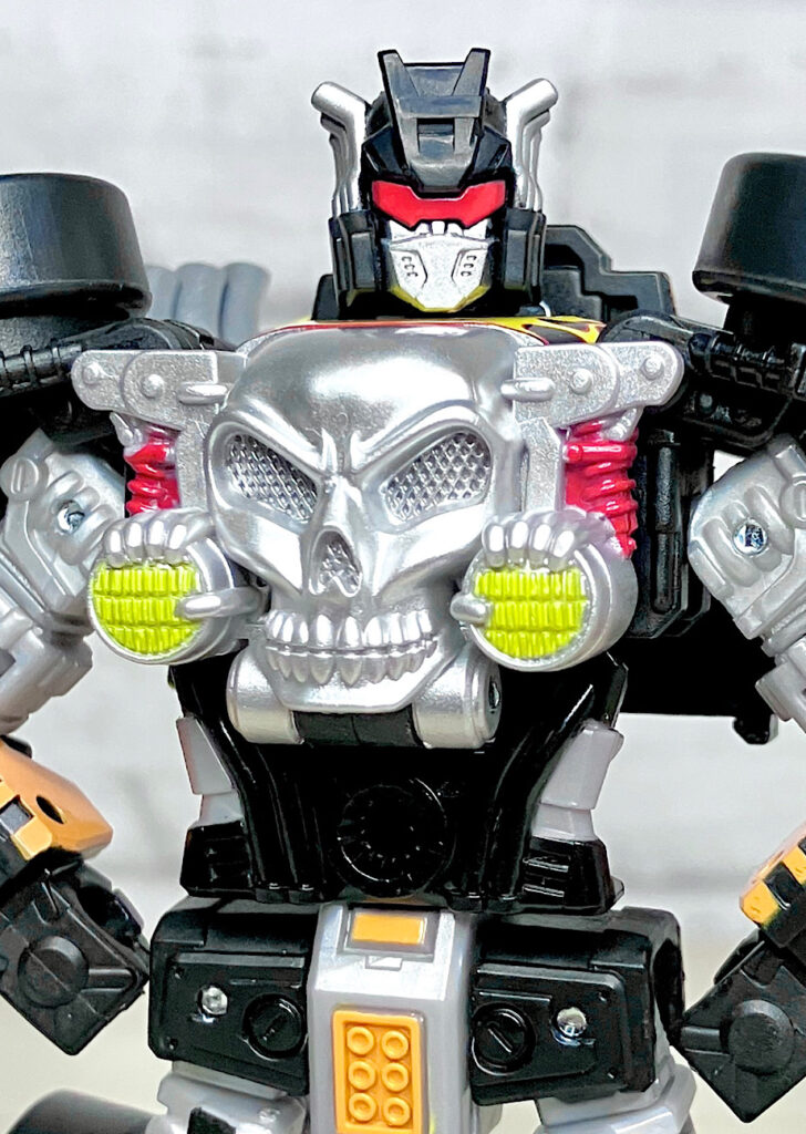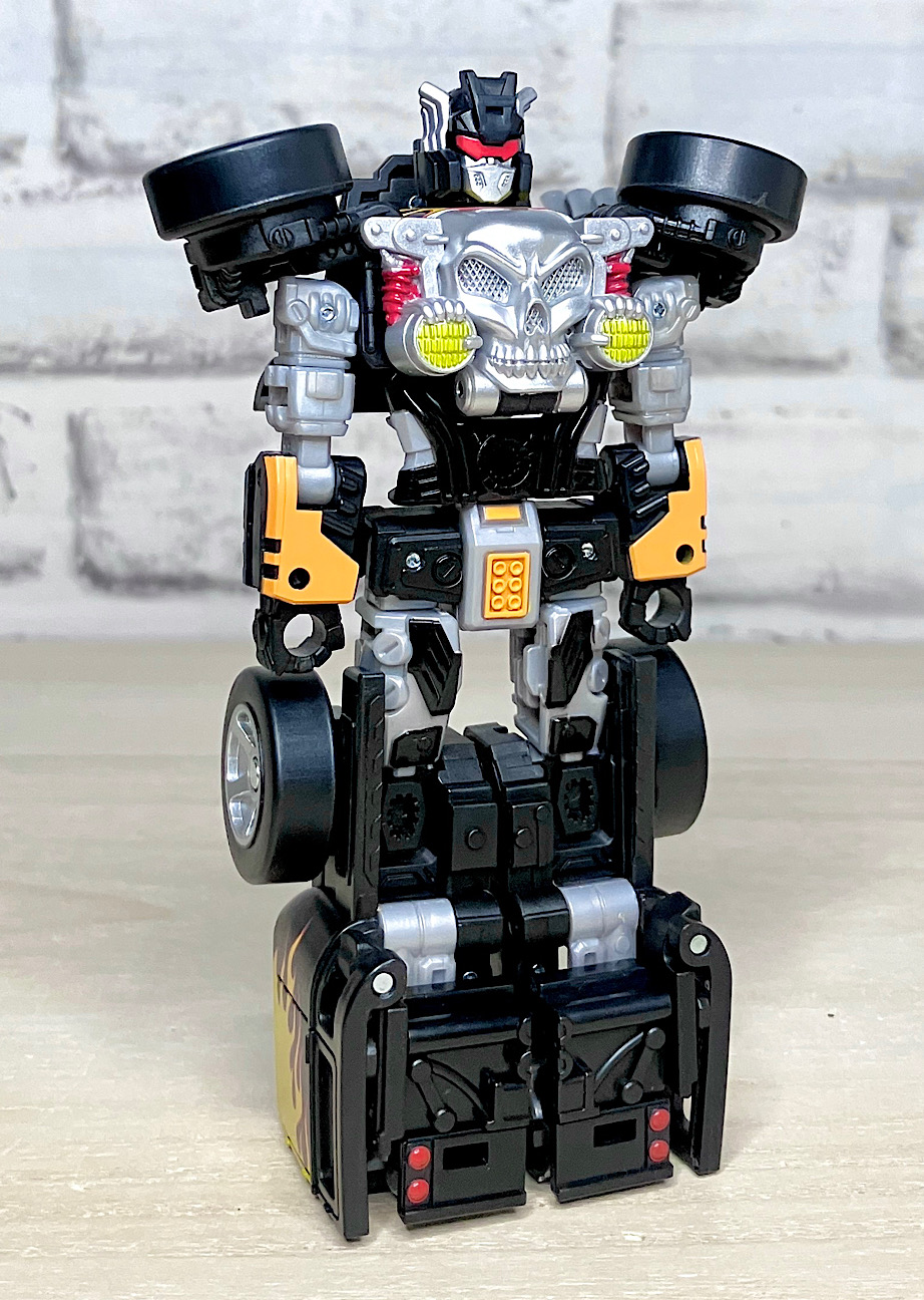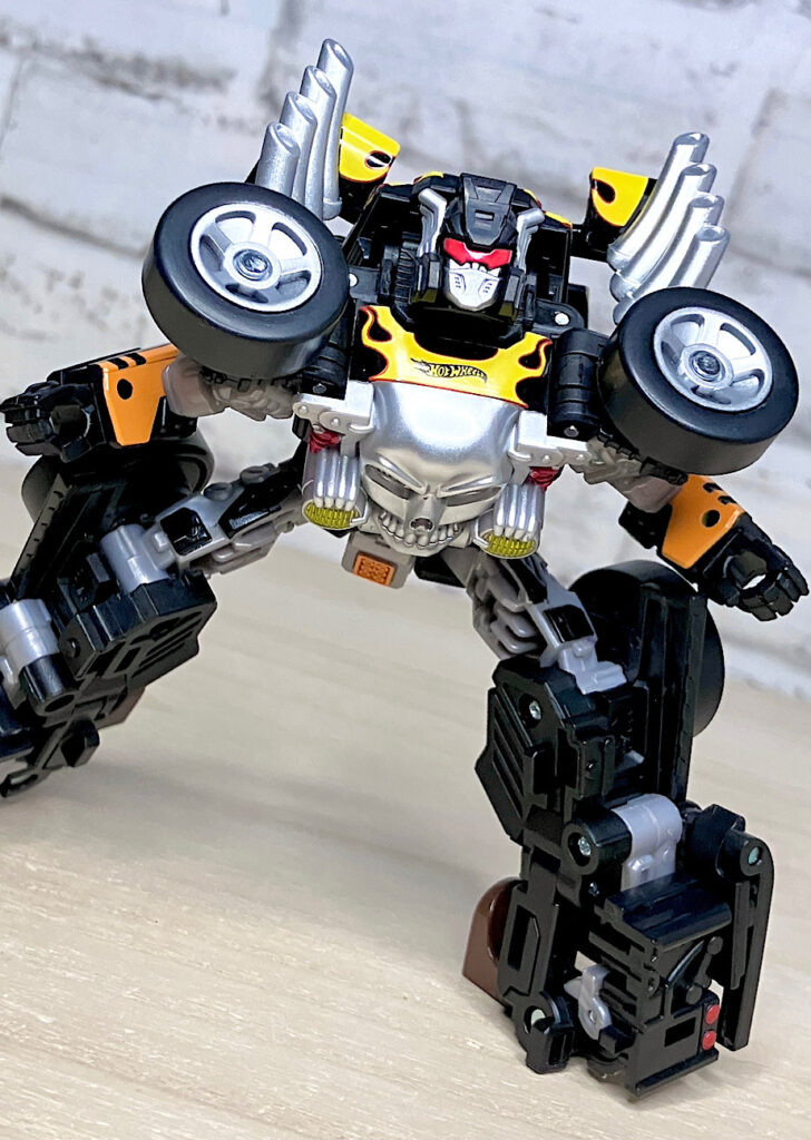 【ロボットモード】というわけでTFコラボオリジナルのロボットモード。スラっとしたツインミルとは対照的に、ガッチリ箱体型です。特徴であるドクロがちゃんと胸に来るようにデザインされ、オートボットよりディセプティコンの方がしっくりきますね。肩のタイヤもイカつい!