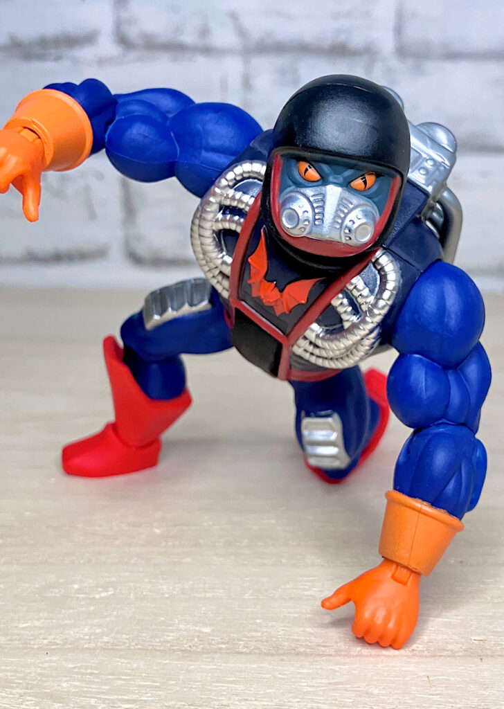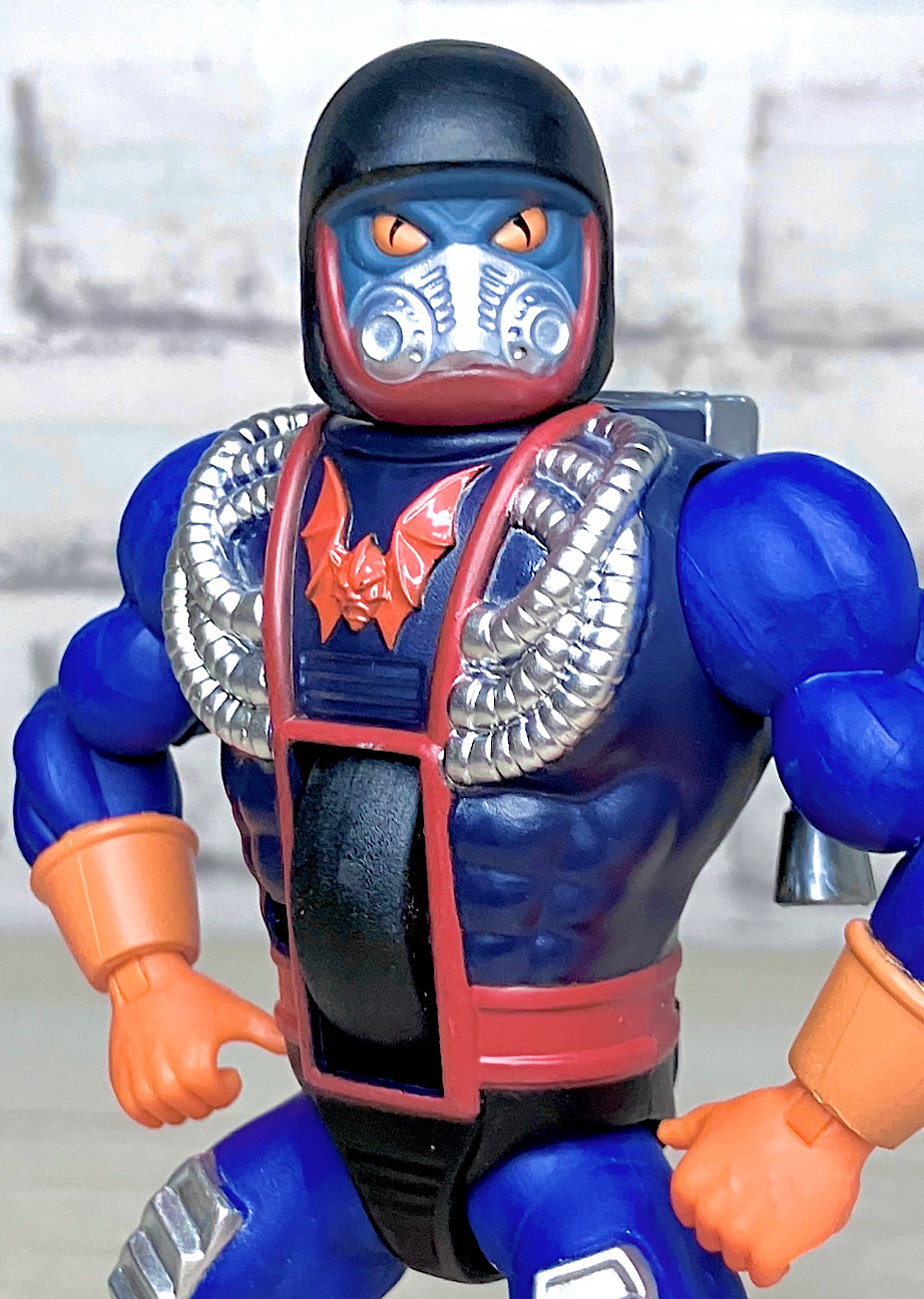 【アップ】マスクの下にはモンスター風の素顔が描かれているようです。改造前は普通の人だったので、ちょっとかわいそうな境遇。なおボディには後述のギミックが仕込まれており、流用の少ない高コストアイテムとなっております。
