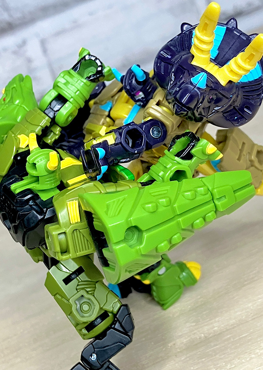 トリケラ頭部とシッポは縦に付けるとこれまたしっくりきます。このようにワイルドキングはブロック玩具的な遊び方が楽しめるのです。