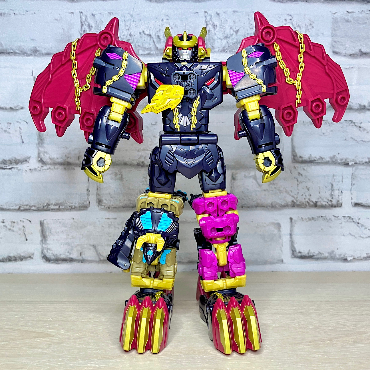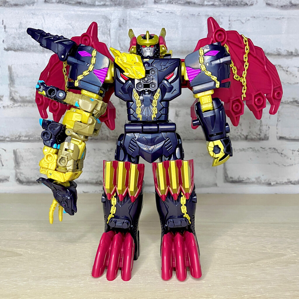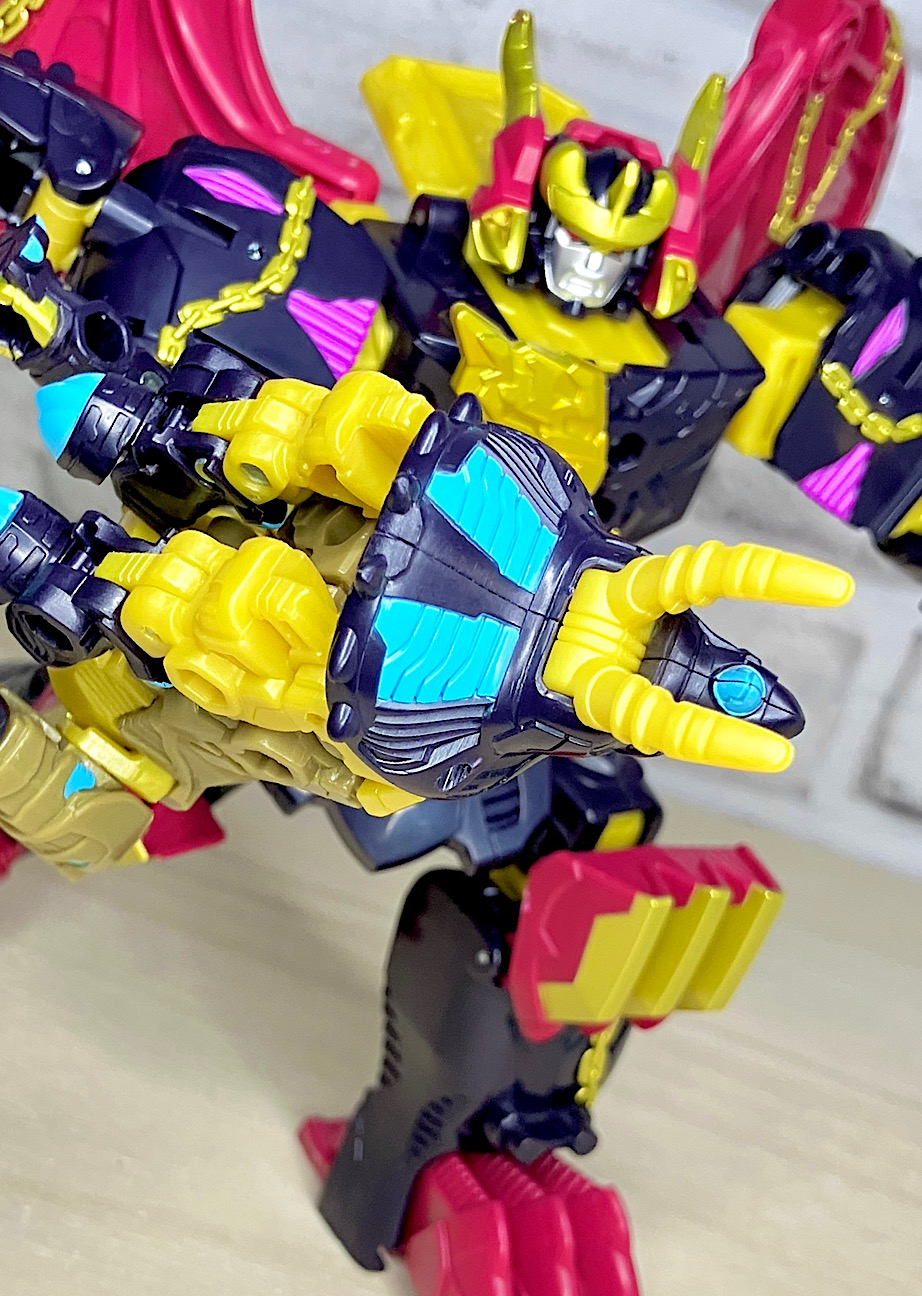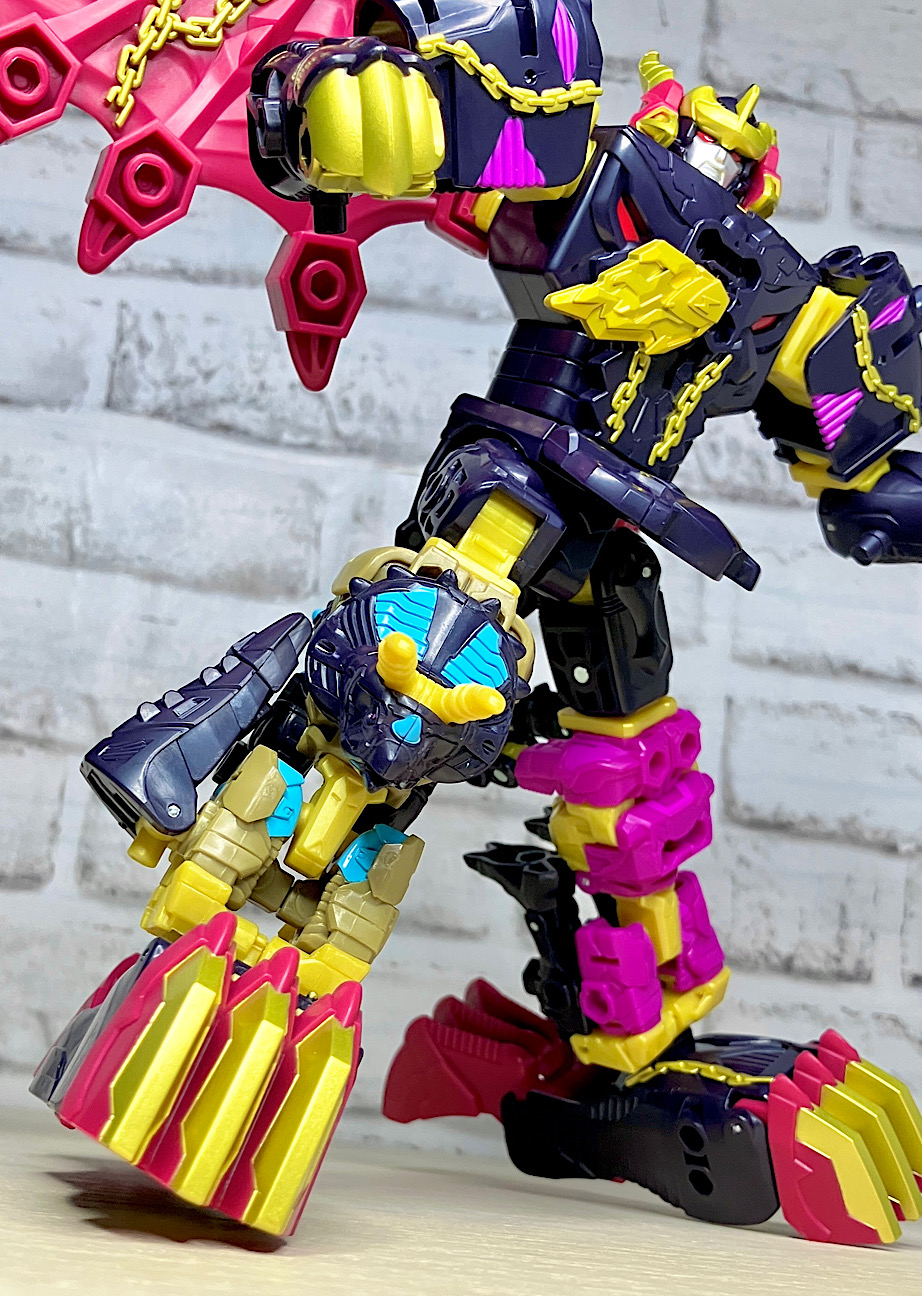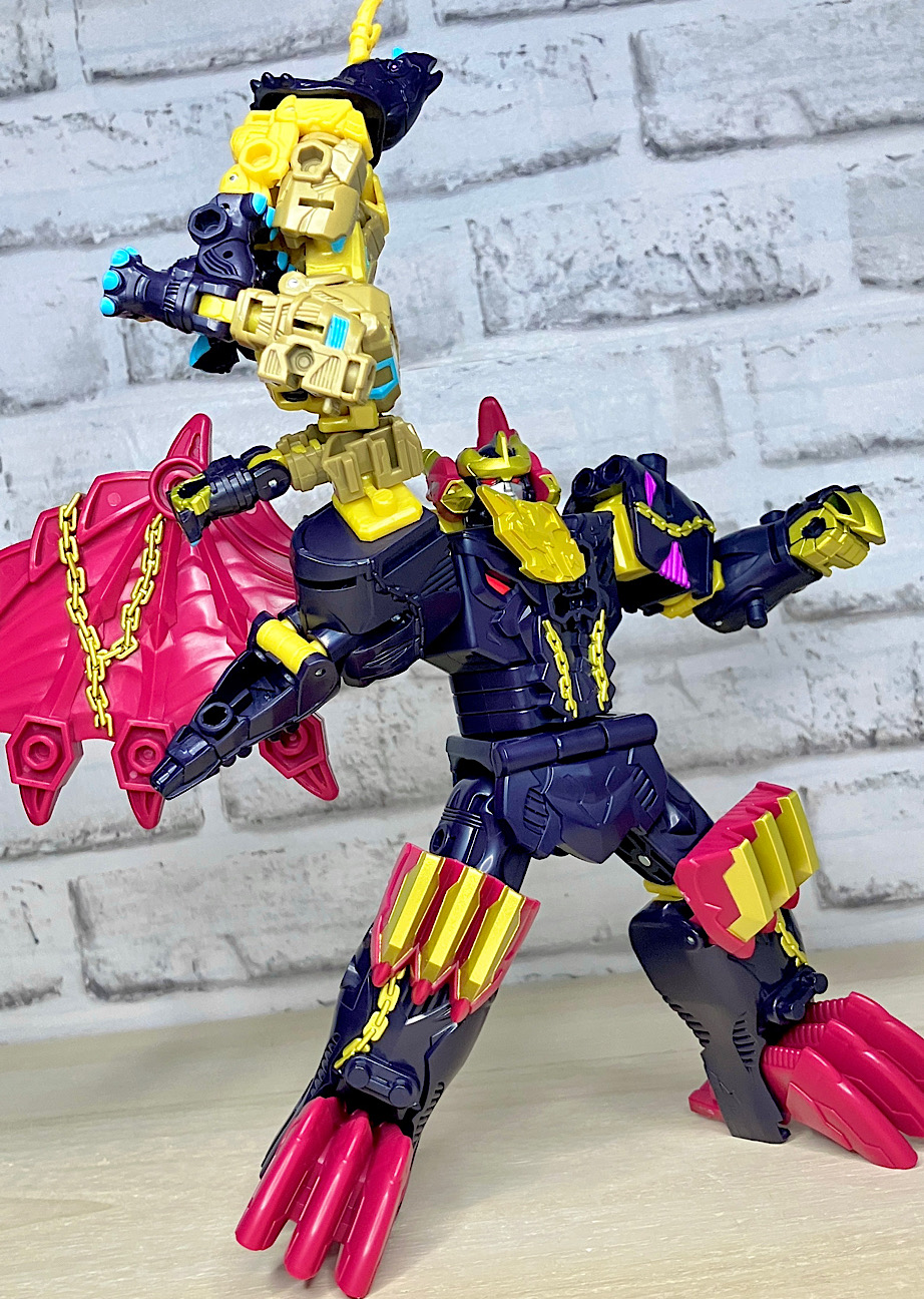 早速ワールドドラグナスとワイルドッキング!恐竜組は肩にシッポが来てギザギザしたシルエットになるのと、拳の先に恐竜頭を付けるのが特徴。カラーに黒も混じっているので親和性は高いです。