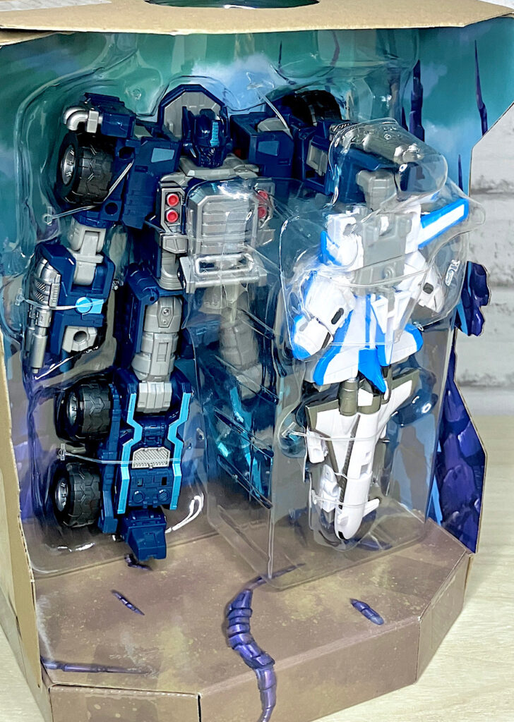 外箱から取り出すと、中身はちょっとしたジオラマ風になっており、スターセイバーを持つネメシスプライムという場面。アニメの塩の惑星とは雰囲気が同じような違うような…そもそもスターセイバーを持っている時点で別ユニバースなんでしょうね。