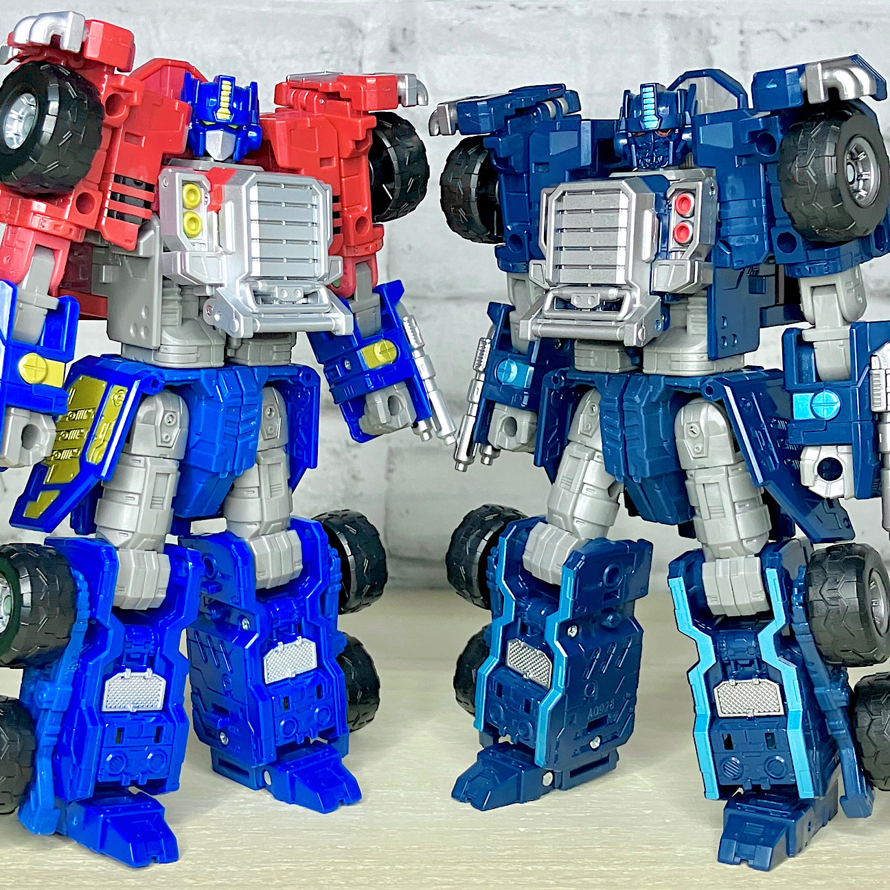 当時品と比較。リメイクはひとまわり大きく作られています。非クリアになったのは残念と言えば残念ですが、合体時の安定感はアップしていて(というか当時品は合体がユルすぎて…)、遊びやすさは段違いです。