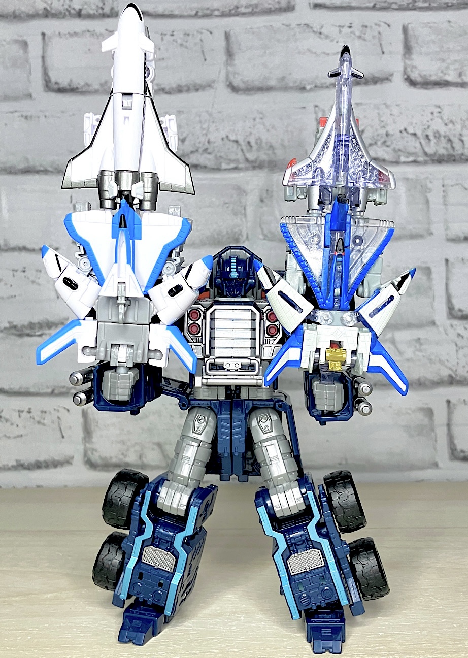 【スターセイバー】エアディフェンスミニコンチームが合体した姿。宇宙最強の剣として、その争奪戦が物語のひとつの軸となっていました。3機の航空機が、それほど形を変えずにそれっぽく組み合わさっているだけというとてもTFらしい武器だと思います。