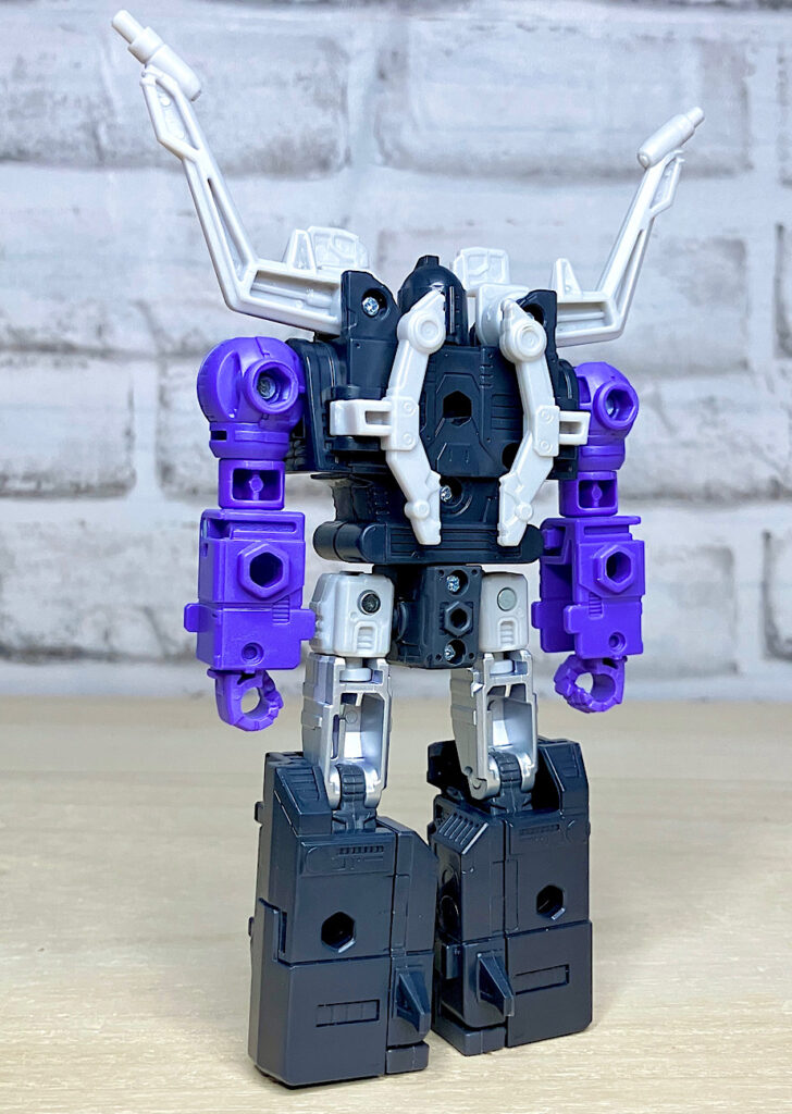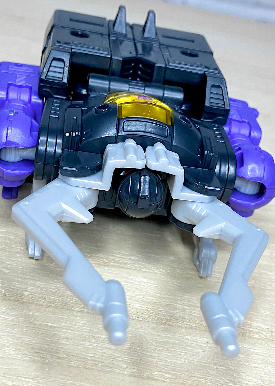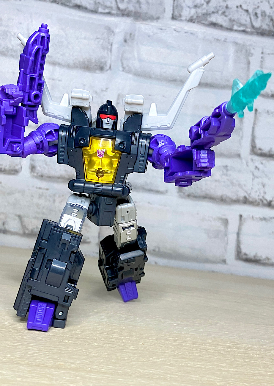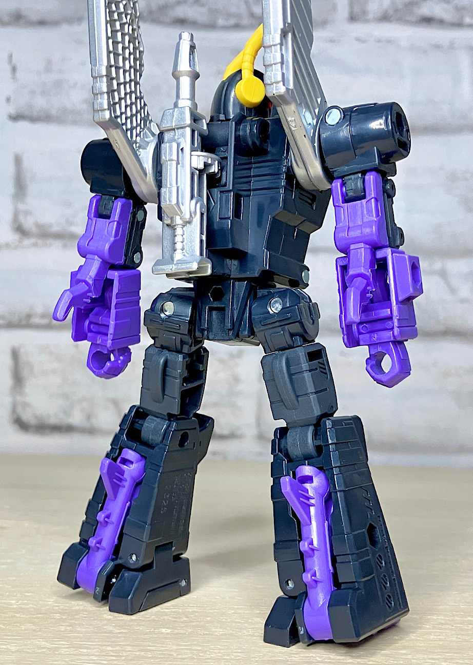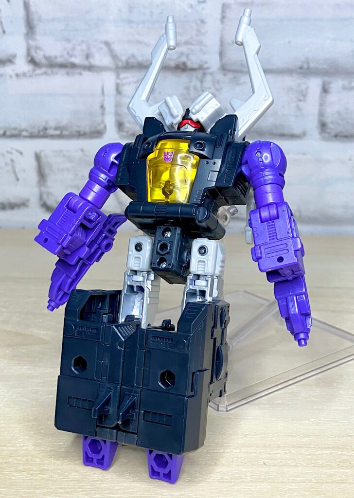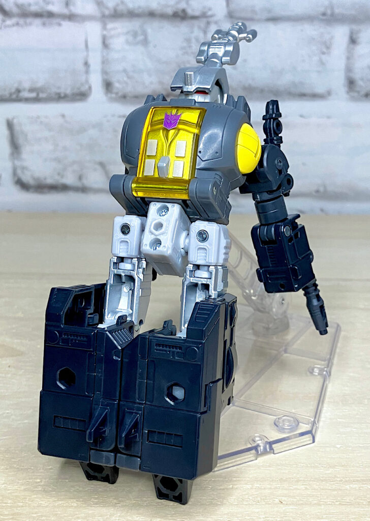 【ロボットモード】レガシーエヴォリューション版のリカラー。今回のセットの中では最も印象が変化しているキャラで、ボディのメインカラーが紫からグレーに変更されています。もちろんアニメでのカラースキームを再現したものなのですが、ホントかよと疑って見返してみると確かにグレーなんですよね。「TFはオモチャのイメージの方が先行しがち」の一例だと思います。ちなみにこのカラーで立体化されることは稀なので、貴重な商品となりました。