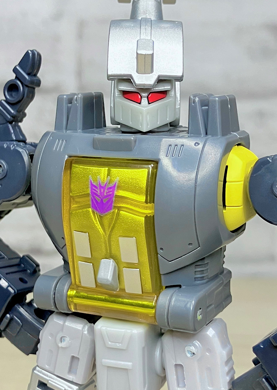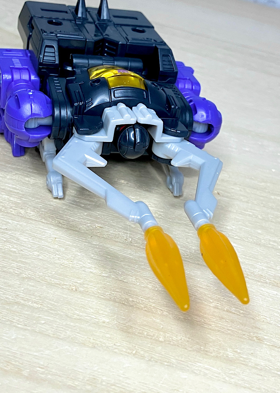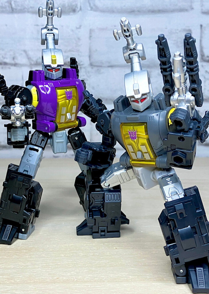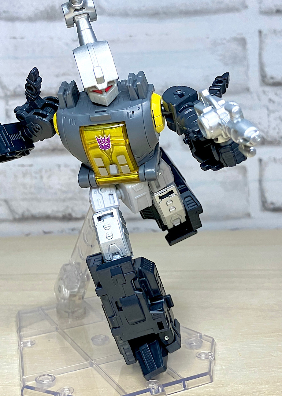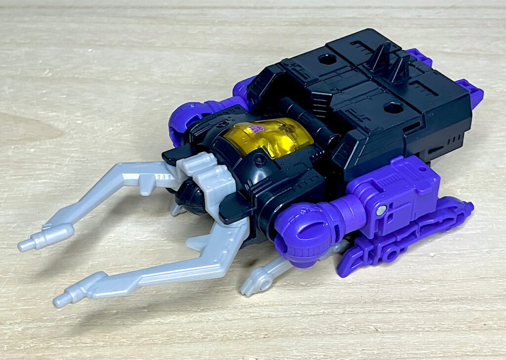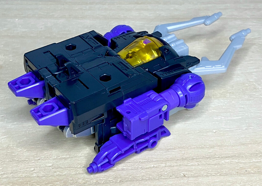 【ロボットモード】レガシーエヴォリューション版のリカラー。今回のセットの中では最も印象が変化しているキャラで、ボディのメインカラーが紫からグレーに変更されています。もちろんアニメでのカラースキームを再現したものなのですが、ホントかよと疑って見返してみると確かにグレーなんですよね。「TFはオモチャのイメージの方が先行しがち」の一例だと思います。ちなみにこのカラーで立体化されることは稀なので、貴重な商品となりました。