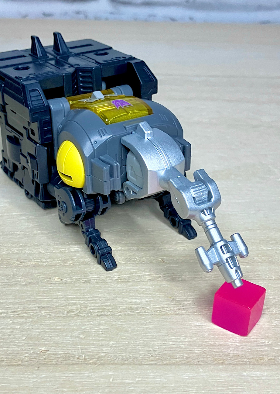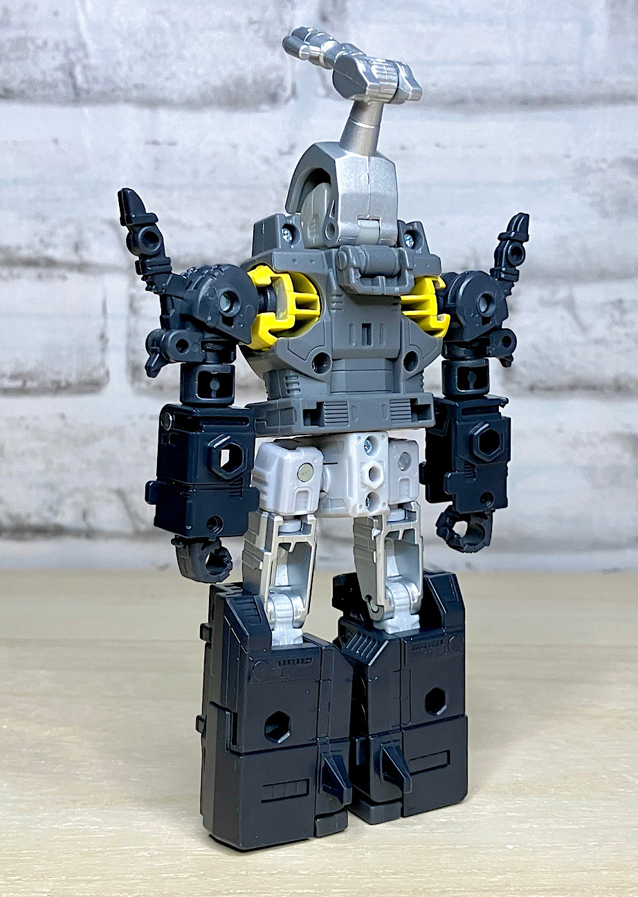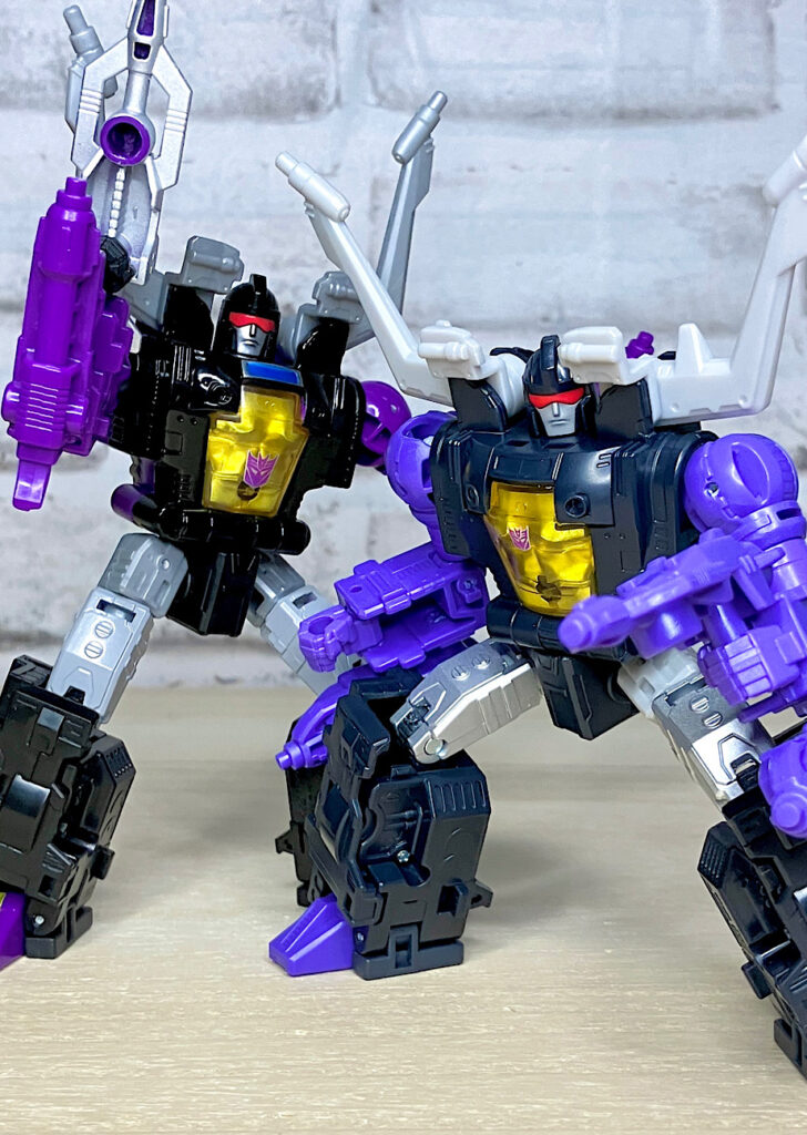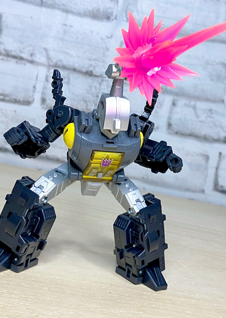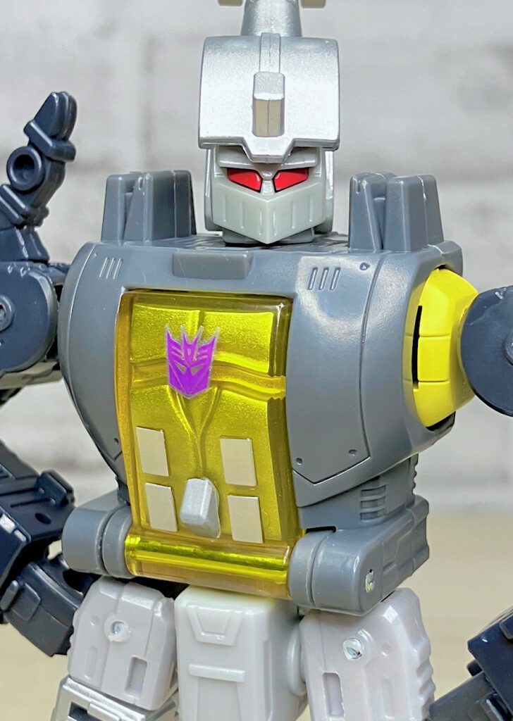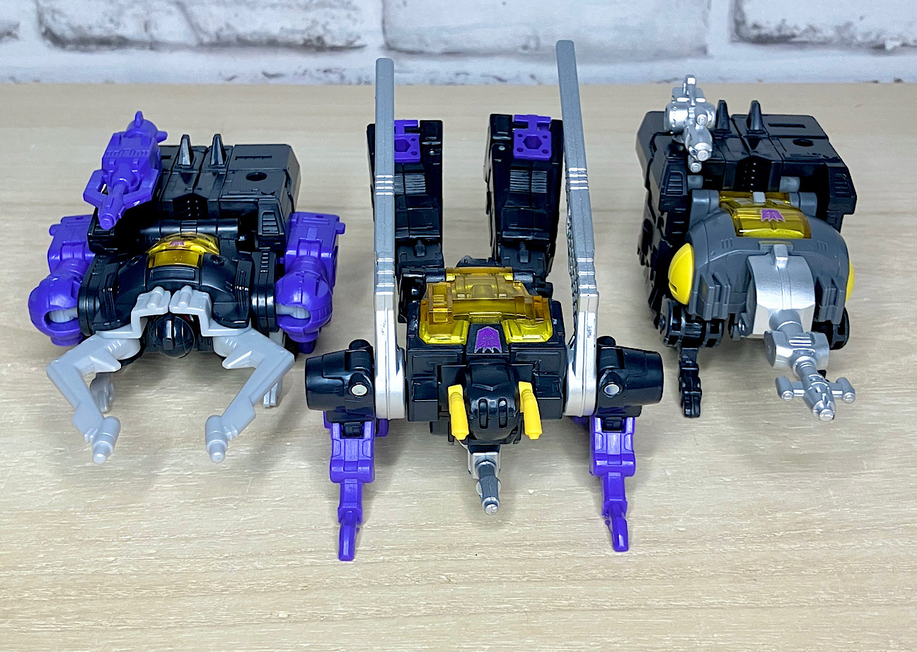 【ロボットモード】レガシーエヴォリューション版のリカラー。今回のセットの中では最も印象が変化しているキャラで、ボディのメインカラーが紫からグレーに変更されています。もちろんアニメでのカラースキームを再現したものなのですが、ホントかよと疑って見返してみると確かにグレーなんですよね。「TFはオモチャのイメージの方が先行しがち」の一例だと思います。ちなみにこのカラーで立体化されることは稀なので、貴重な商品となりました。
