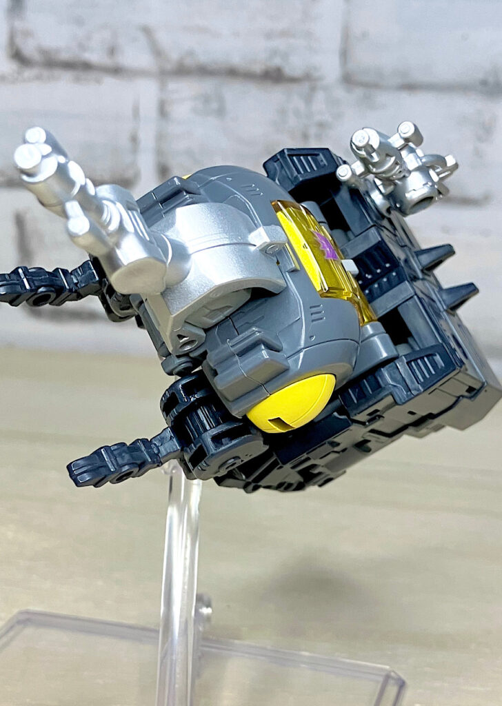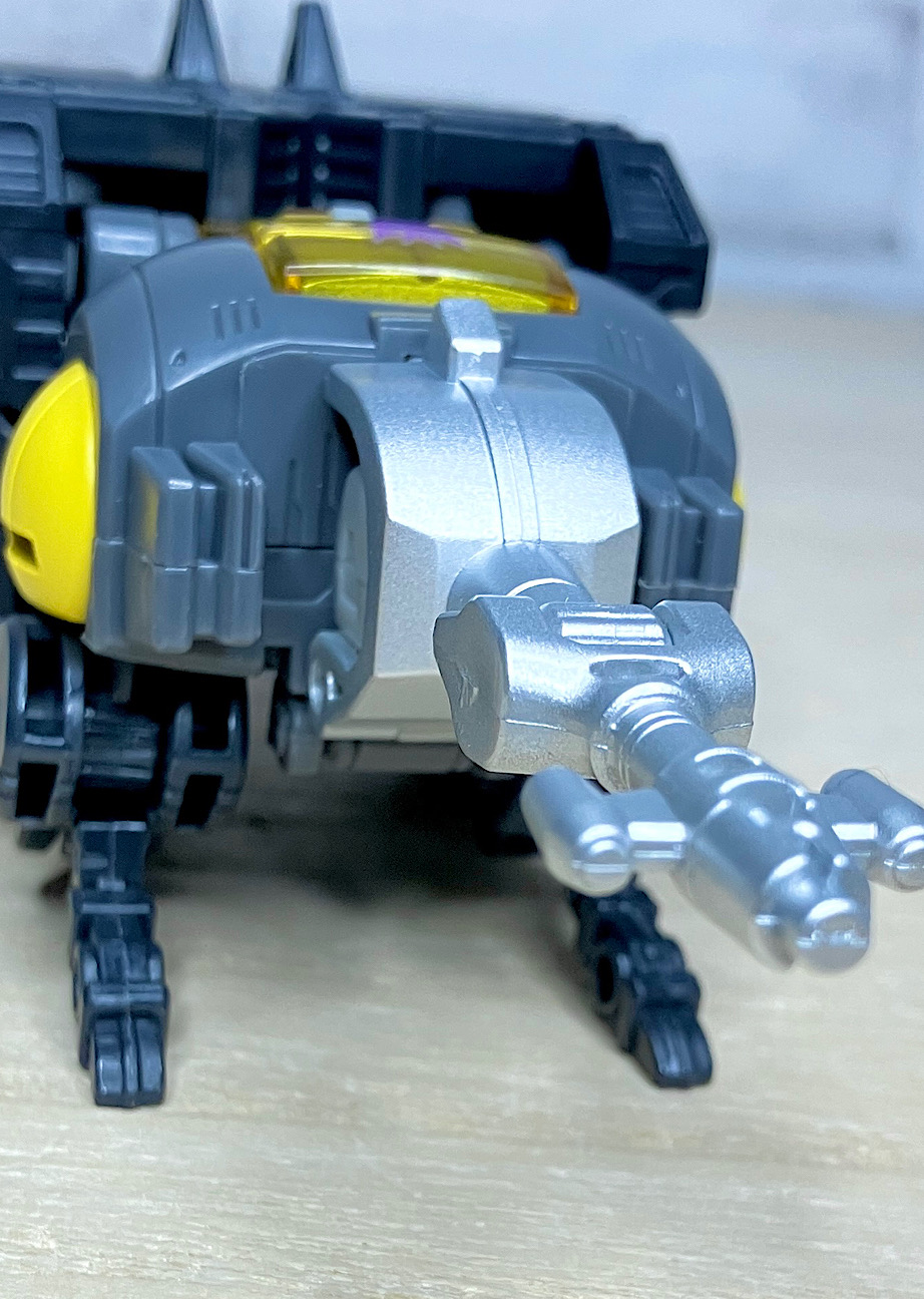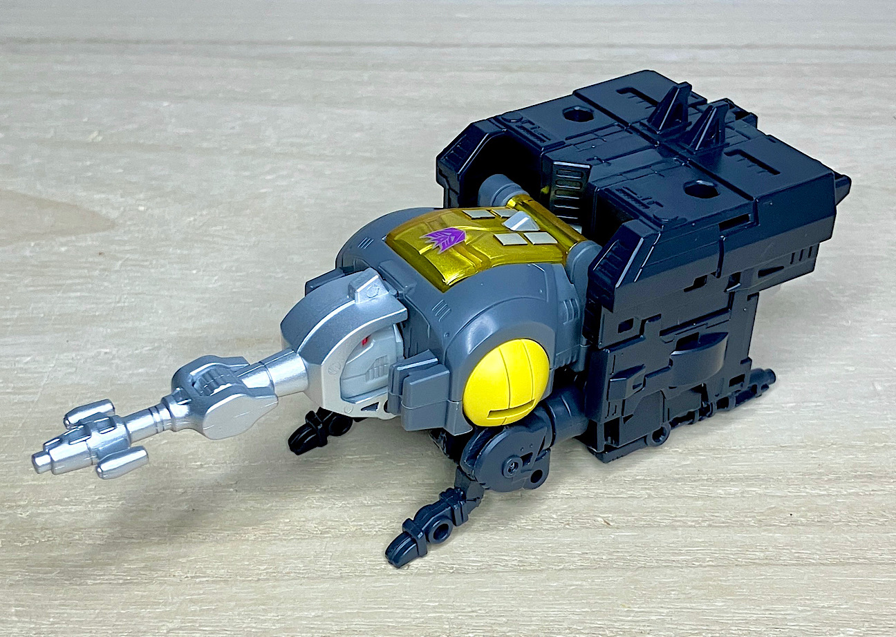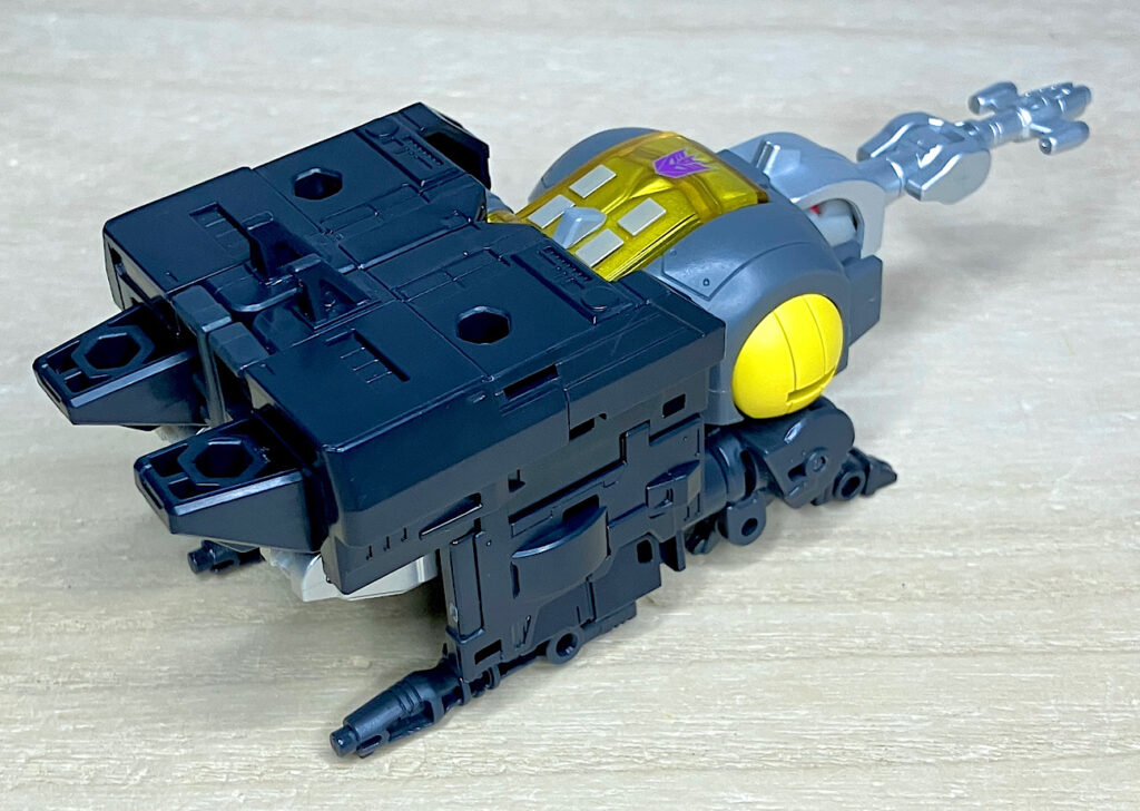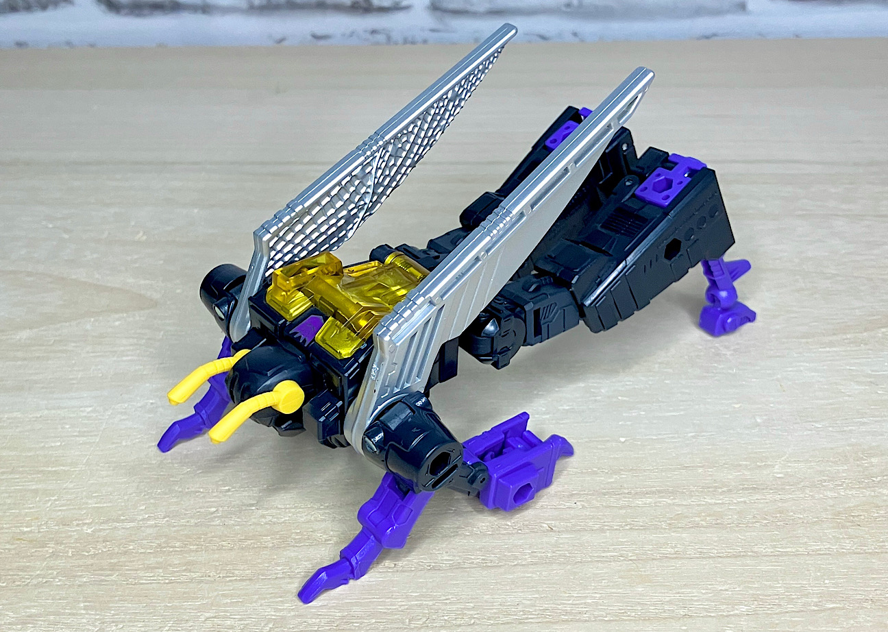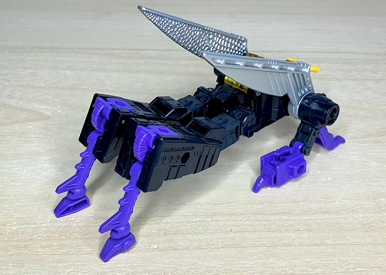 【オルトモード】メカバッタに変形。ほぼ寝そべっただけで、ぱっと見錯覚でバッタに見えるという程度の変形です。まあこれに関してもビンテージトイを引き継いだカタチなんですけどね。