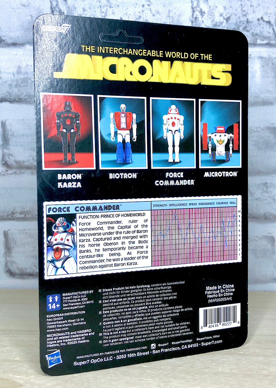 【パッケージ】スーパー7のリ・アクションは、もしも70〜80年代のあの頃、このフィギュアが出ていたら…を実在化したこだわりノスタルジー系マニアックフィギュアシリーズ。そしてマイクロノーツと言えば何を隠そうTFと同じタカラ出身である「ミクロマン」の海外展開名で、一度はハズブロユニバース構想にも組み込まれた親戚(というか先祖?)みたいな存在です。今回はそのマイクロノーツシリーズが無事にWAVE2に突入。早速購入してみました。