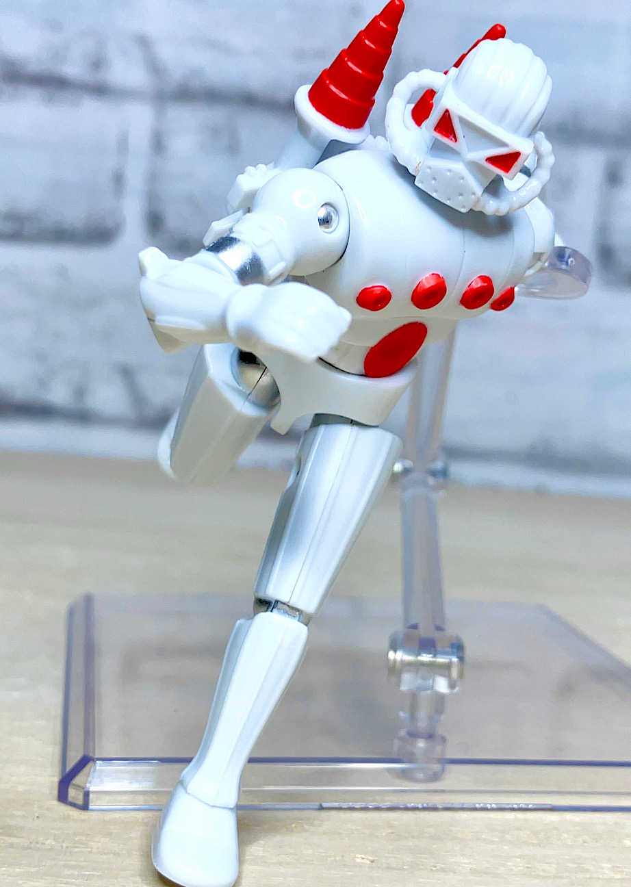 【可動】各関節が動くようにできているのですが、実はその構造はOリングタイプ。中に輪ゴムが入っていて腰や脚部の可動を実現するG.I.ジョーなんかで使われた技術です(というかこのフィギュアたぶんG.I.ジョーオマージュ入ってますね)。これは動かす分には問題ありませんが、好きな角度でピタッと止めるのが苦手なんですよね。