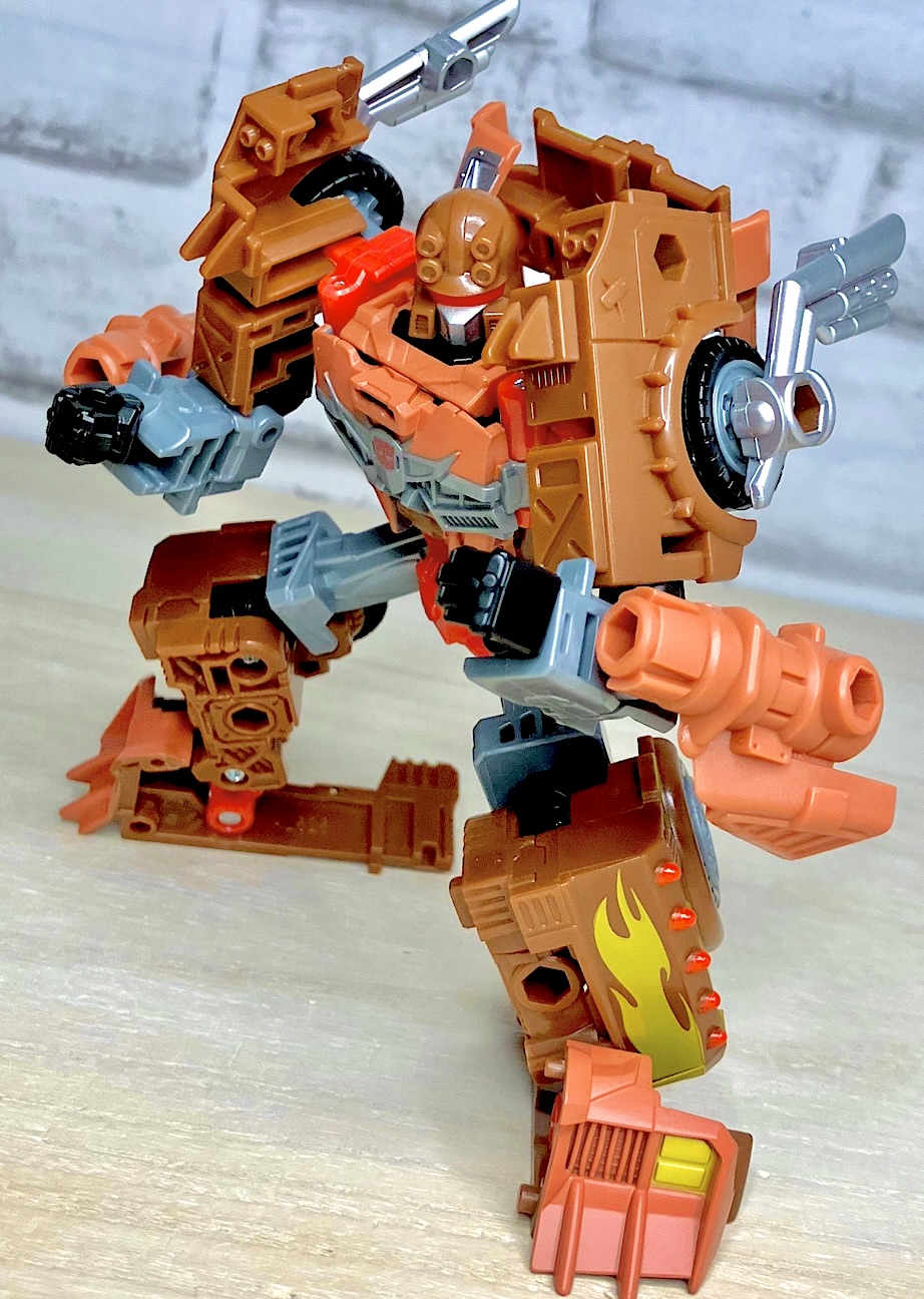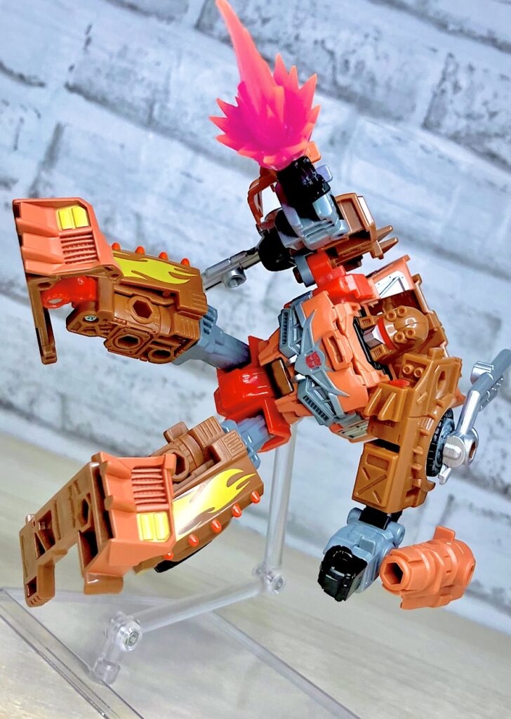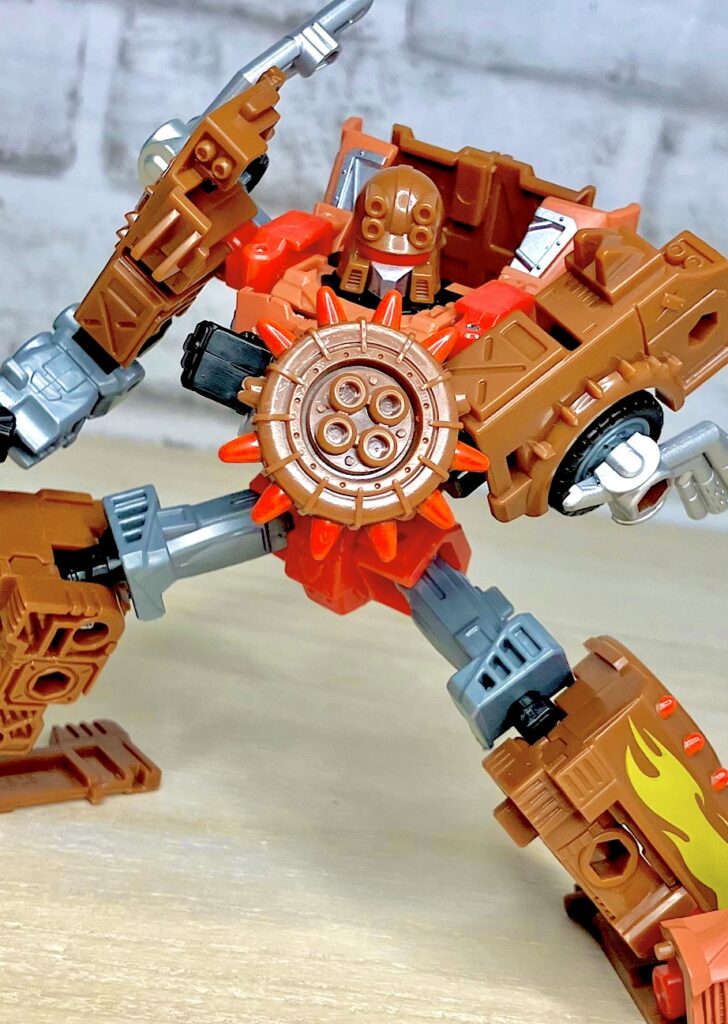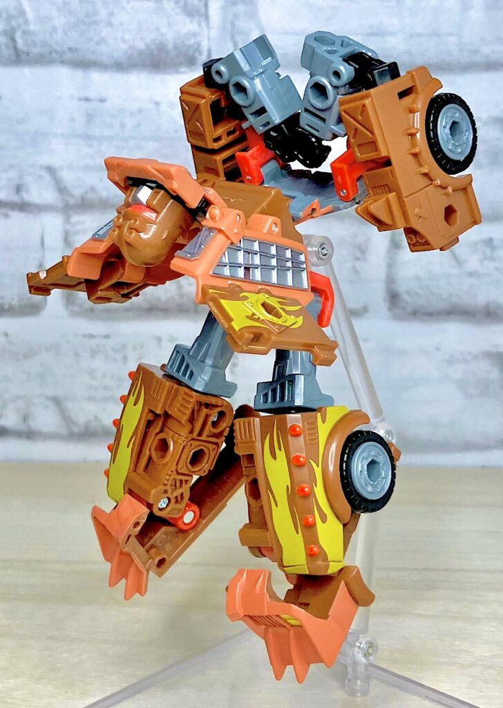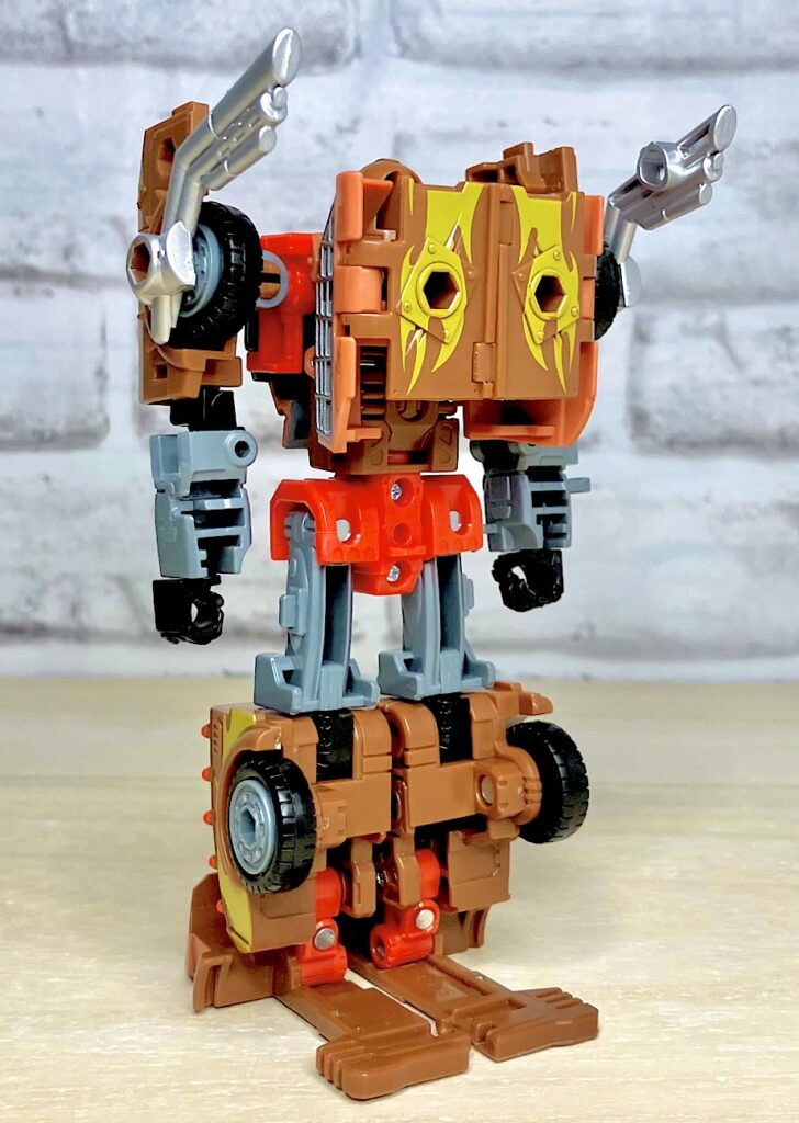 【ロボットモード】型としてはアクセルグリースで、寒色系だったカラーリングをいわゆるジャンキオンカラーに変更。さらに頭部はトゥライン、一部パーツはスクラップフックからと、ごちゃ混ぜ流用アイテムになっています。というかこの型使いまわされすぎなんですよね…。