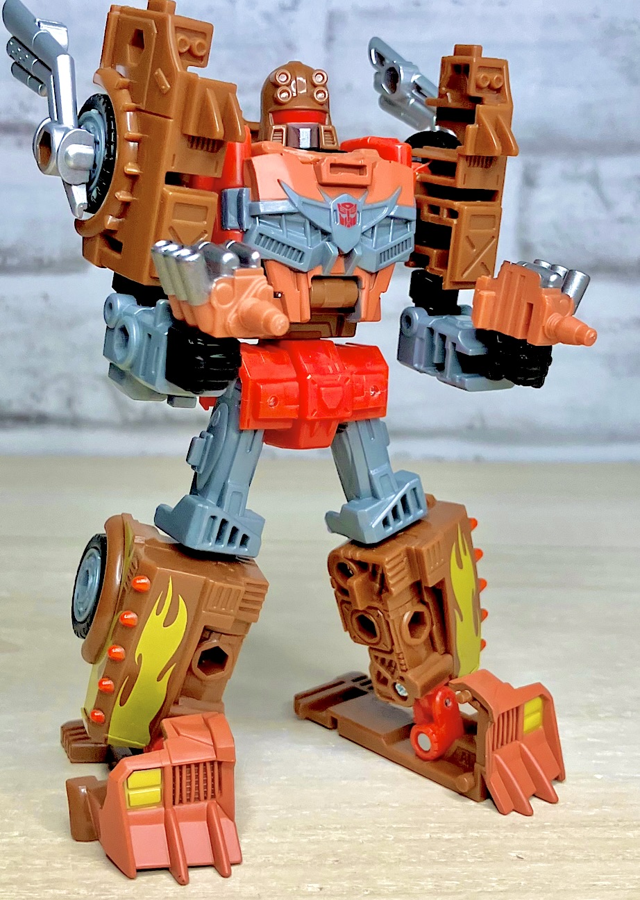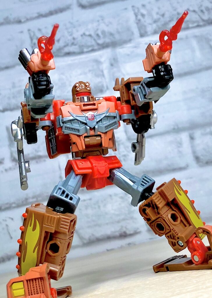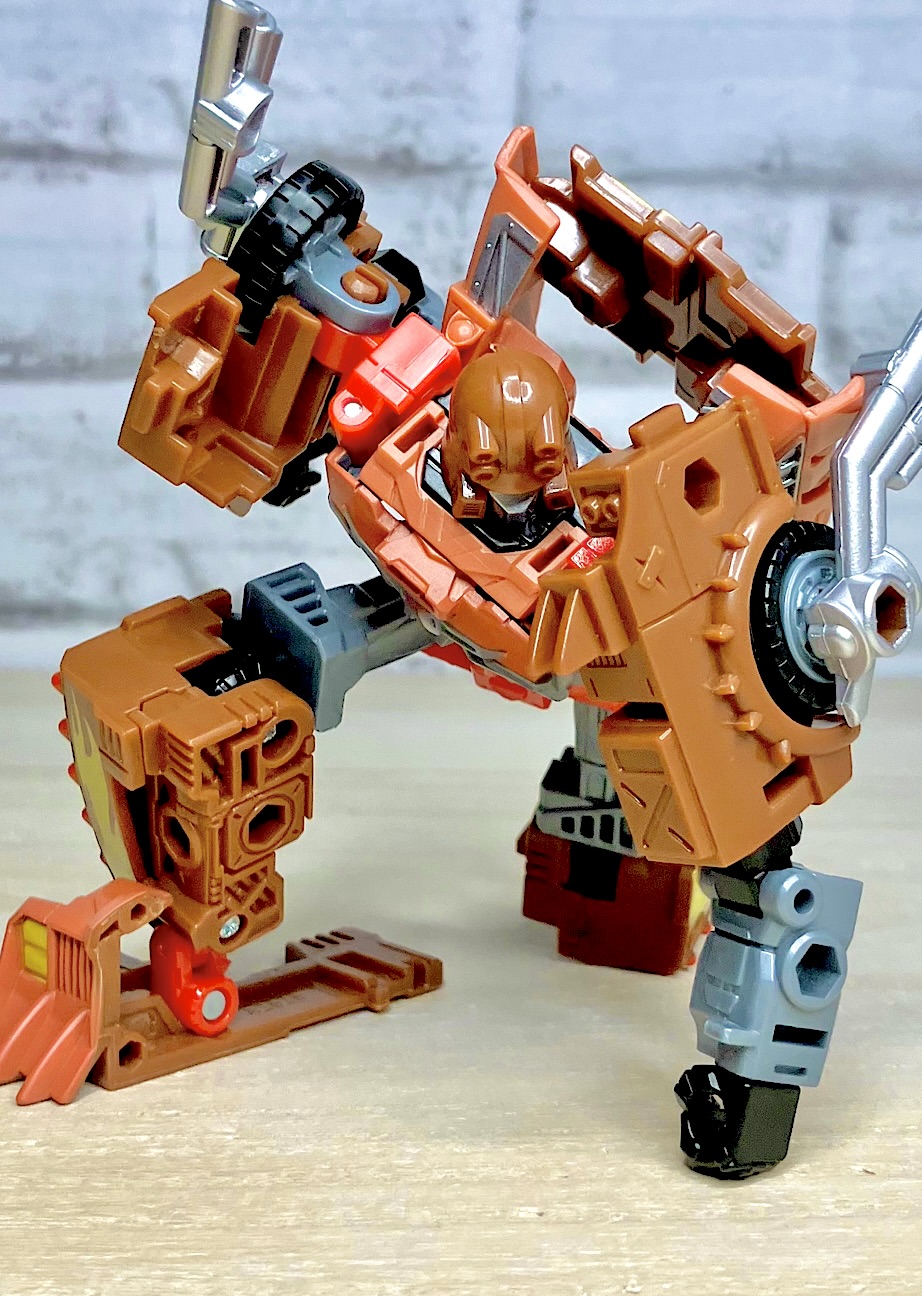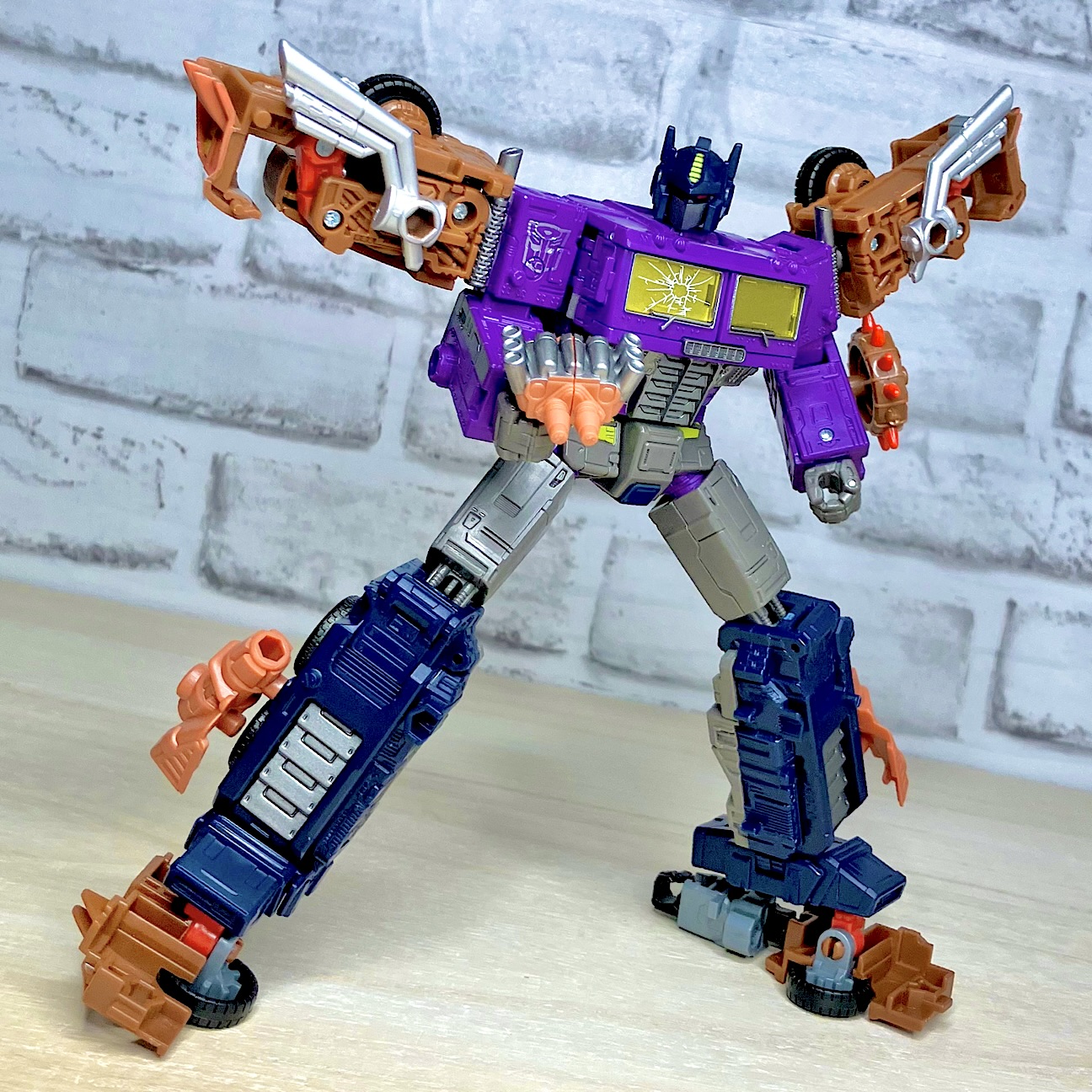 【ロボットモード】型としてはアクセルグリースで、寒色系だったカラーリングをいわゆるジャンキオンカラーに変更。さらに頭部はトゥライン、一部パーツはスクラップフックからと、ごちゃ混ぜ流用アイテムになっています。というかこの型使いまわされすぎなんですよね…。