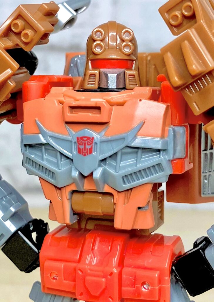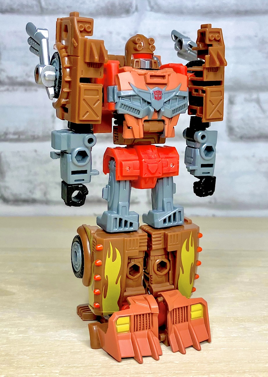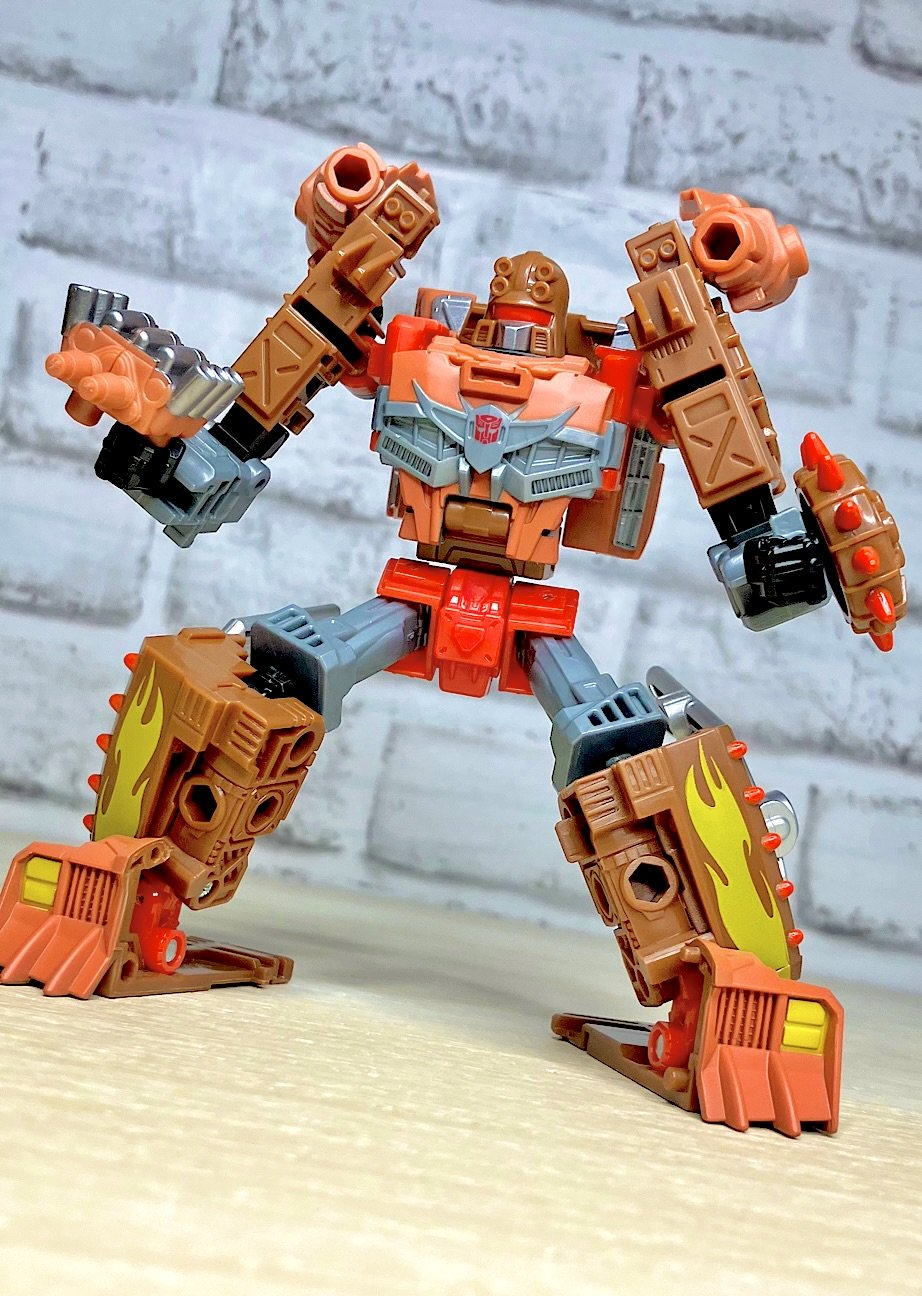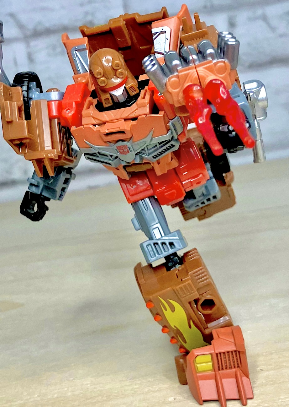 【ロボットモード】型としてはアクセルグリースで、寒色系だったカラーリングをいわゆるジャンキオンカラーに変更。さらに頭部はトゥライン、一部パーツはスクラップフックからと、ごちゃ混ぜ流用アイテムになっています。というかこの型使いまわされすぎなんですよね…。