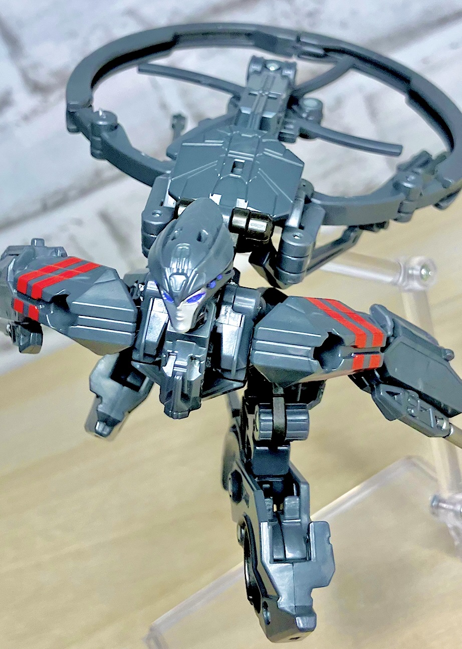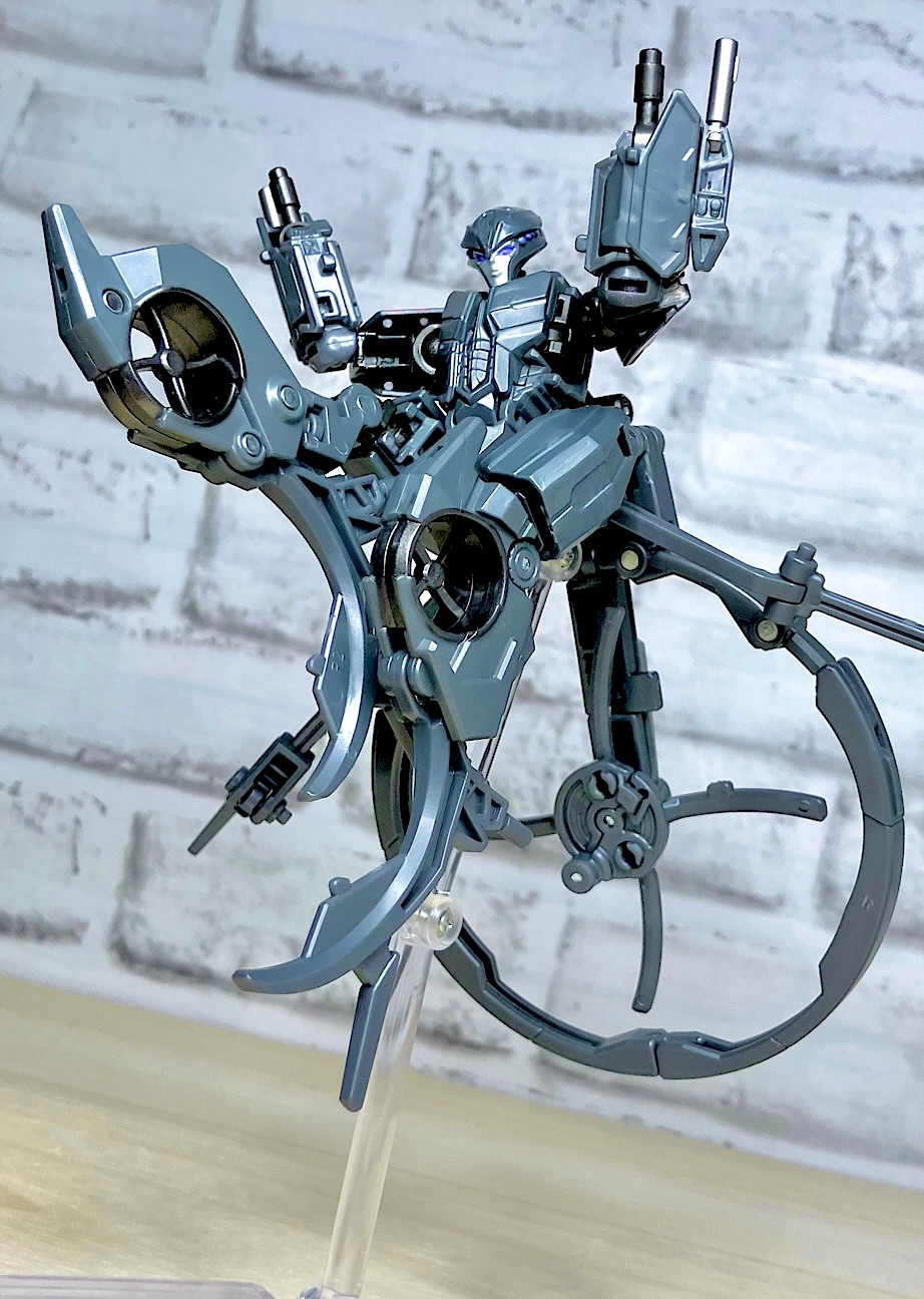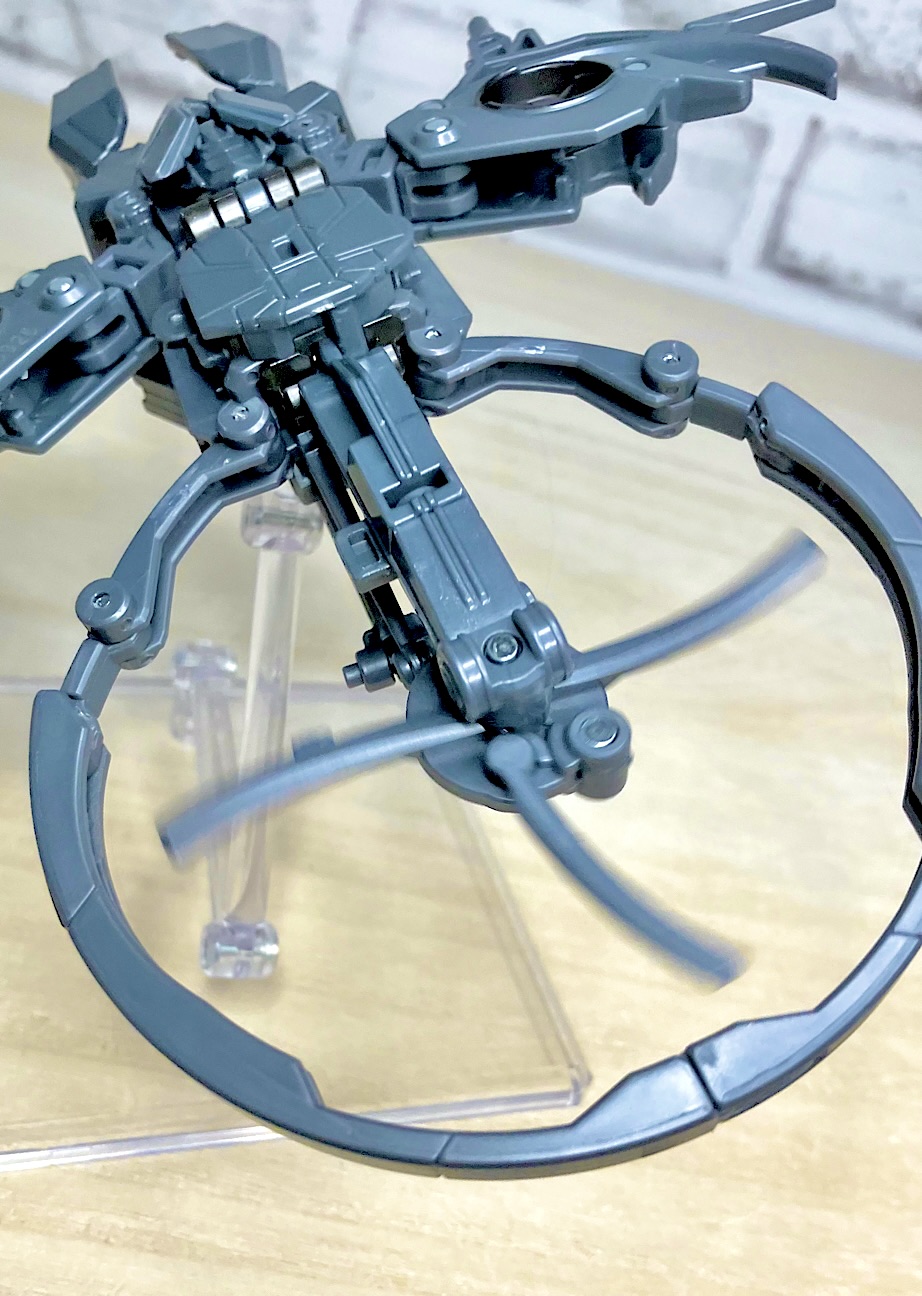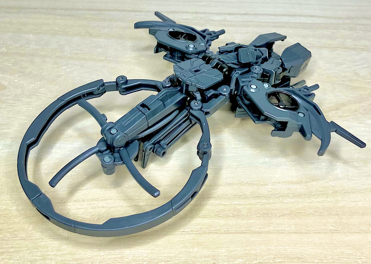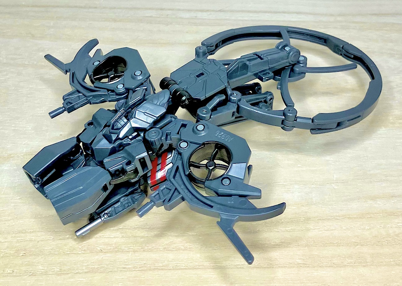 【変形】初見は36ステップでこまごましたパーツ移動が続く手ごわい変形なのですが、全体像がわかってしまうと意外と単純。スパイダーアームが組み合わさってローターが出来上がるところなんかは圧巻で、細いパーツなのにカッチリ決まっていくのがプロダクトとしてよくできてます。