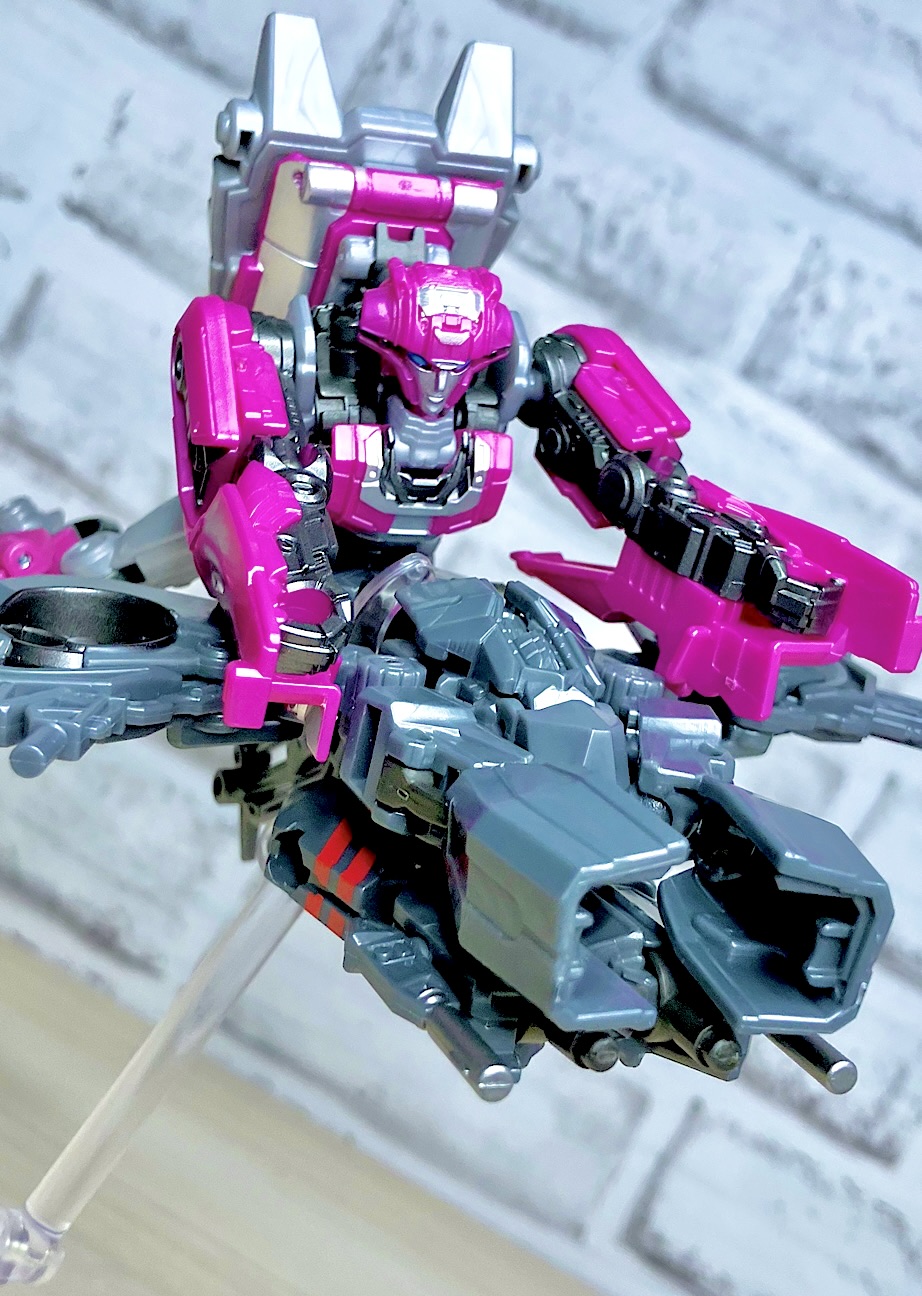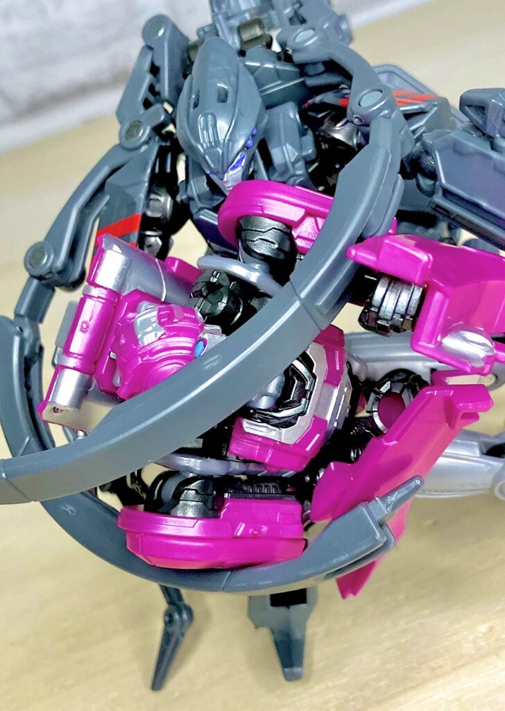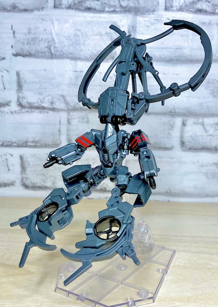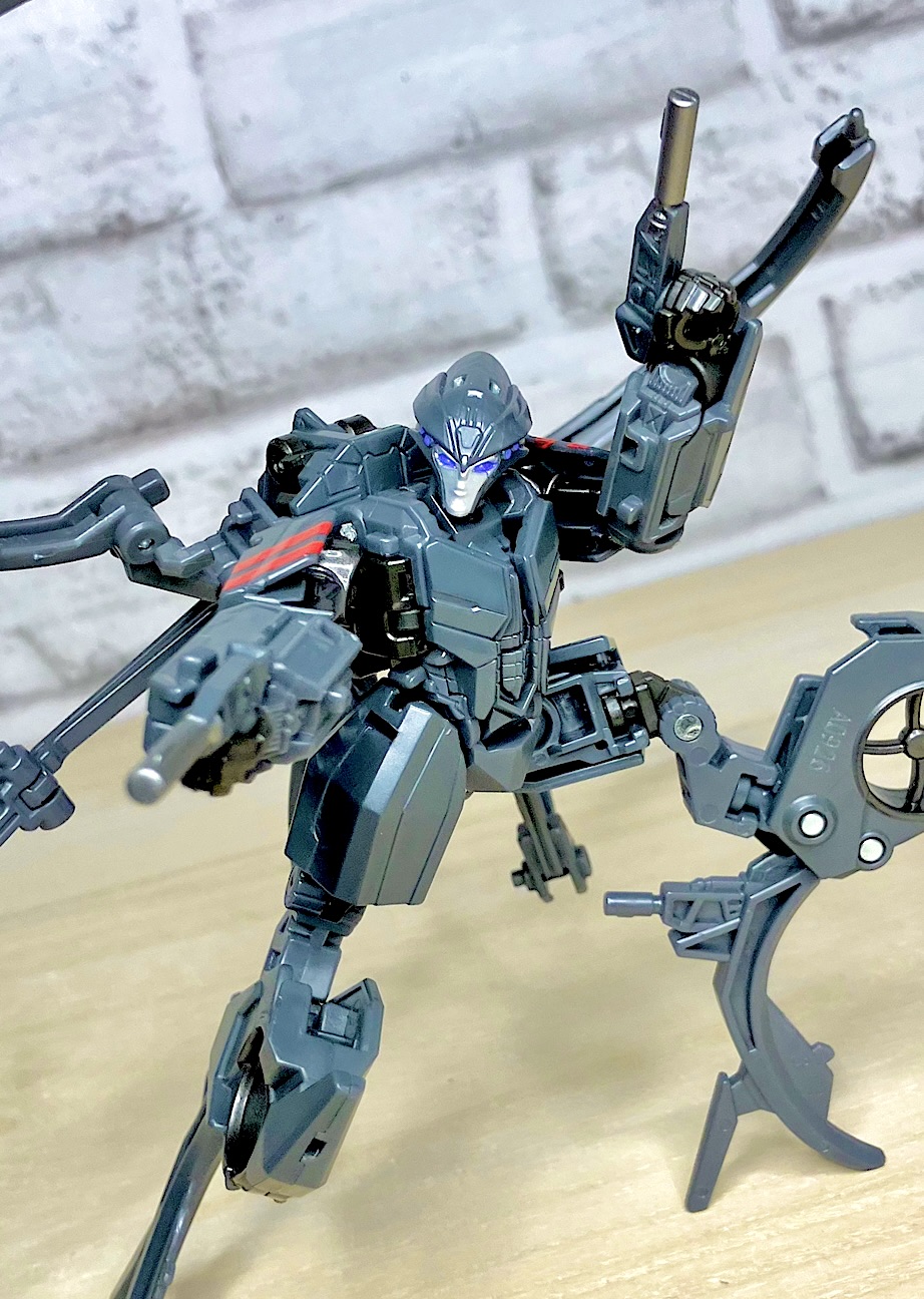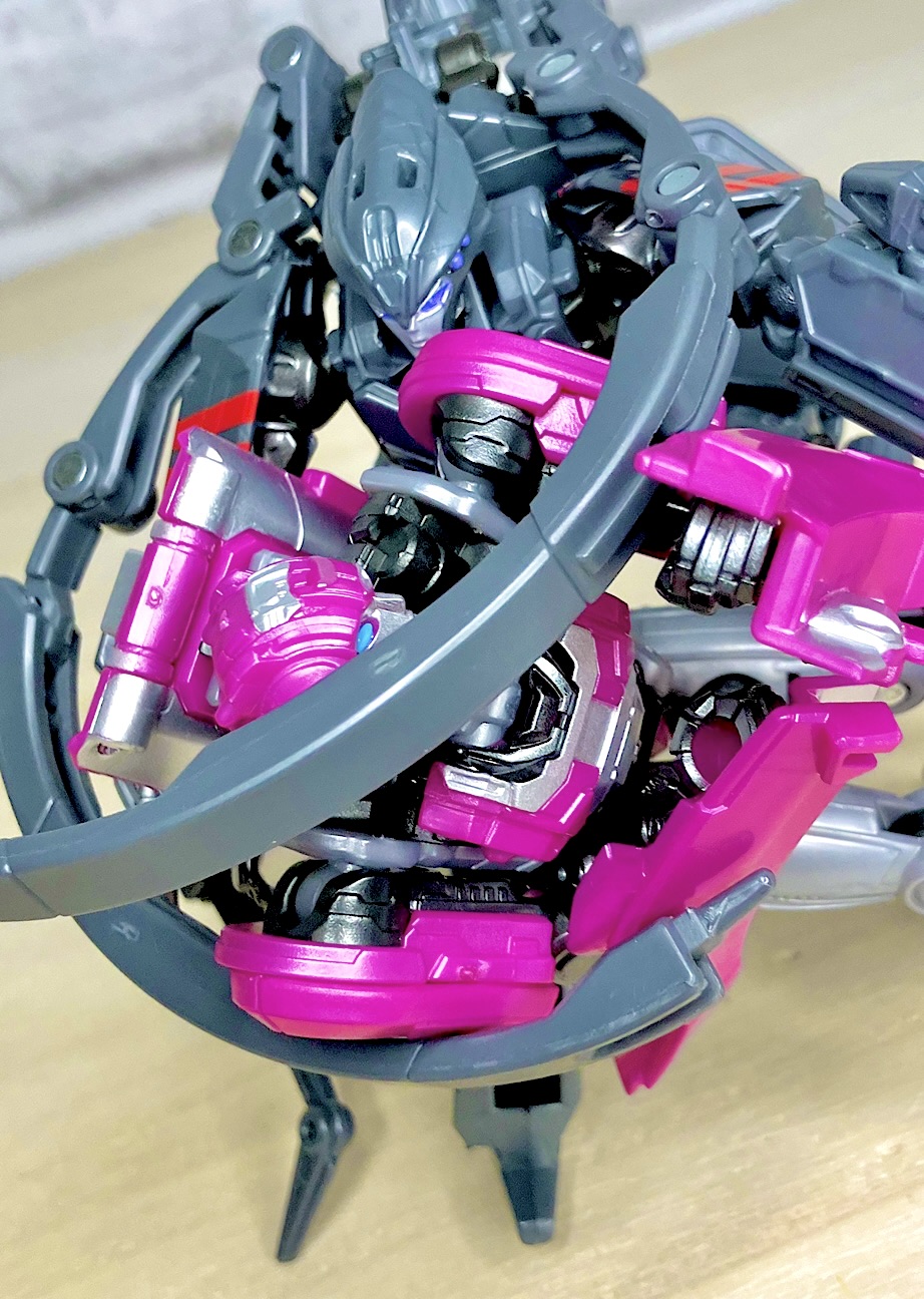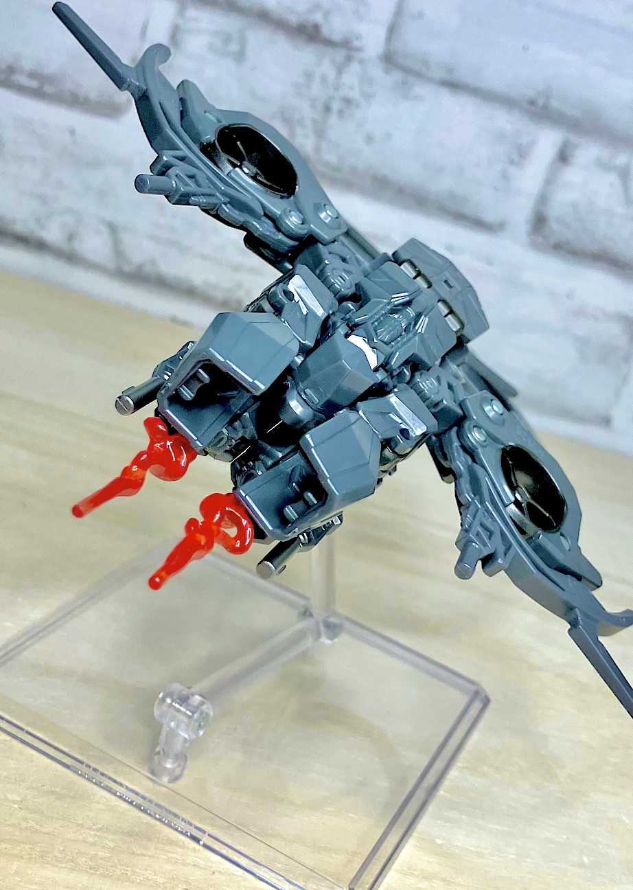 【変形】初見は36ステップでこまごましたパーツ移動が続く手ごわい変形なのですが、全体像がわかってしまうと意外と単純。スパイダーアームが組み合わさってローターが出来上がるところなんかは圧巻で、細いパーツなのにカッチリ決まっていくのがプロダクトとしてよくできてます。