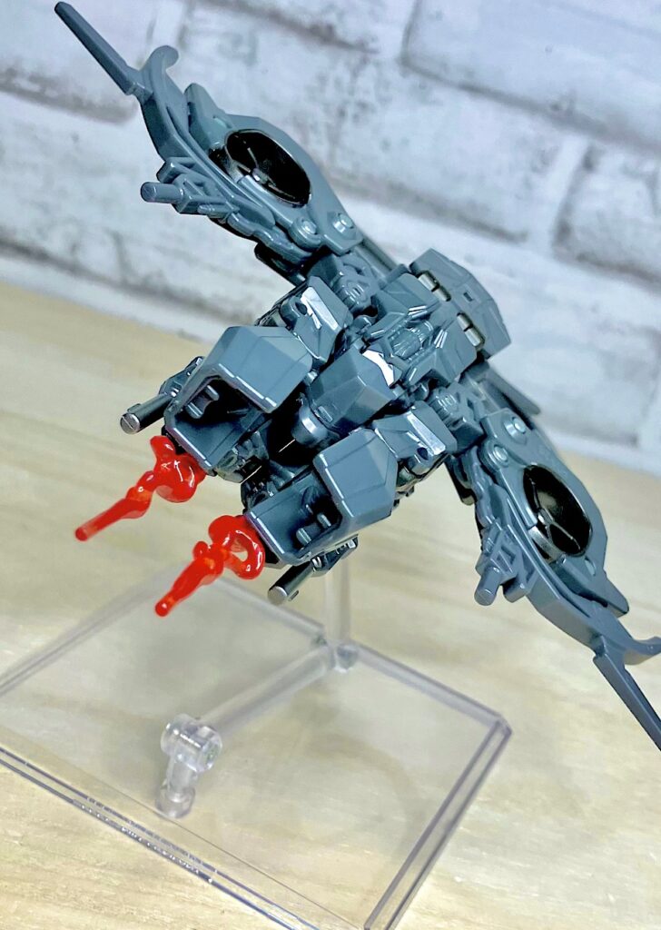 ネット上のコメントで見かけて自分でもやってみたトランスプレイなのですが、ビークルモードを崩してクモ脚を展開+主翼(?)をちょこちょこ曲げたりしてやるとメカクモっぽい形状にできます