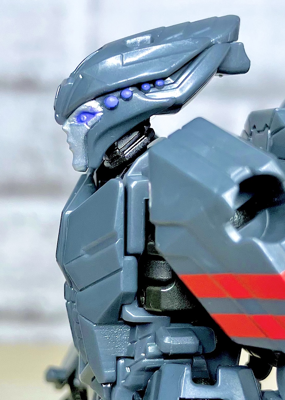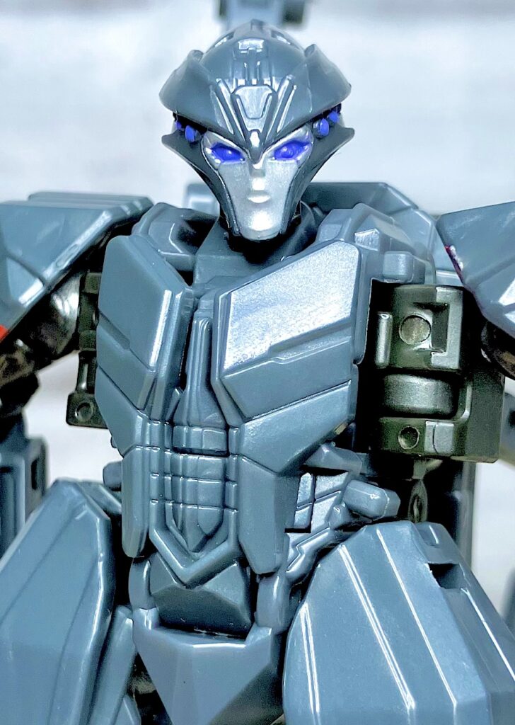 【アップ】冷酷な表情の頭部。小さいながらもなかなかの再現度です。プライムあたりから続く近年のTFらしいアッサリ気味デザインですね。