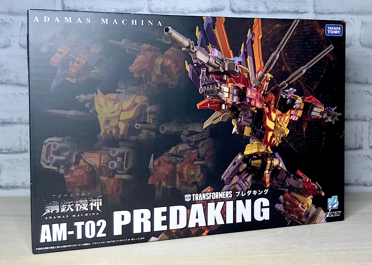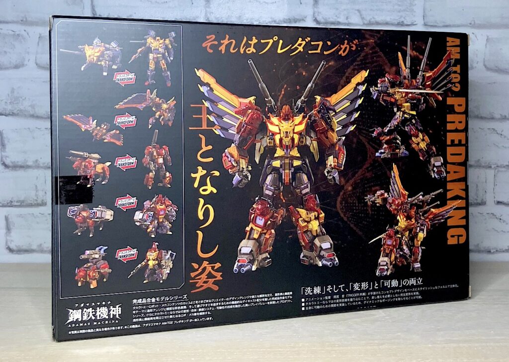 【パッケージ】タカラトミーのロボ•メカに新たな解釈を加え、造形美と機能美そして遊びやすさを追求した合金モデル「アダマスマキナ(鋼鉄機神)」。TF第2弾(商品数としては3つ目)は、なんとプレダキング!しかも5体のプレダコンからちゃんと変形合体できるやつ!雨宮哲氏によるハイディテールアレンジを加えた超絶美なデザインで、発表当初からにわかには信じ難い(合体しないんでしょ?とか、合体するにしてもそれぞれは変形しないよね?とか…)プロダクトでしたが、ホントに出てしまいました。