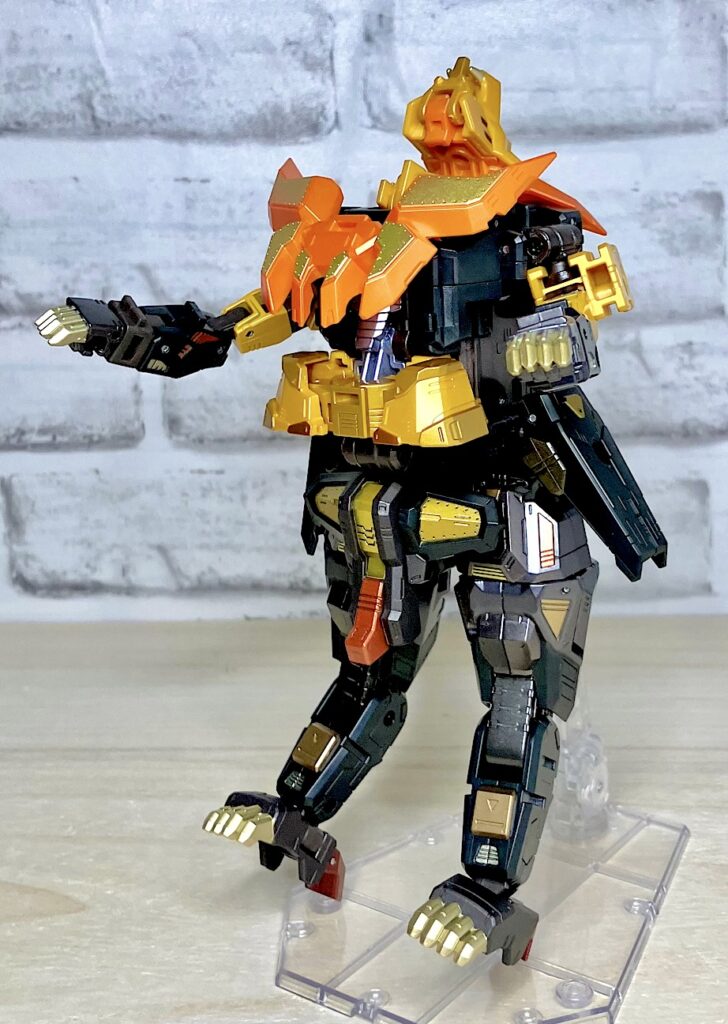 【ロボットモード】この見た目と質感でちゃんと変形しちゃいました!胴体が大きいドスコイ体型は合体のしわ寄せかな。慣れてくるとサイズの大きい大鎧を着ているみたいで、むしろカッコよく見えてきます。