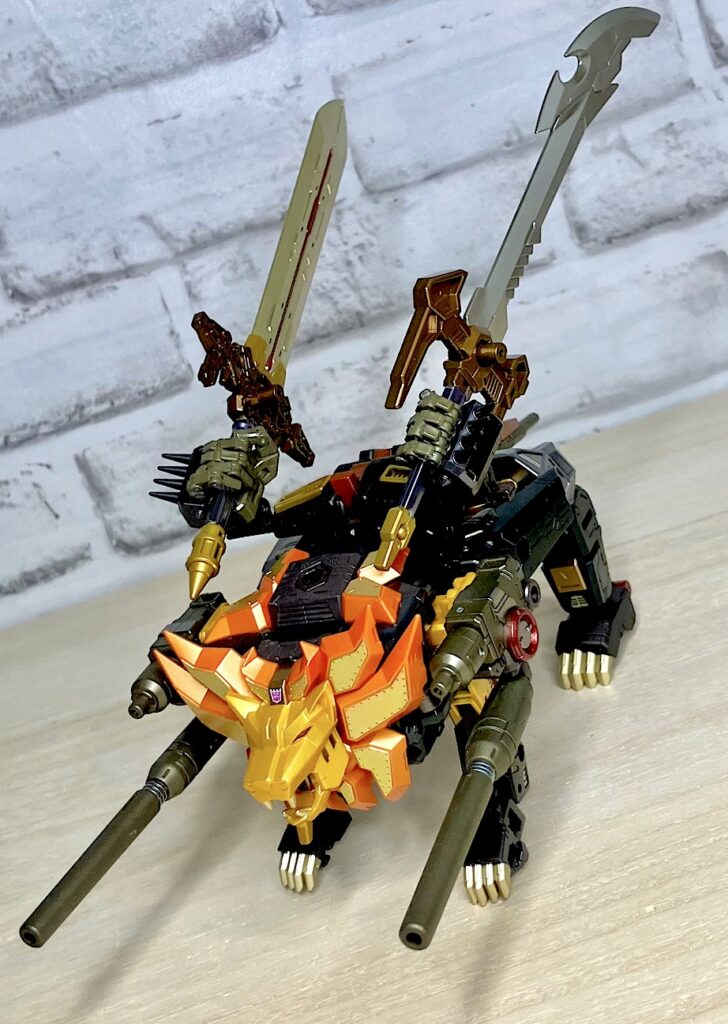 【ビーストモード】まずはパッケージから出したビーストモードから見ていきましょう。プレダコンのリーダーで、虎視眈々と獲物を狙い一撃で仕留めるタイプの武人。アダマスマキナらしいツヤのあるメタリックな質感で、高級感が半端じゃないです。合金もちゃんと使われていて、手に持った時にズッシリ。ライオンとしての体型にはやや崩れがありますが、そんなことは気にならないくらいの貫禄ある佇まい!