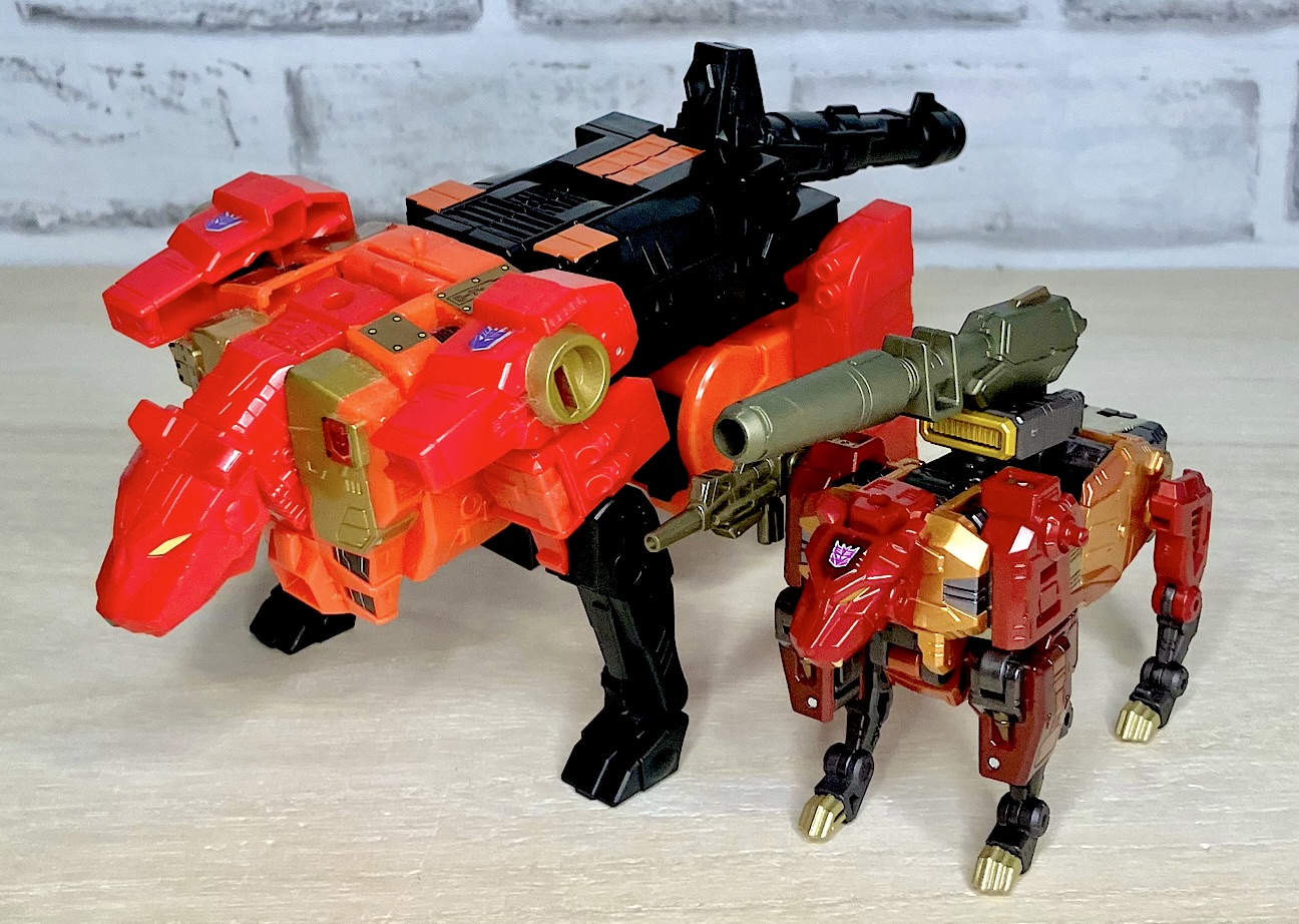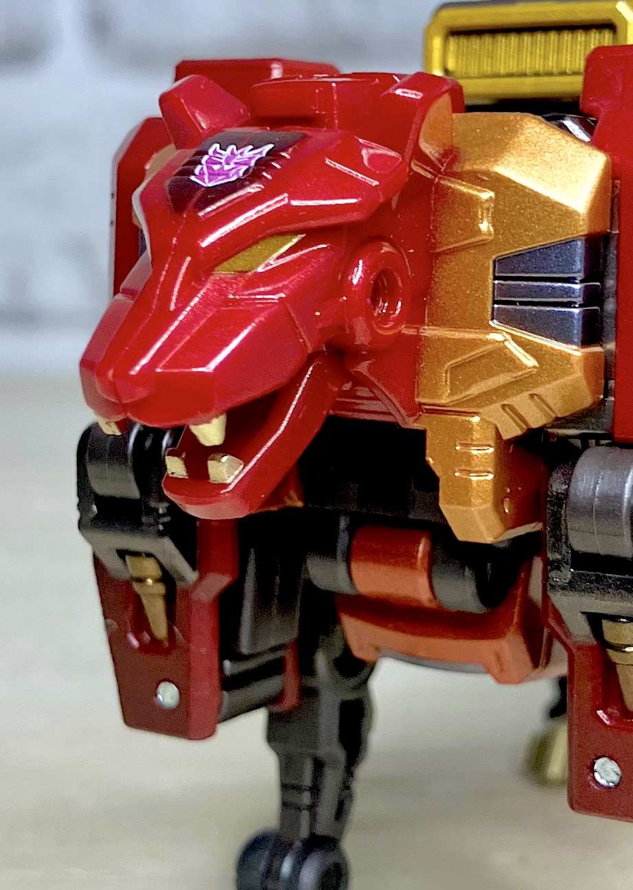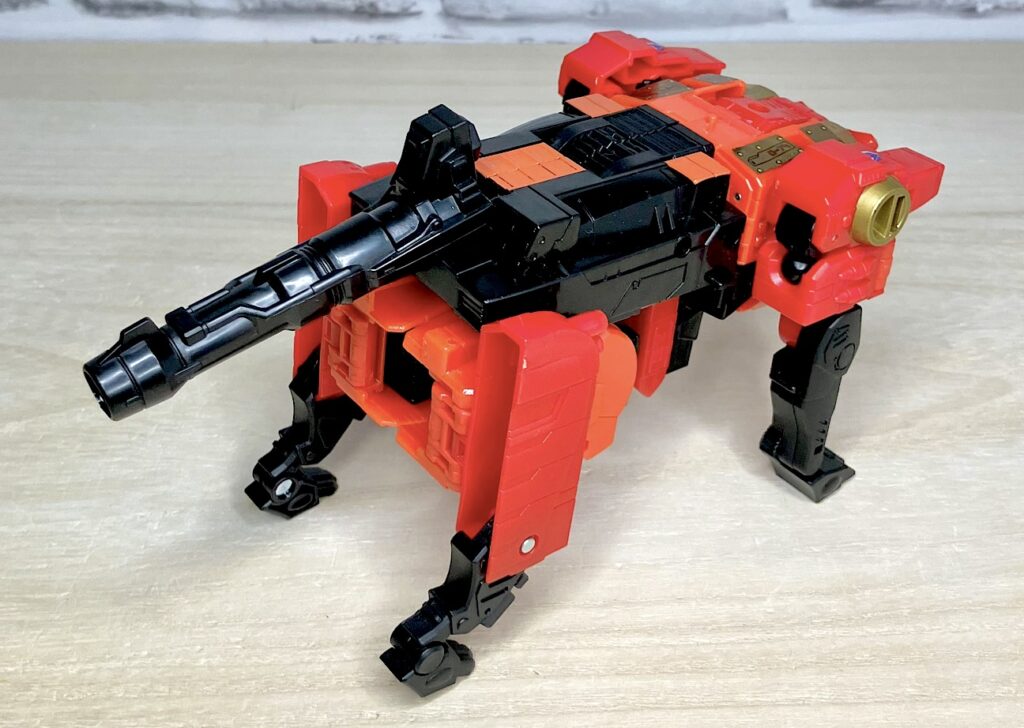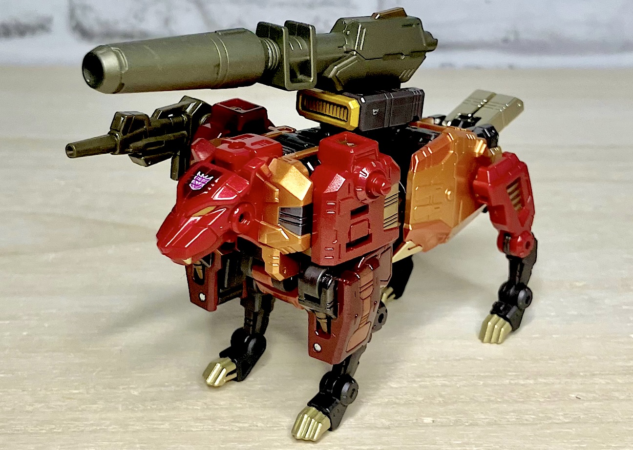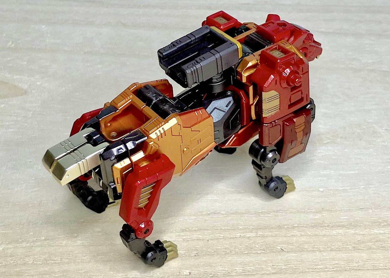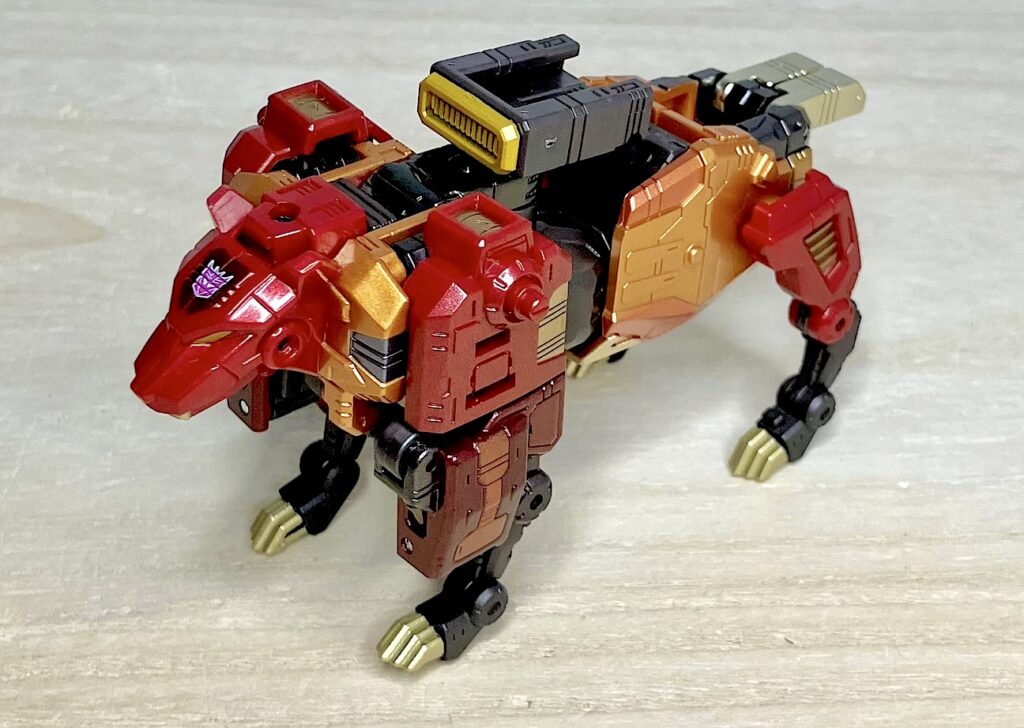 【ビーストモード】ランページから。あえてのG1ライクなレトロダサさを保ったままリメイクされたPOTPプレダコン。おそらくリアルタイムでアニマトロンを手にとった時の感触に近いものがあったのではないでしょうか。それでもランページは比較的ジャガー(だよね!?)らしいしなやかな体型をしたビーストモードで、動物メカとしての完成度は高めだと思います。