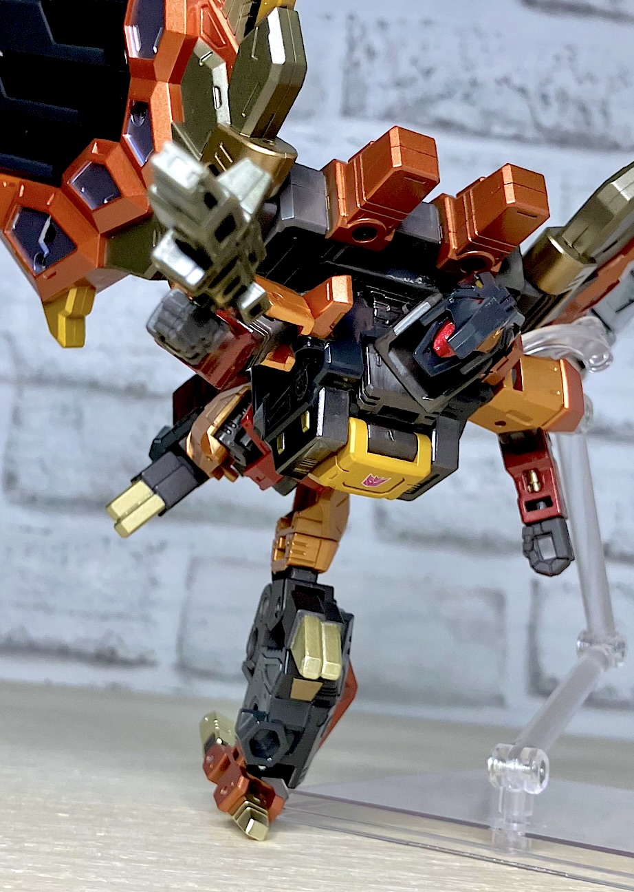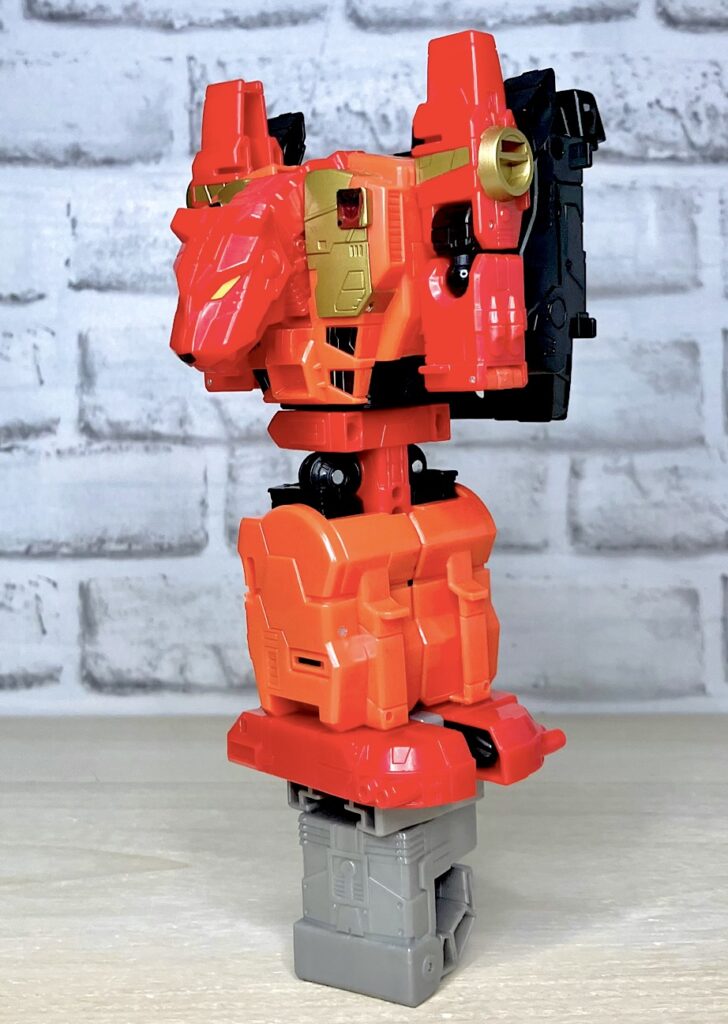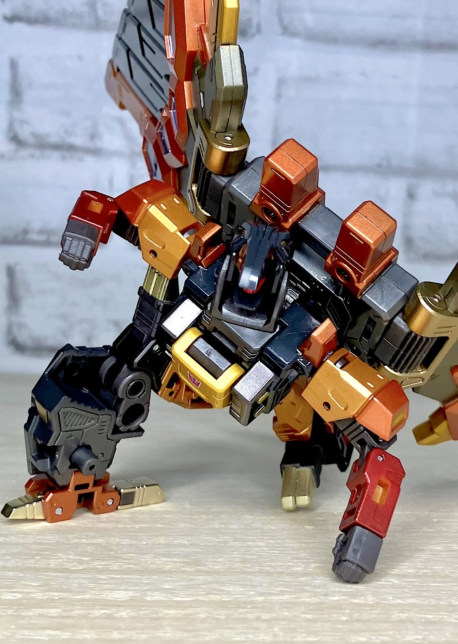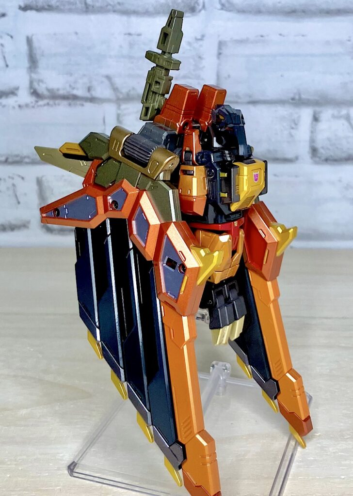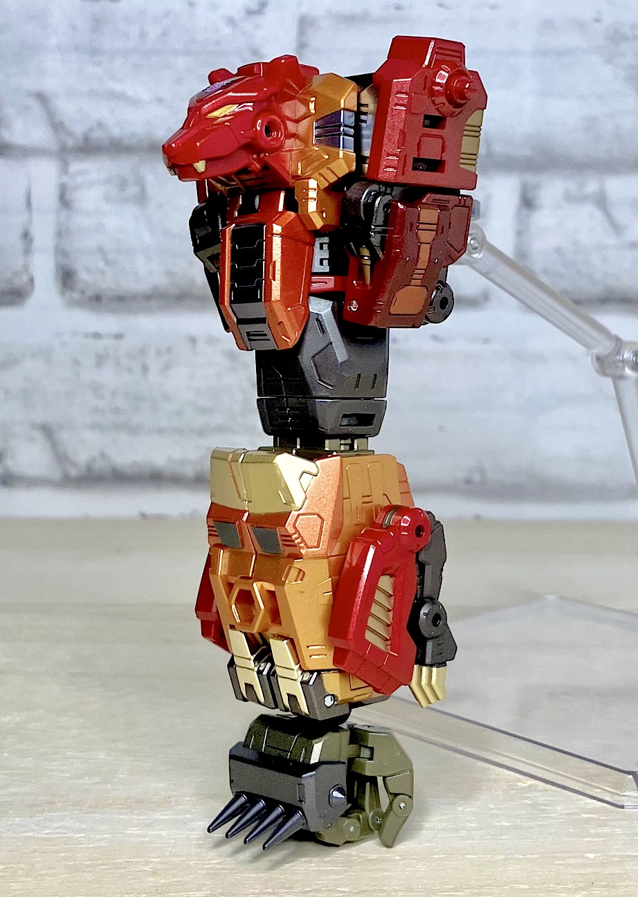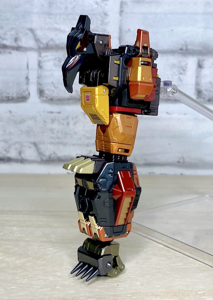 【合体モード】POTP版はプレダキングの左右が反転しており、ランページは左腕に変形。これはG1当時、アニメとトイで左右反転していたため。両者間の連携がうまくいってなかったのでしょうか。POTP 版はアニメ合わせの配置となっております。