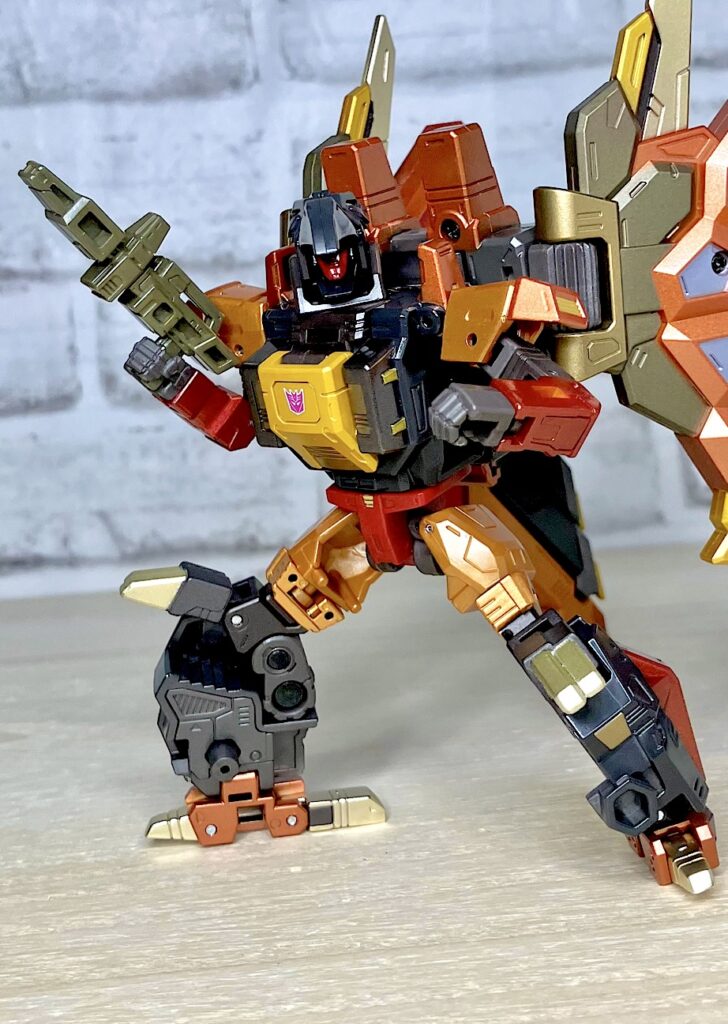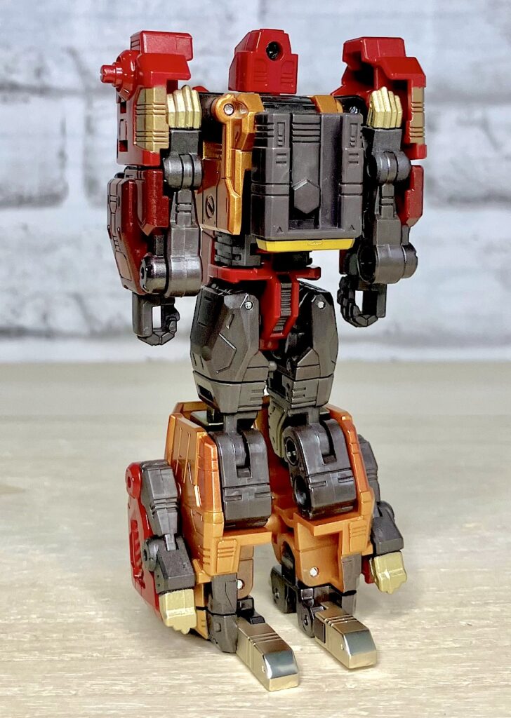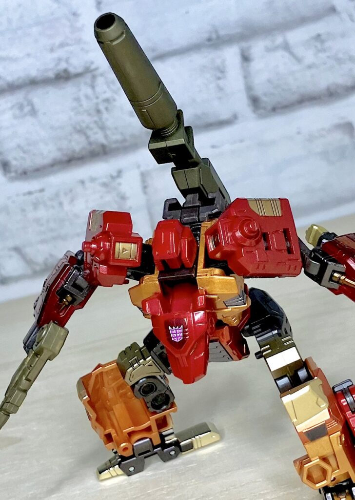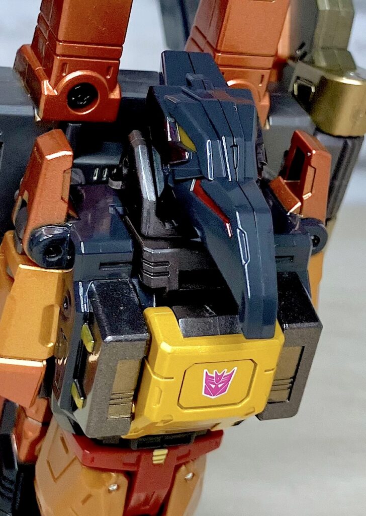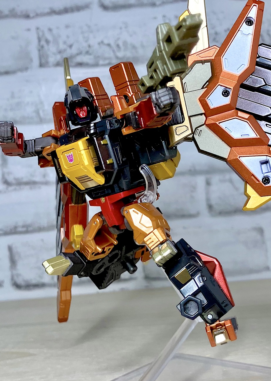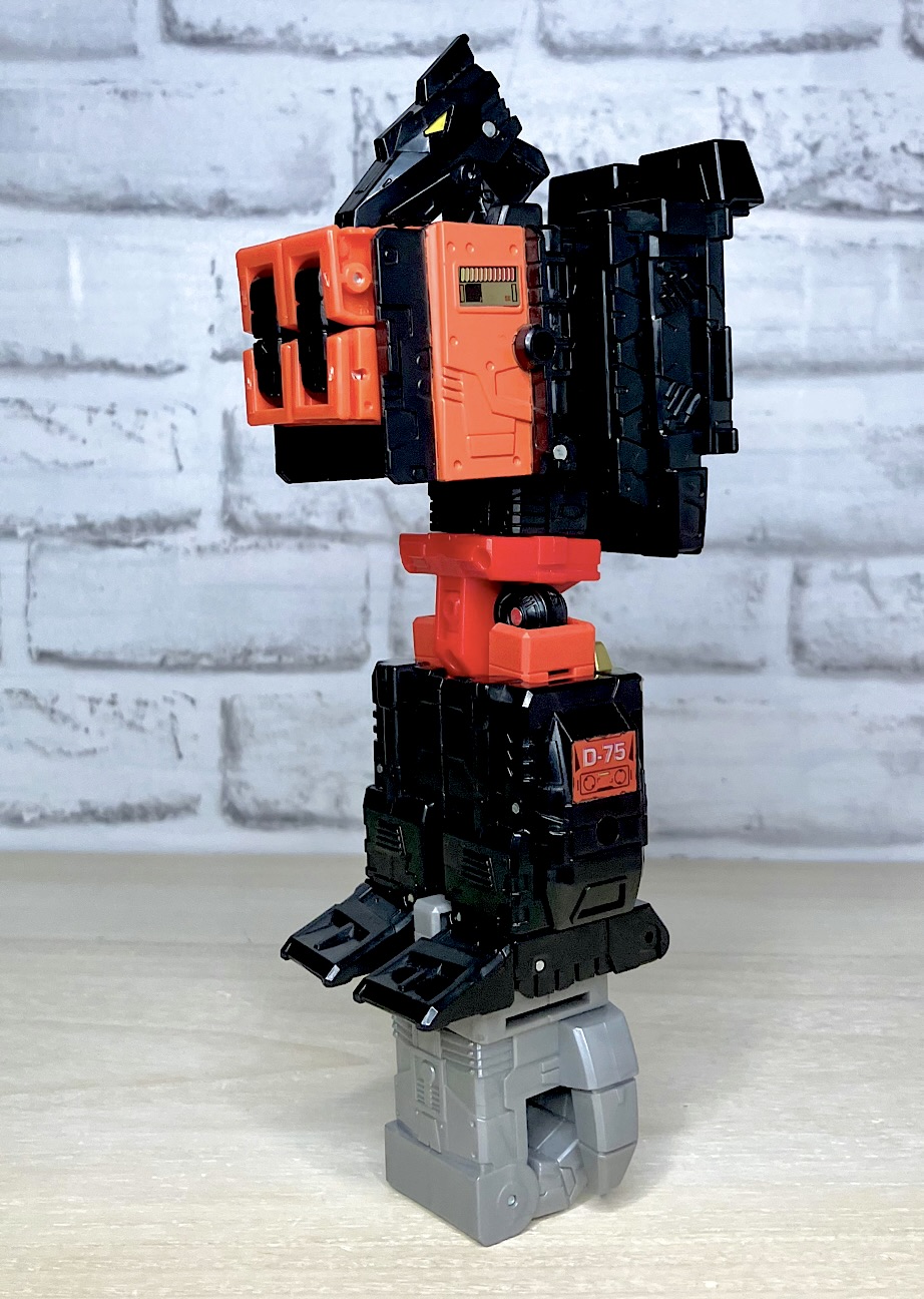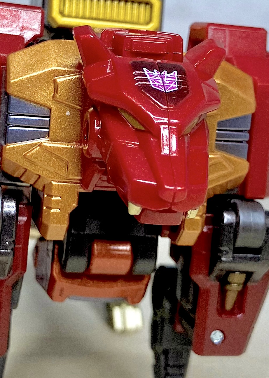 【合体モード】POTP版はプレダキングの左右が反転しており、ランページは左腕に変形。これはG1当時、アニメとトイで左右反転していたため。両者間の連携がうまくいってなかったのでしょうか。POTP 版はアニメ合わせの配置となっております。