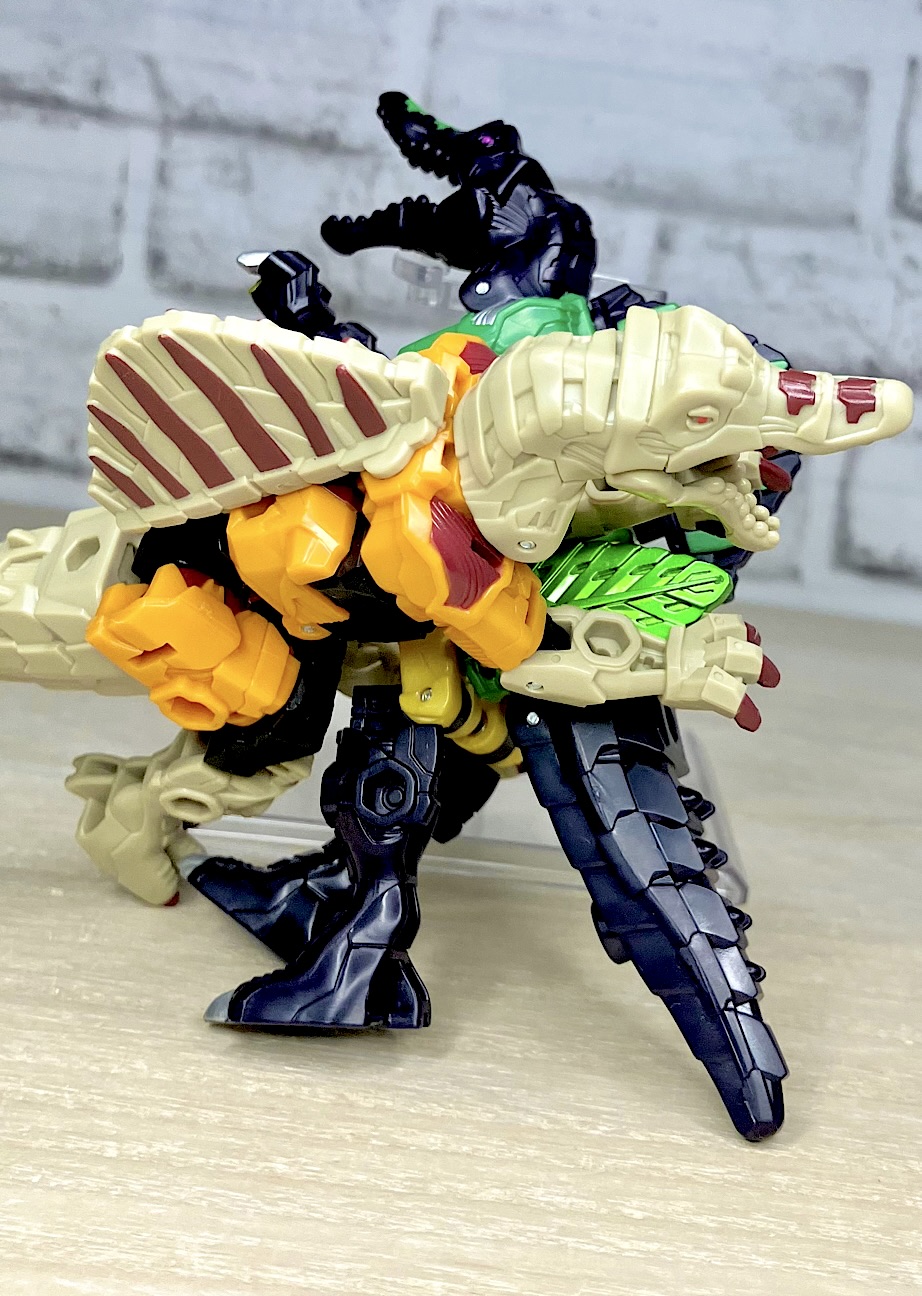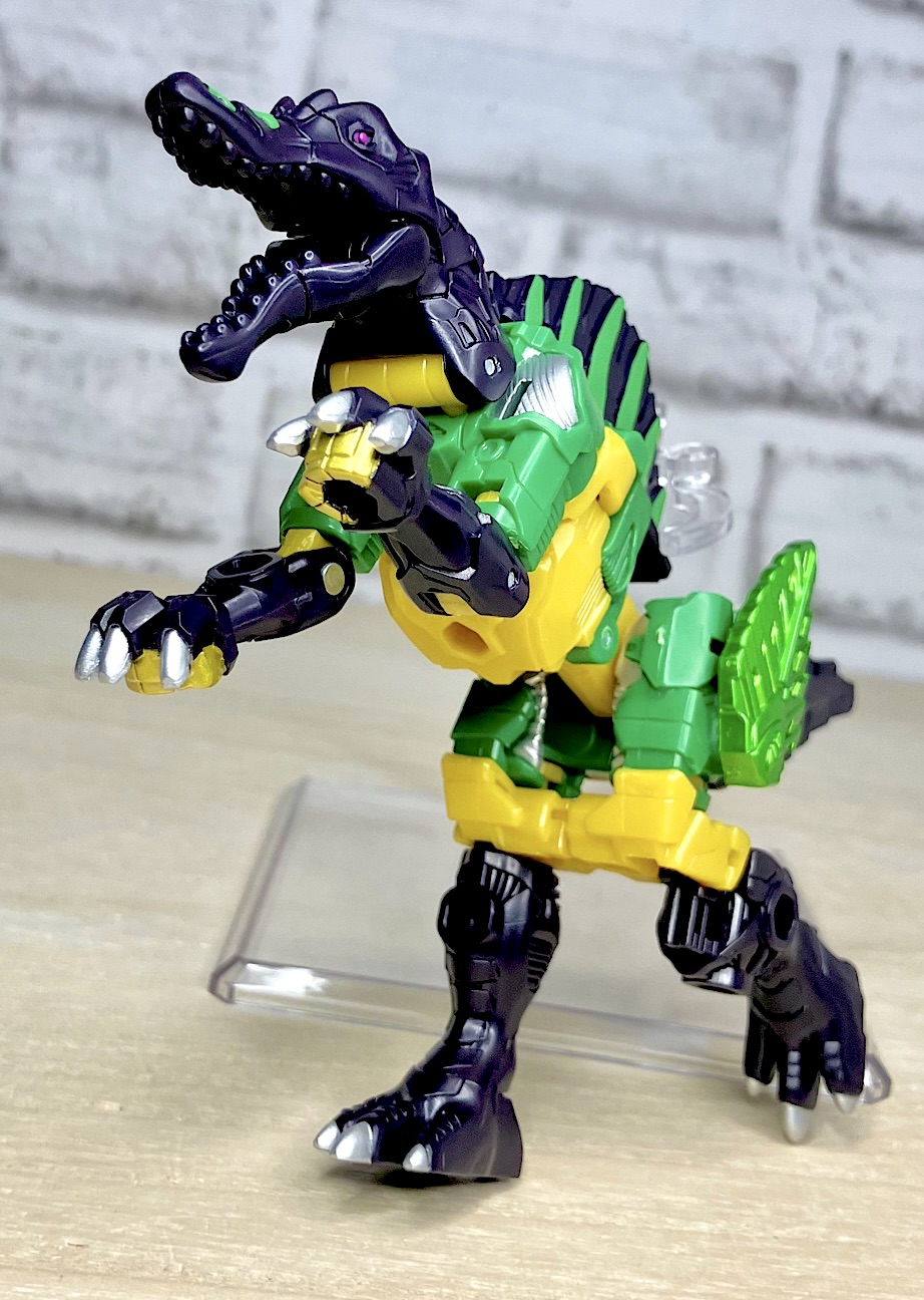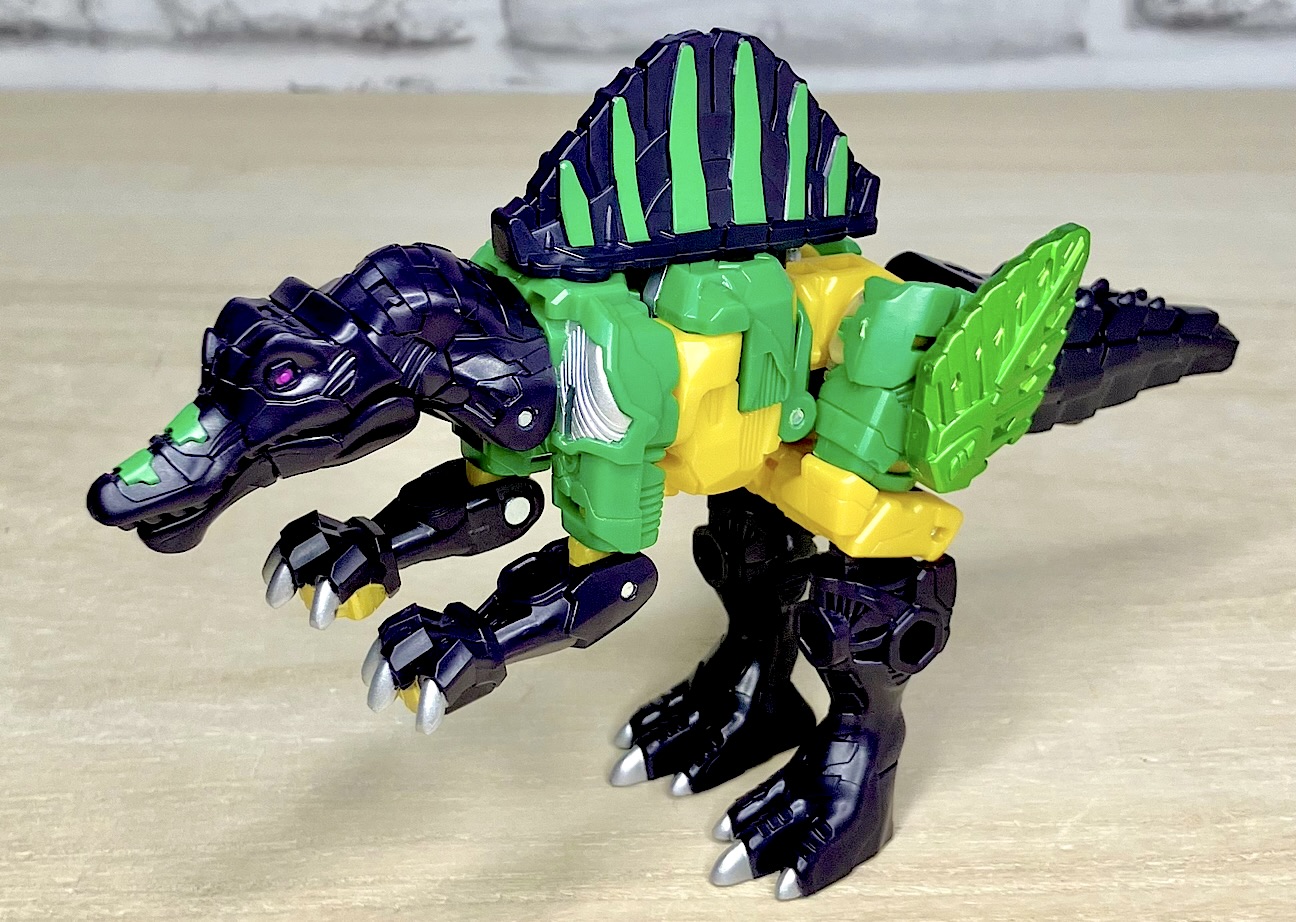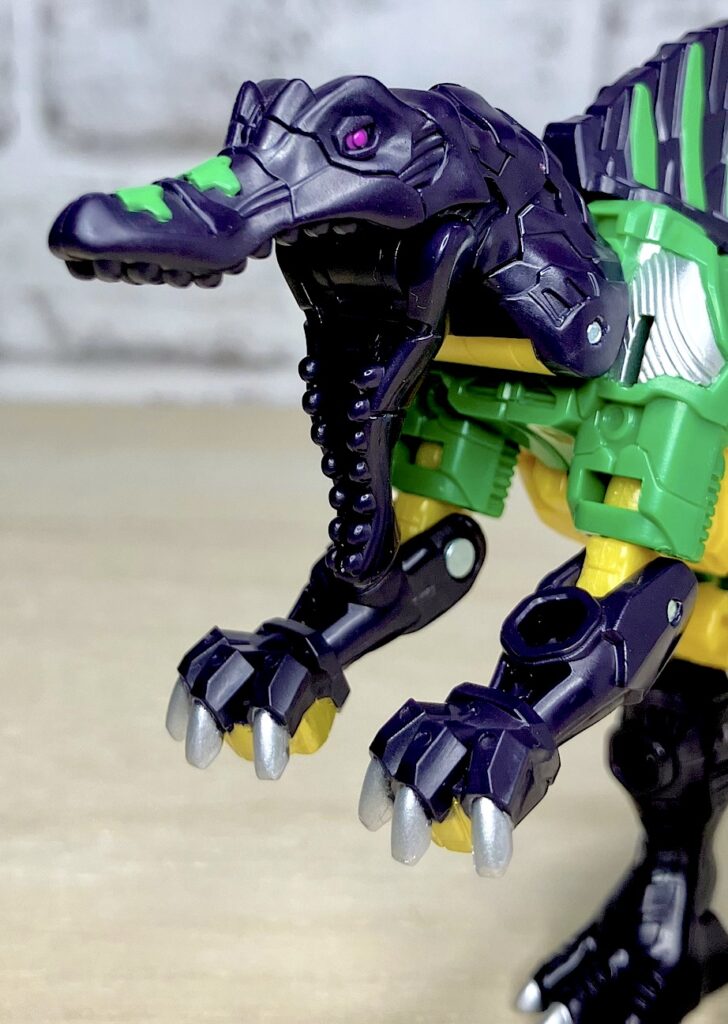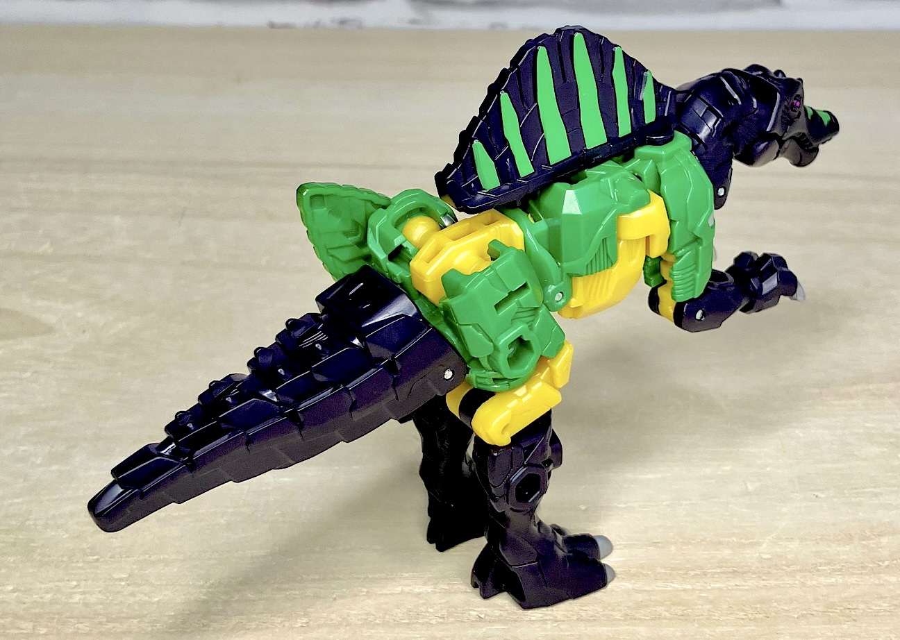 【ビーストモード】メカスピノサウルスに変形。背びれパーツによりボリュームはなかなか。ちなみに背中にはその背びれパーツが付いているので、エナジーは側面に付けます。