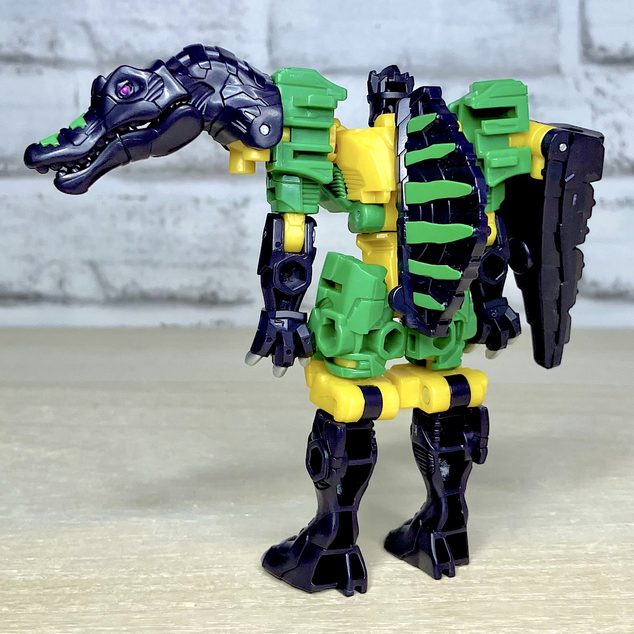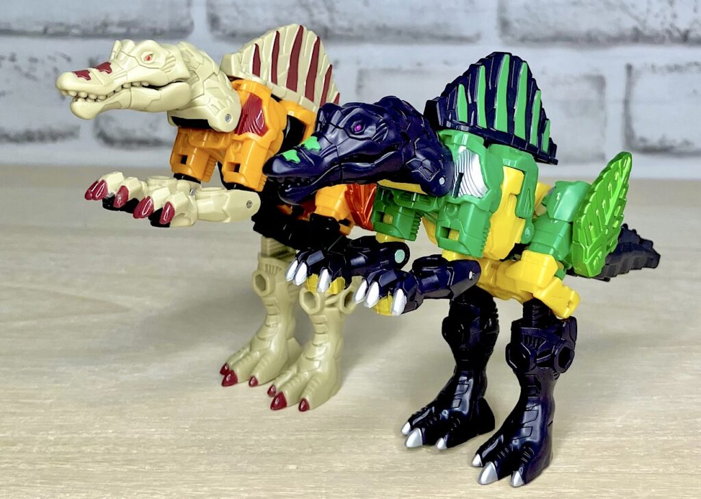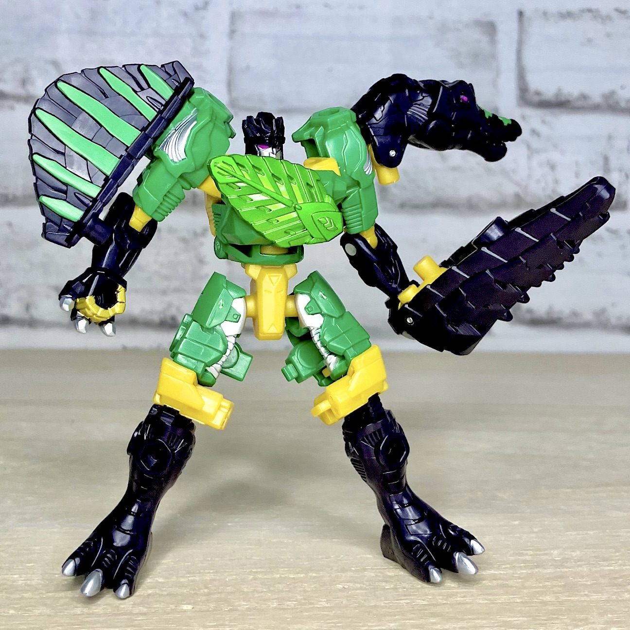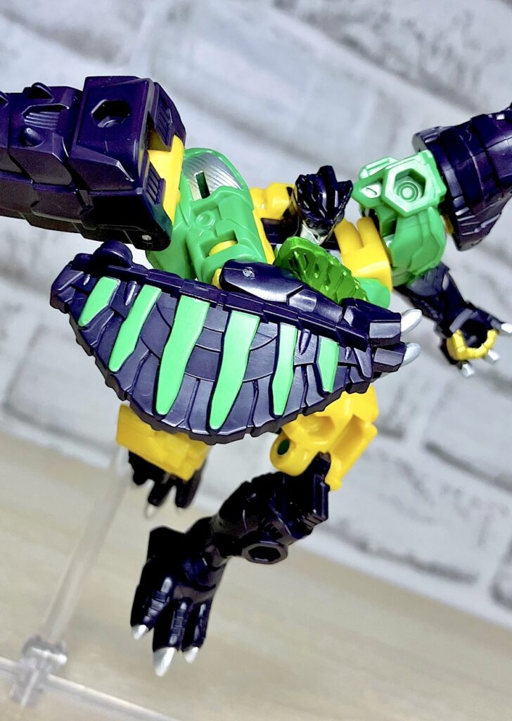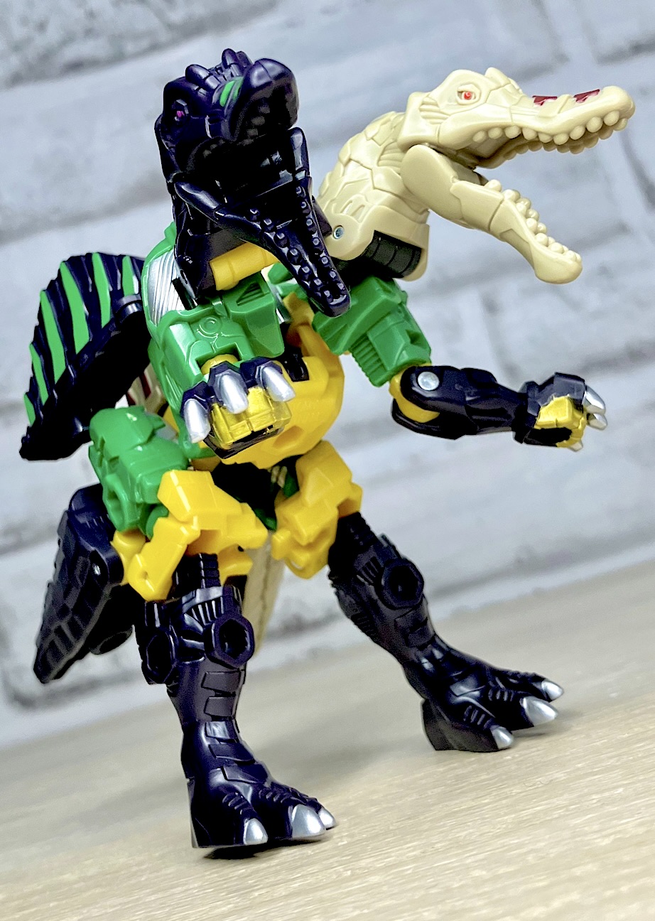 【ビーストモード】メカスピノサウルスに変形。背びれパーツによりボリュームはなかなか。ちなみに背中にはその背びれパーツが付いているので、エナジーは側面に付けます。