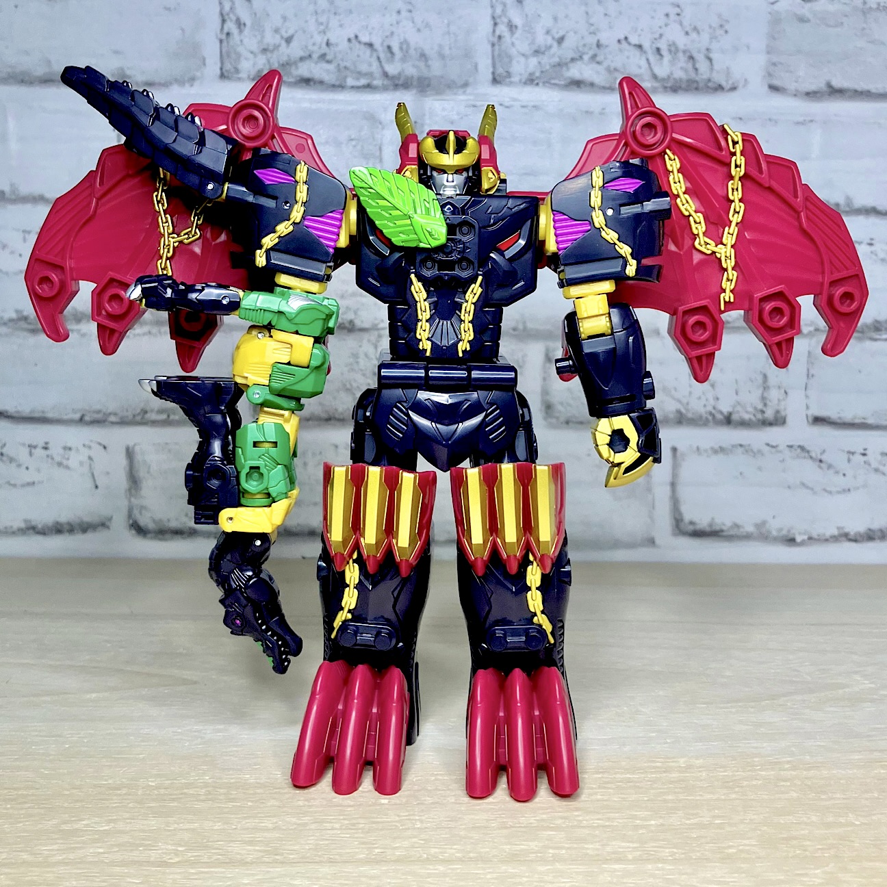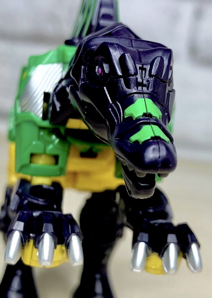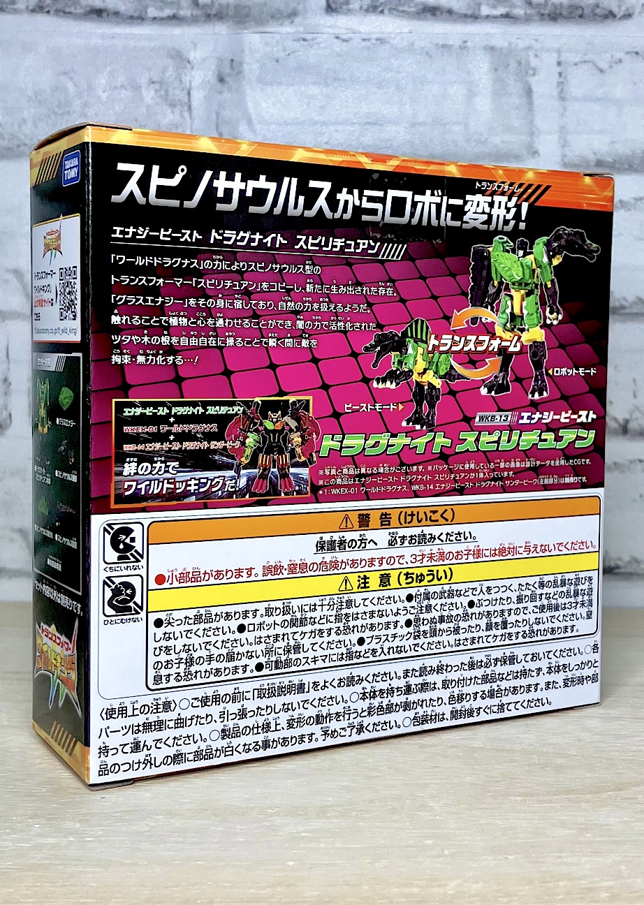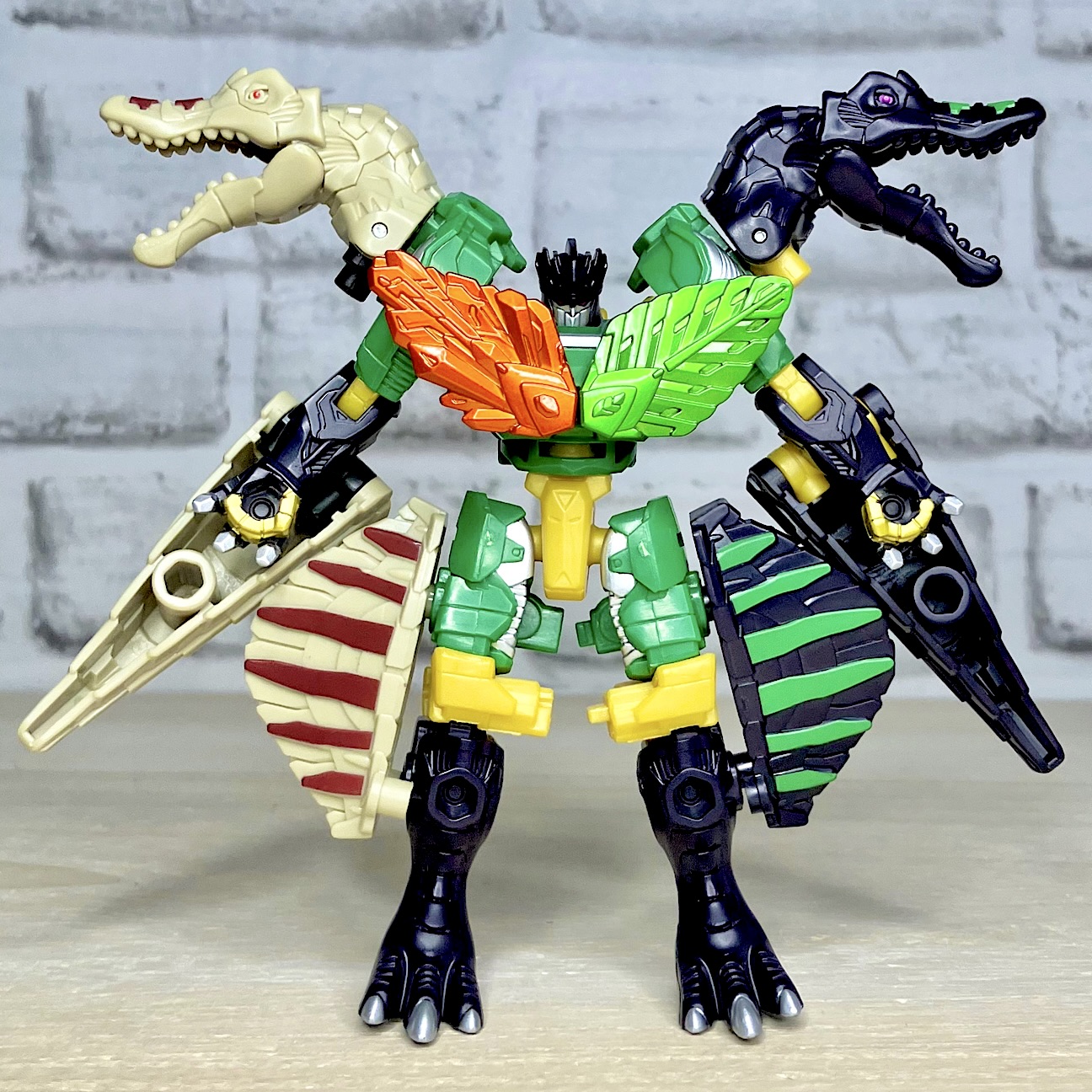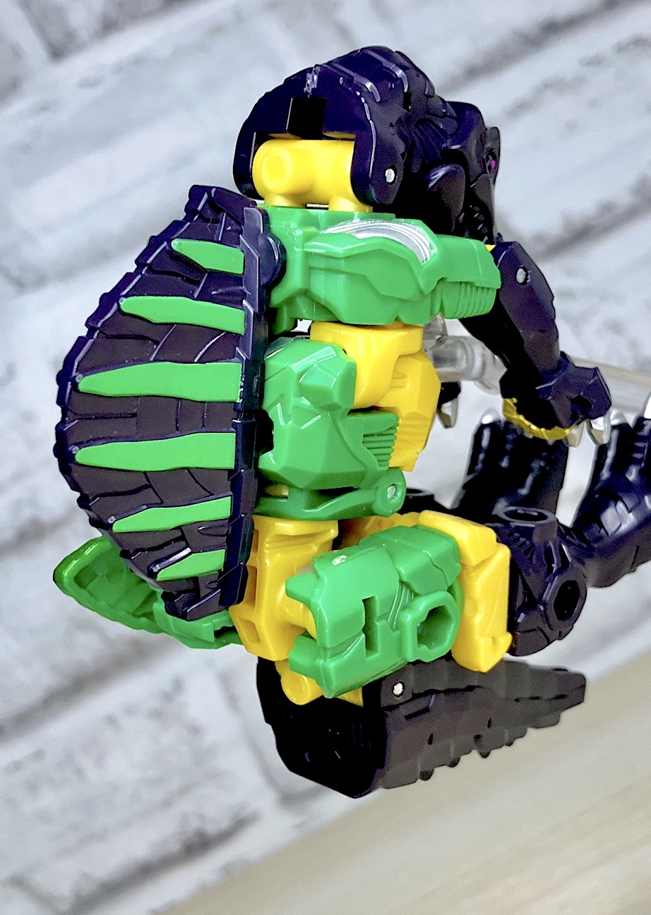 【ビーストモード】メカスピノサウルスに変形。背びれパーツによりボリュームはなかなか。ちなみに背中にはその背びれパーツが付いているので、エナジーは側面に付けます。