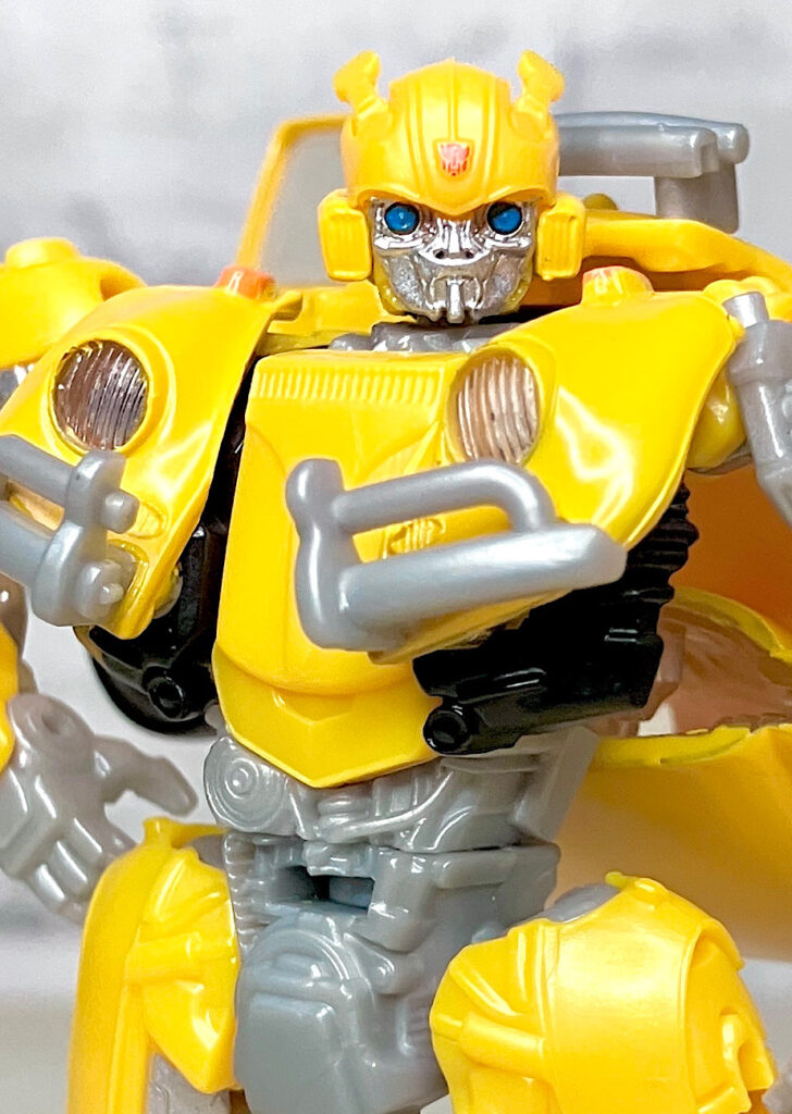 【アップ】頭部は色が少ないですが、丸っこくアレンジされたTF6版バンブルビーをよく再現できていると思います。バンブルビーの顔って下手すると気持ち悪くなっちゃうと思うんですが、ちゃんと可愛らしいですね。